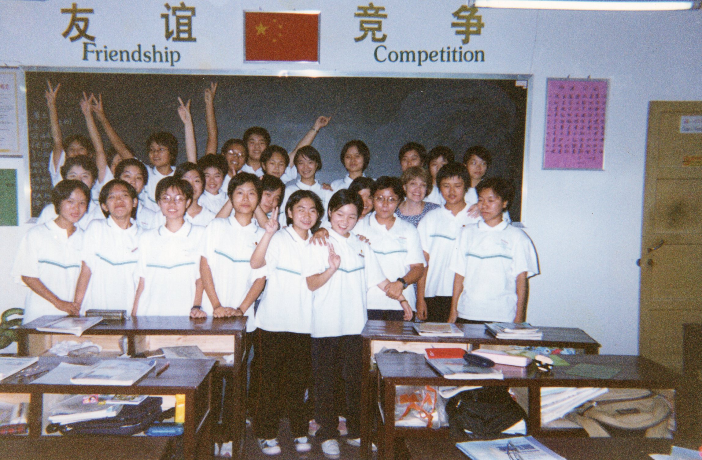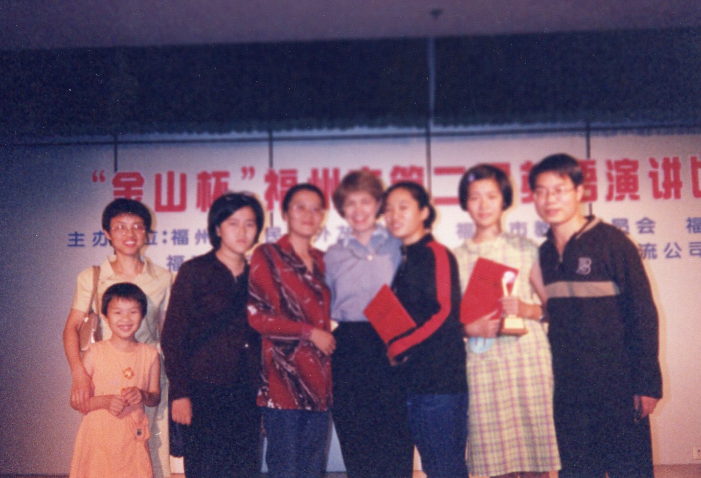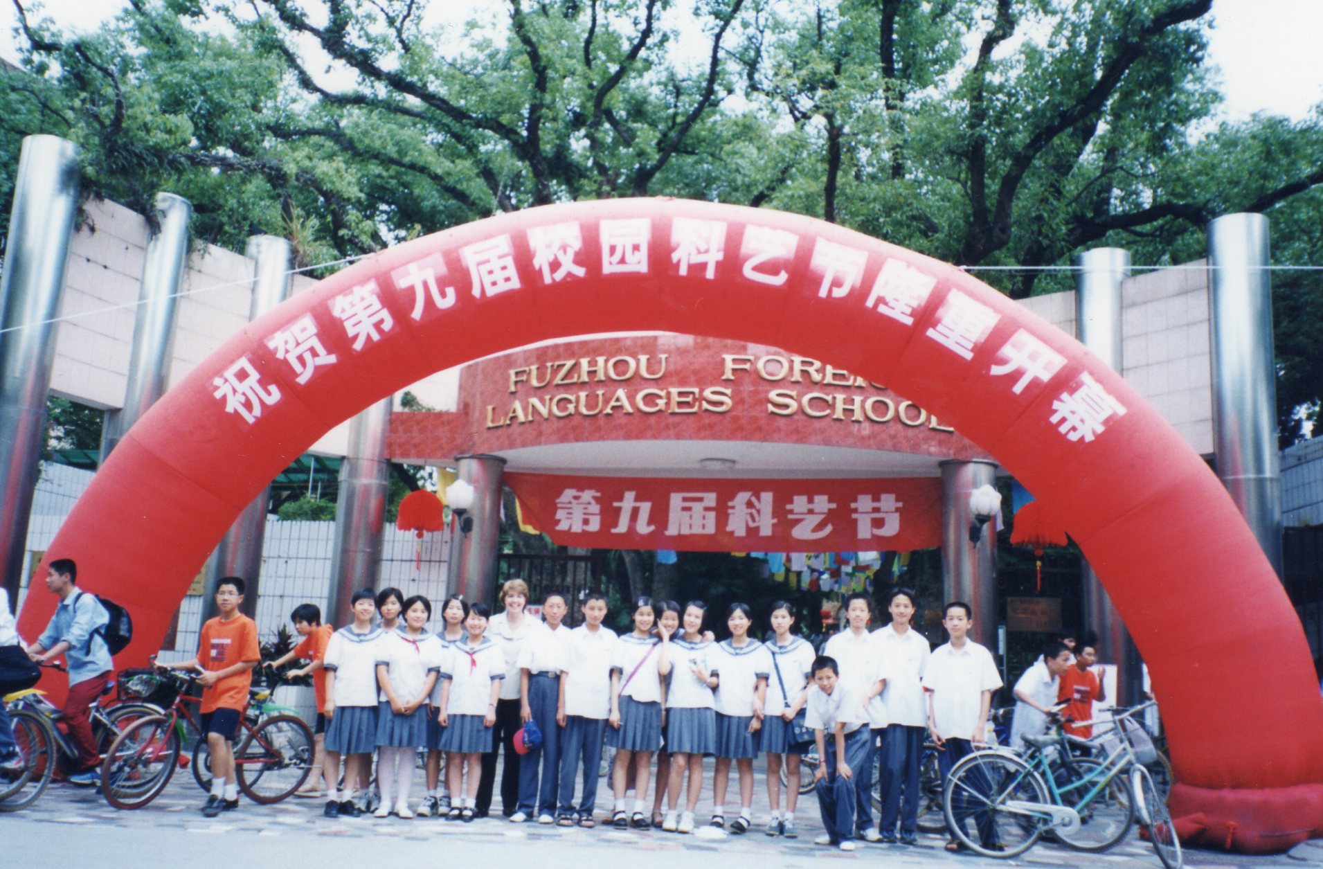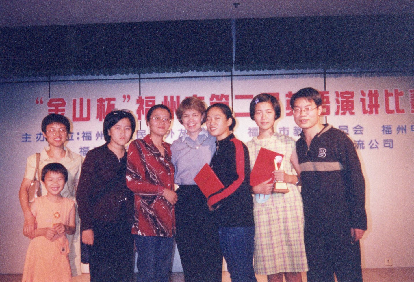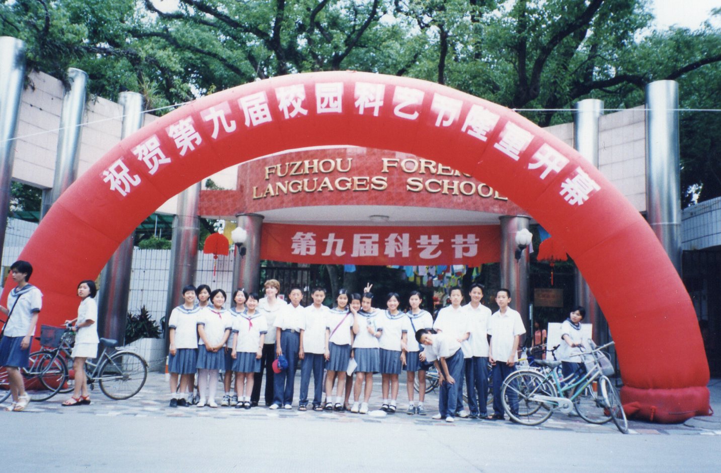 Photos from Jo Ann's time teaching at the Fuzhou Foreign Languages School in Fuzhou, China (2001–2002)—the school's first native English-speaking American teacher, known there as Miss Jones. The gallery includes the First Foreign Language Festival (December 2001), with Miss Fang's all-school celebration: songs, dances, and the O. Henry play The Policeman and the Anthem, performed by her spoken-English class at a packed local cinema.