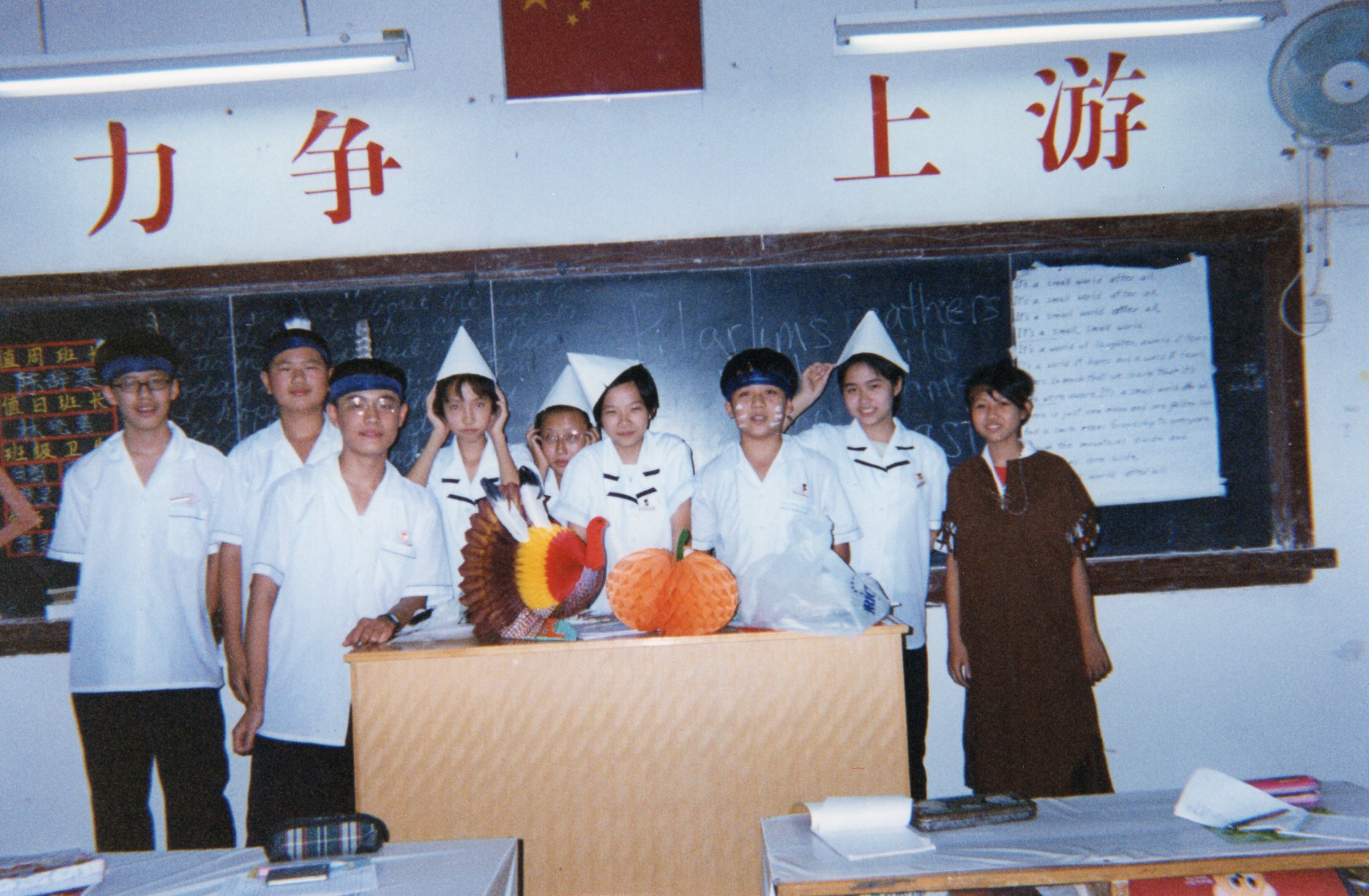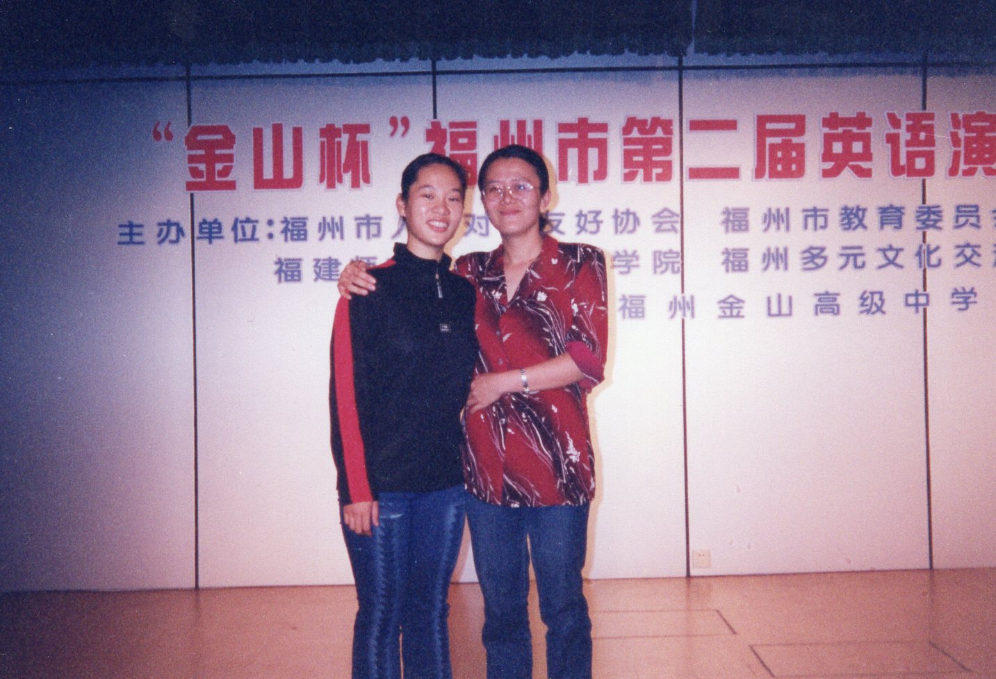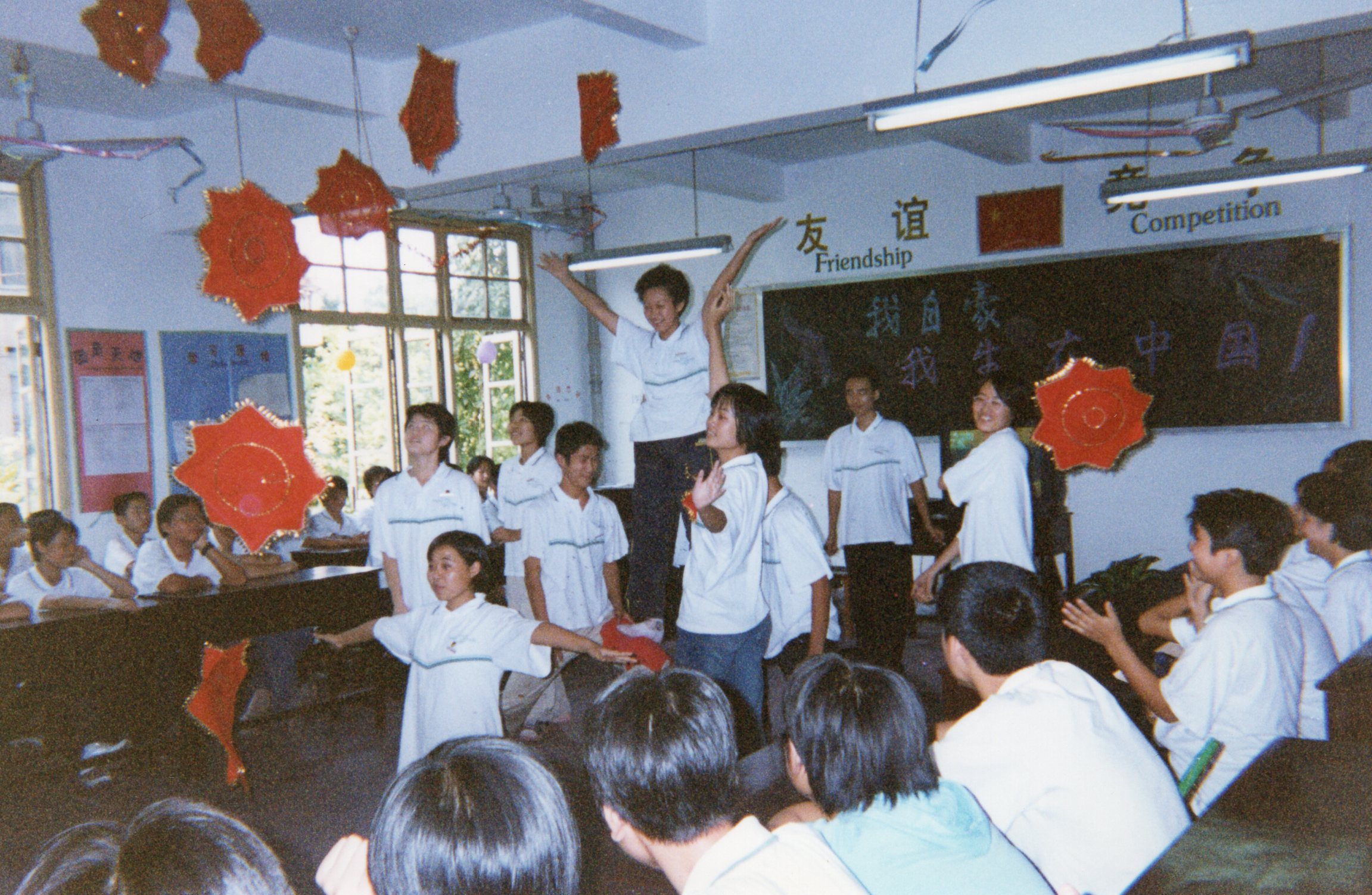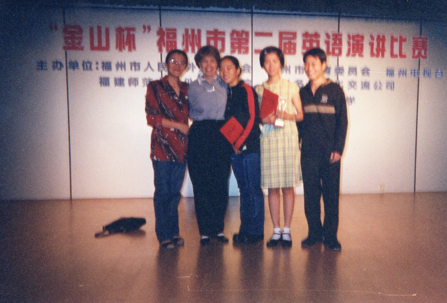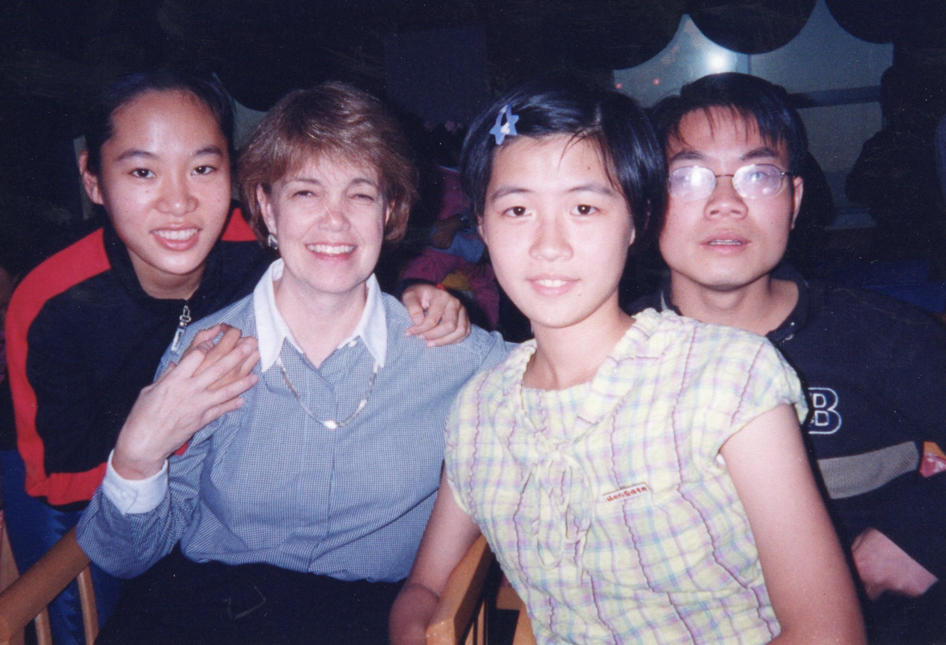 Photos from Jo Ann's time teaching at the Fuzhou Foreign Languages School in Fuzhou, China (2001–2002)—the school's first native English-speaking American teacher, known there as Miss Jones. The gallery includes the First Foreign Language Festival (December 2001), with Miss Fang's all-school celebration: songs, dances, and the O. Henry play The Policeman and the Anthem, performed by her spoken-English class at a packed local cinema.