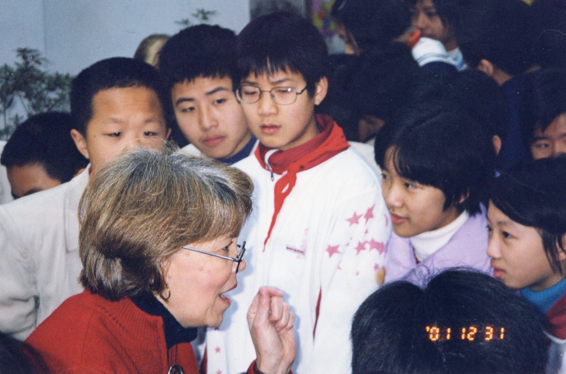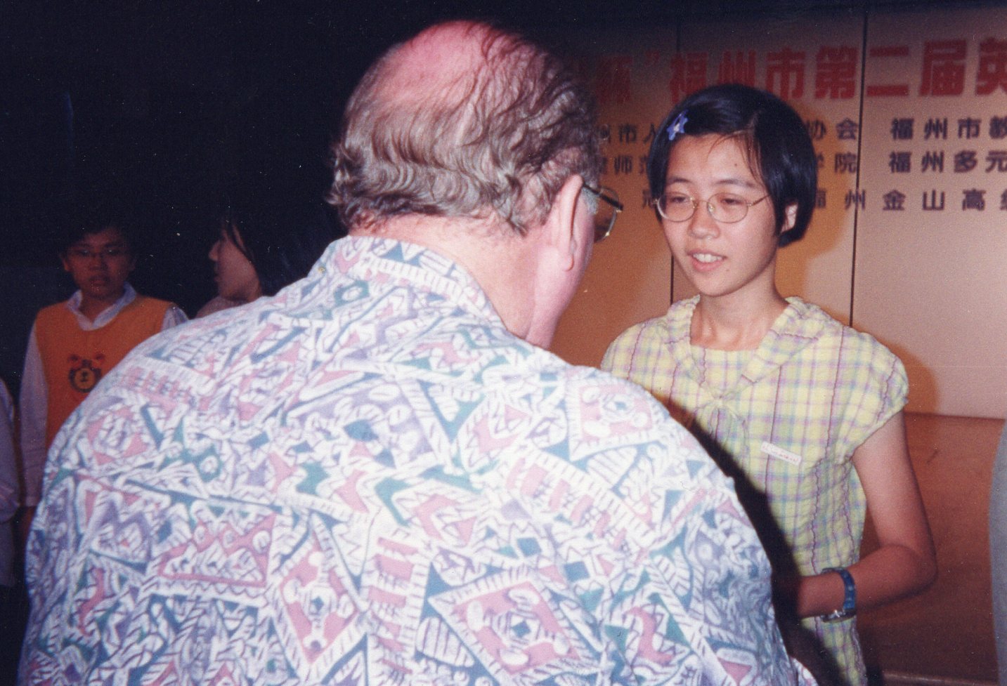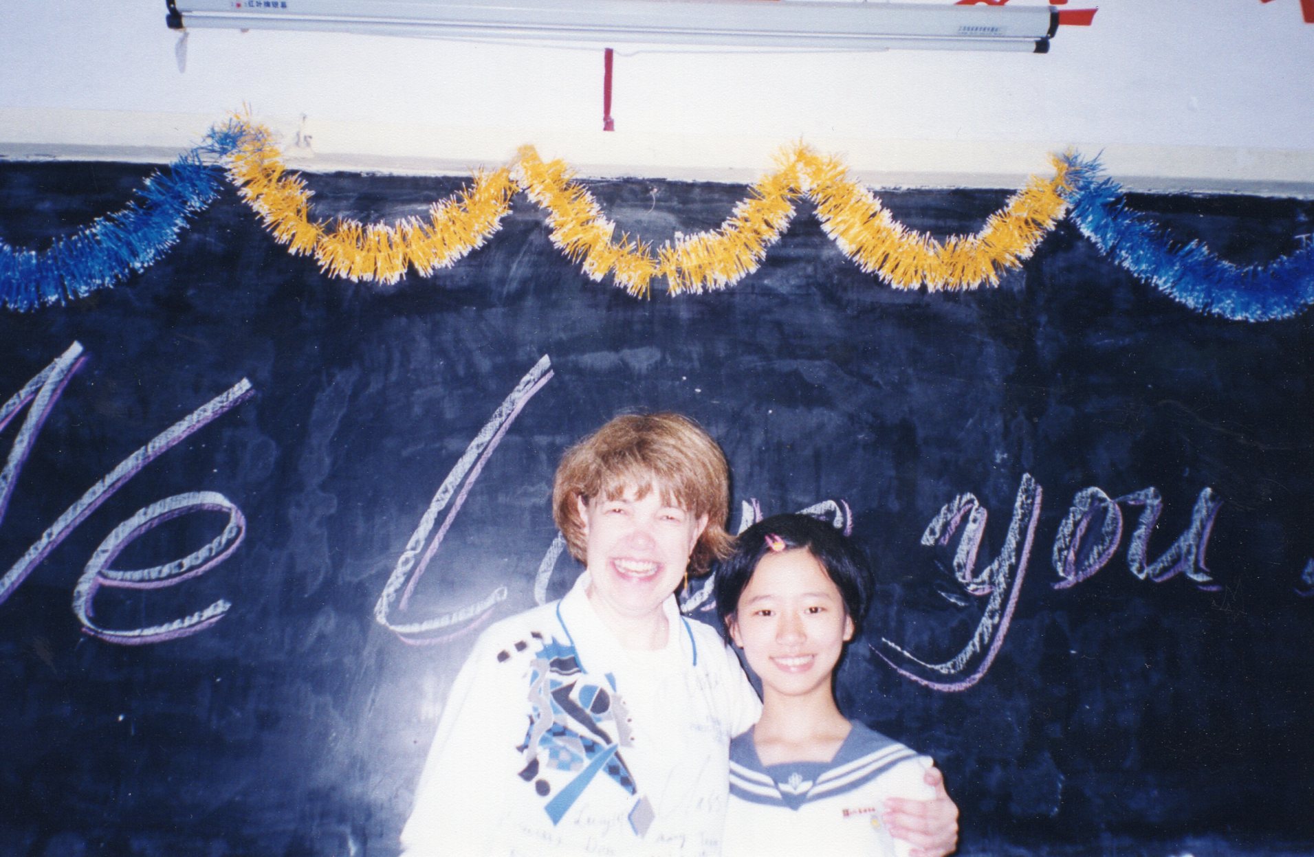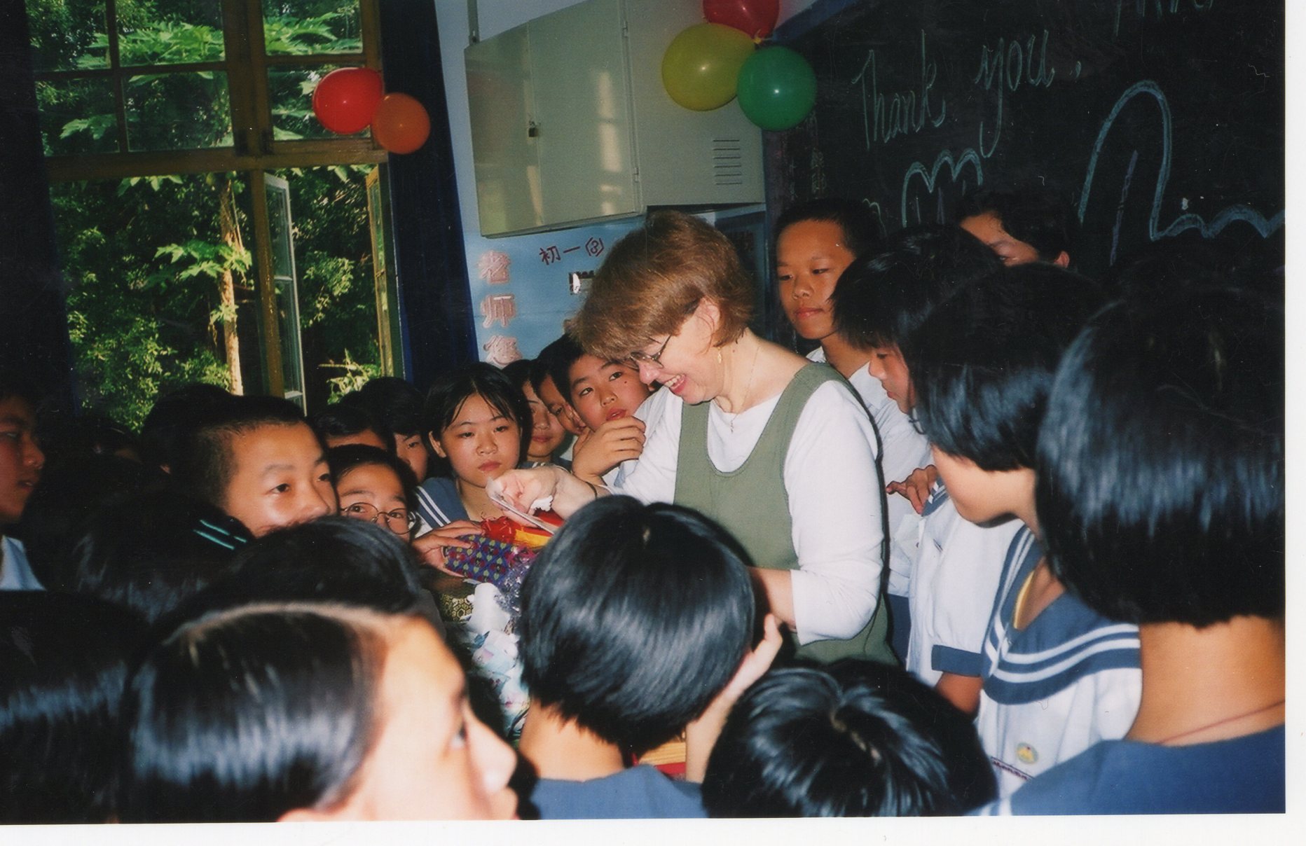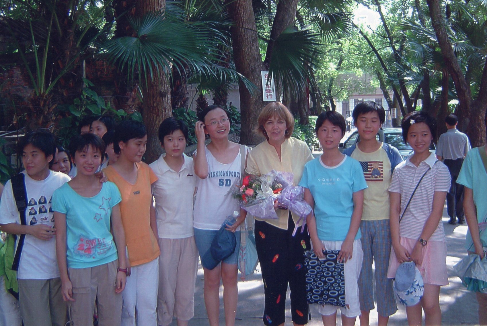 Photos from Jo Ann's time teaching at the Fuzhou Foreign Languages School in Fuzhou, China (2001–2002)—the school's first native English-speaking American teacher, known there as Miss Jones. The gallery includes the First Foreign Language Festival (December 2001), with Miss Fang's all-school celebration: songs, dances, and the O. Henry play The Policeman and the Anthem, performed by her spoken-English class at a packed local cinema.