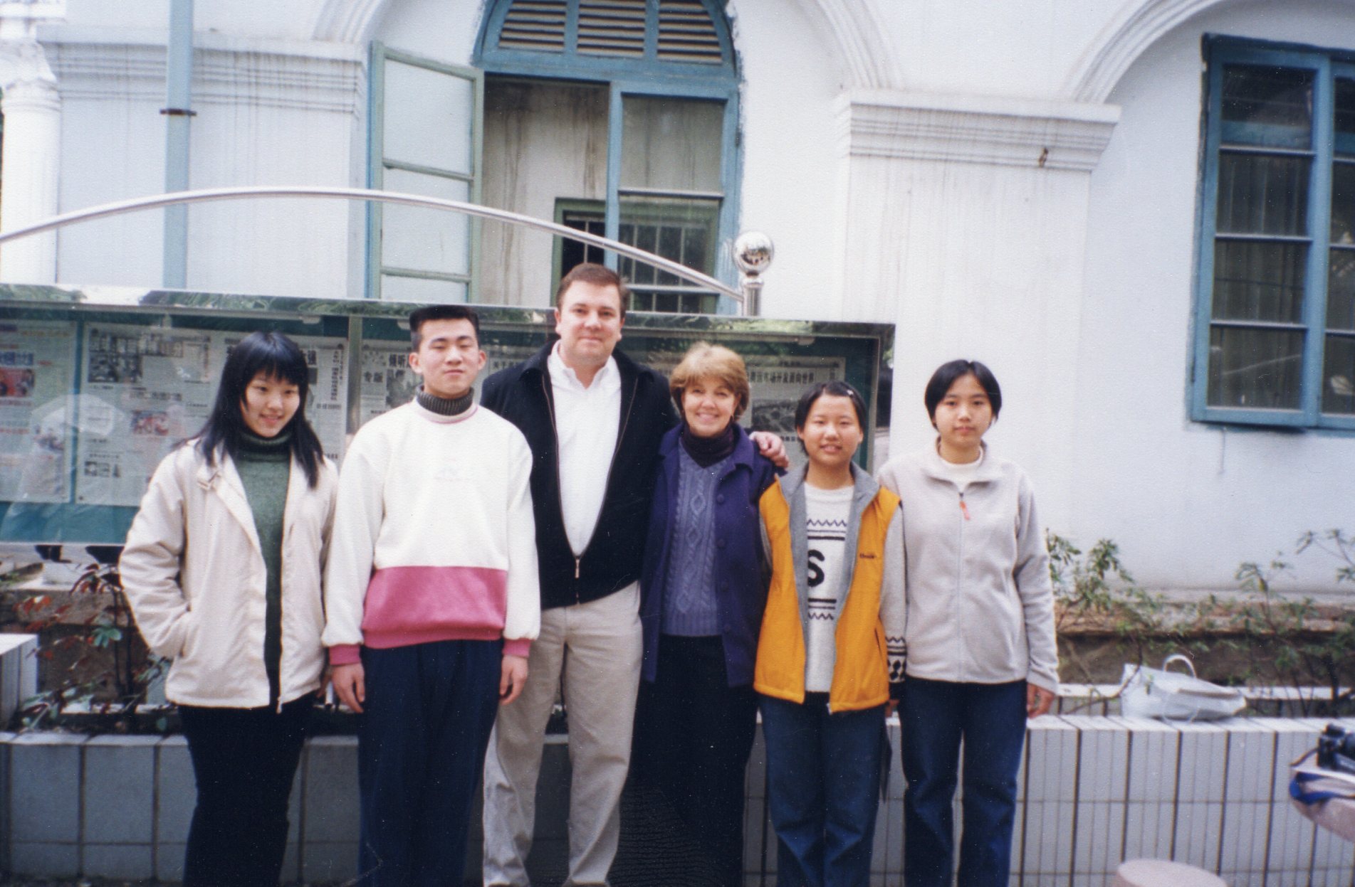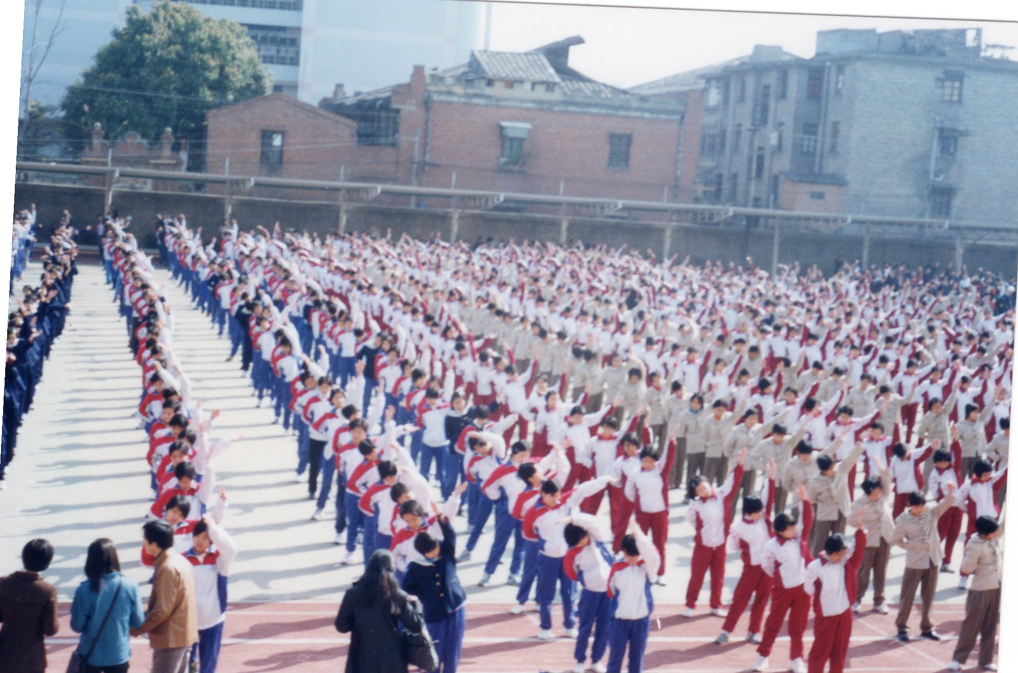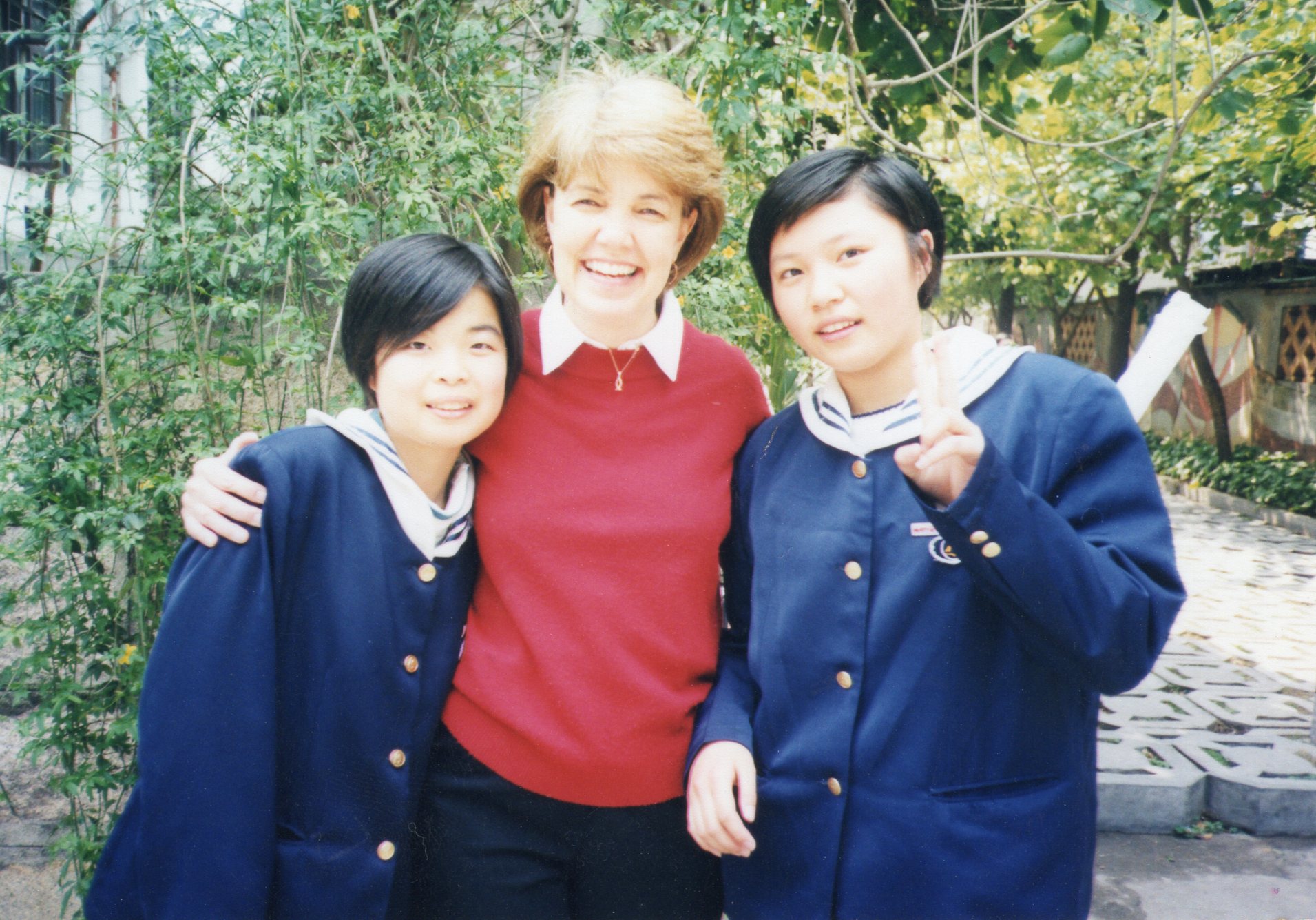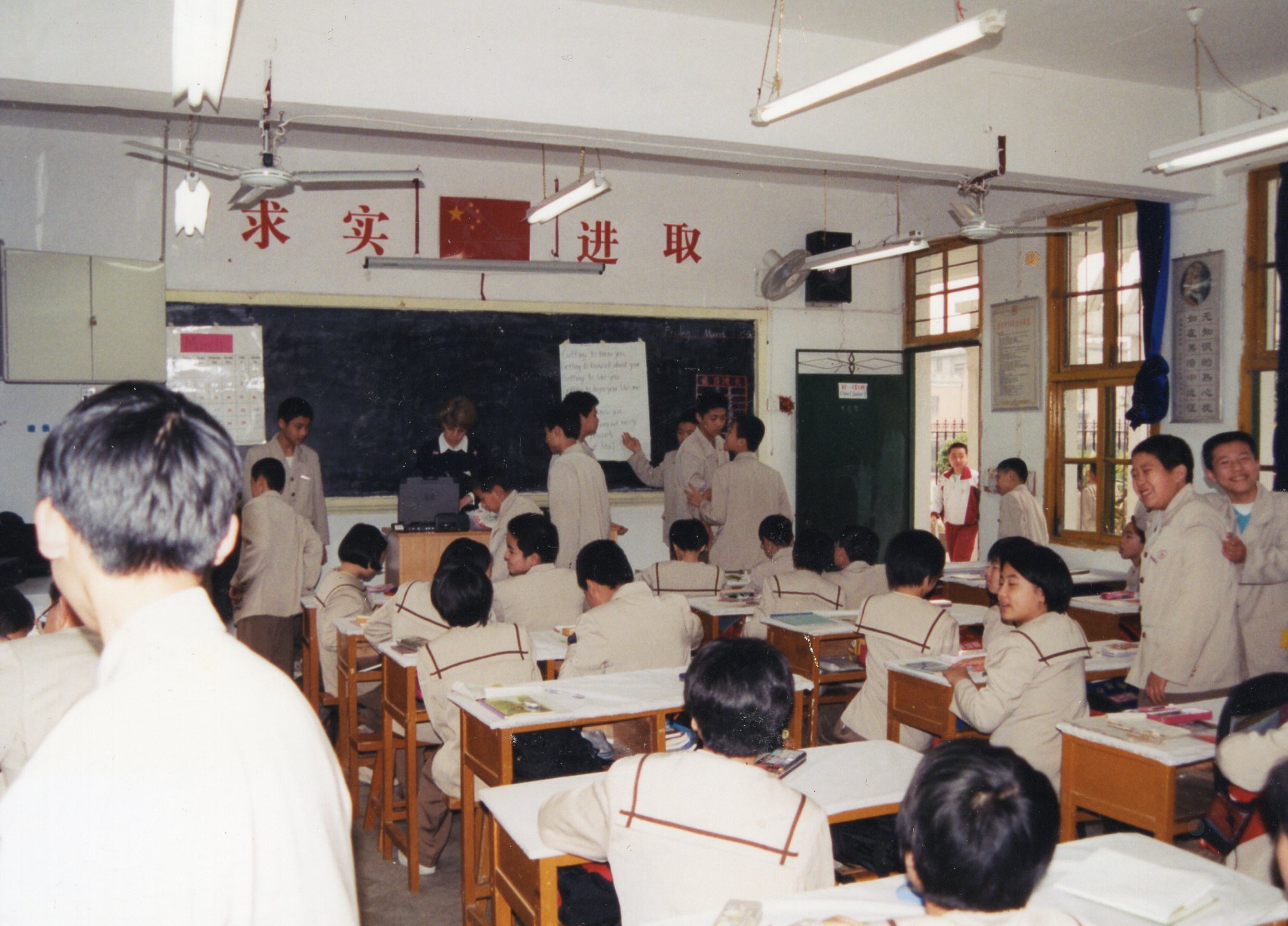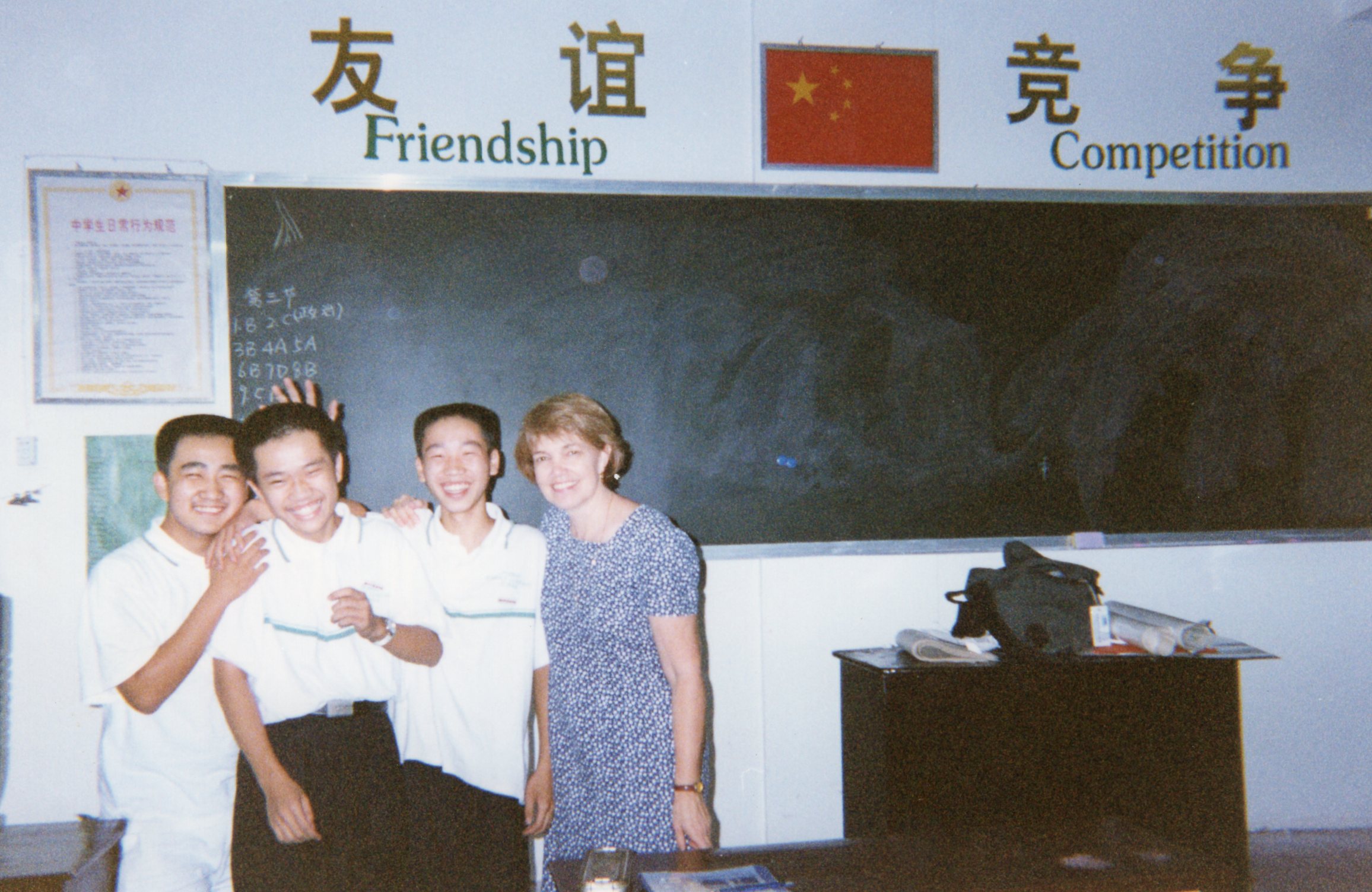 Photos from Jo Ann's time teaching at the Fuzhou Foreign Languages School in Fuzhou, China (2001–2002)—the school's first native English-speaking American teacher, known there as Miss Jones. The gallery includes the First Foreign Language Festival (December 2001), with Miss Fang's all-school celebration: songs, dances, and the O. Henry play The Policeman and the Anthem, performed by her spoken-English class at a packed local cinema.