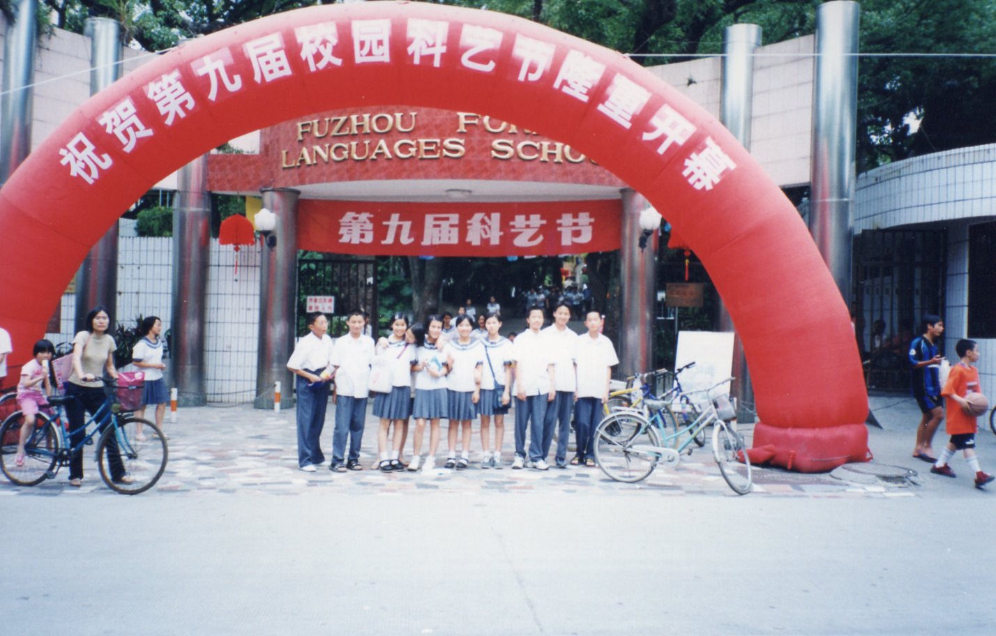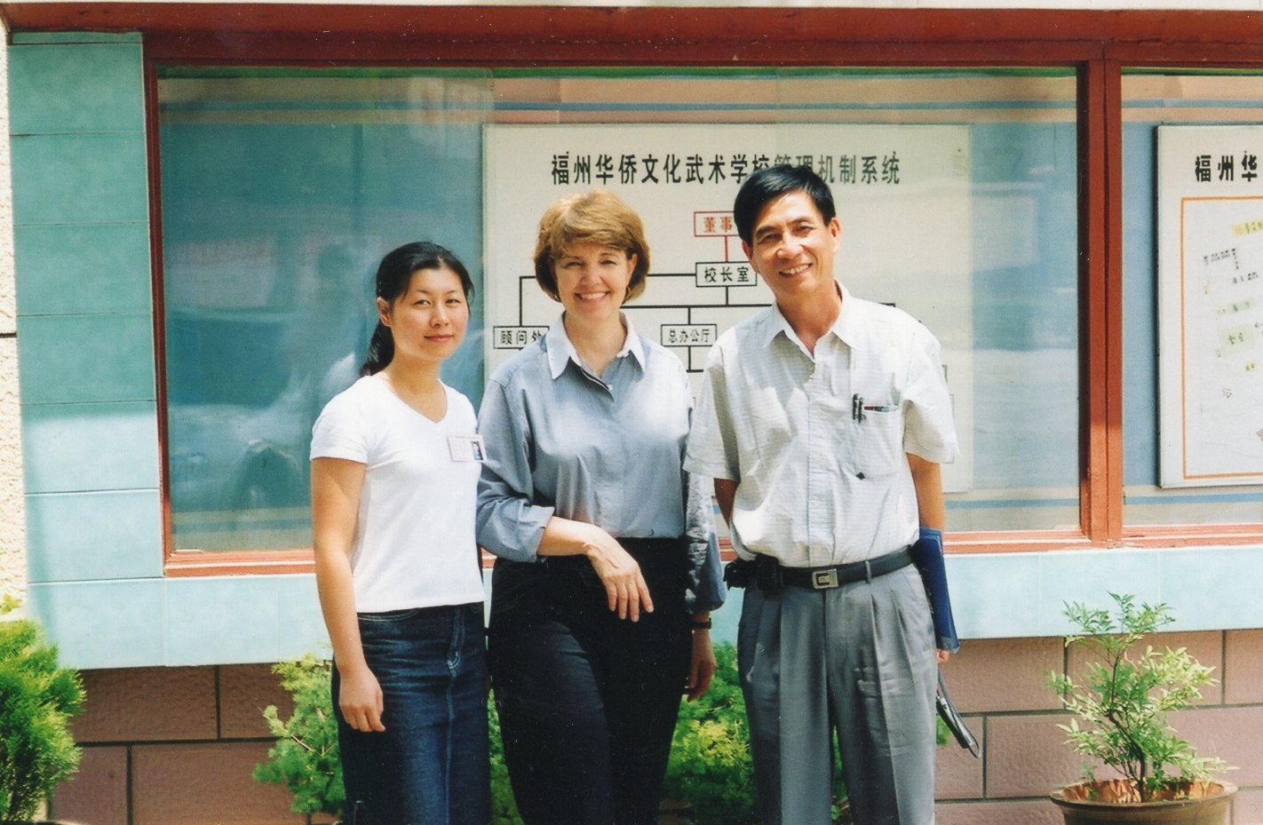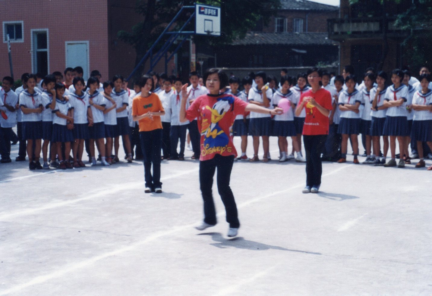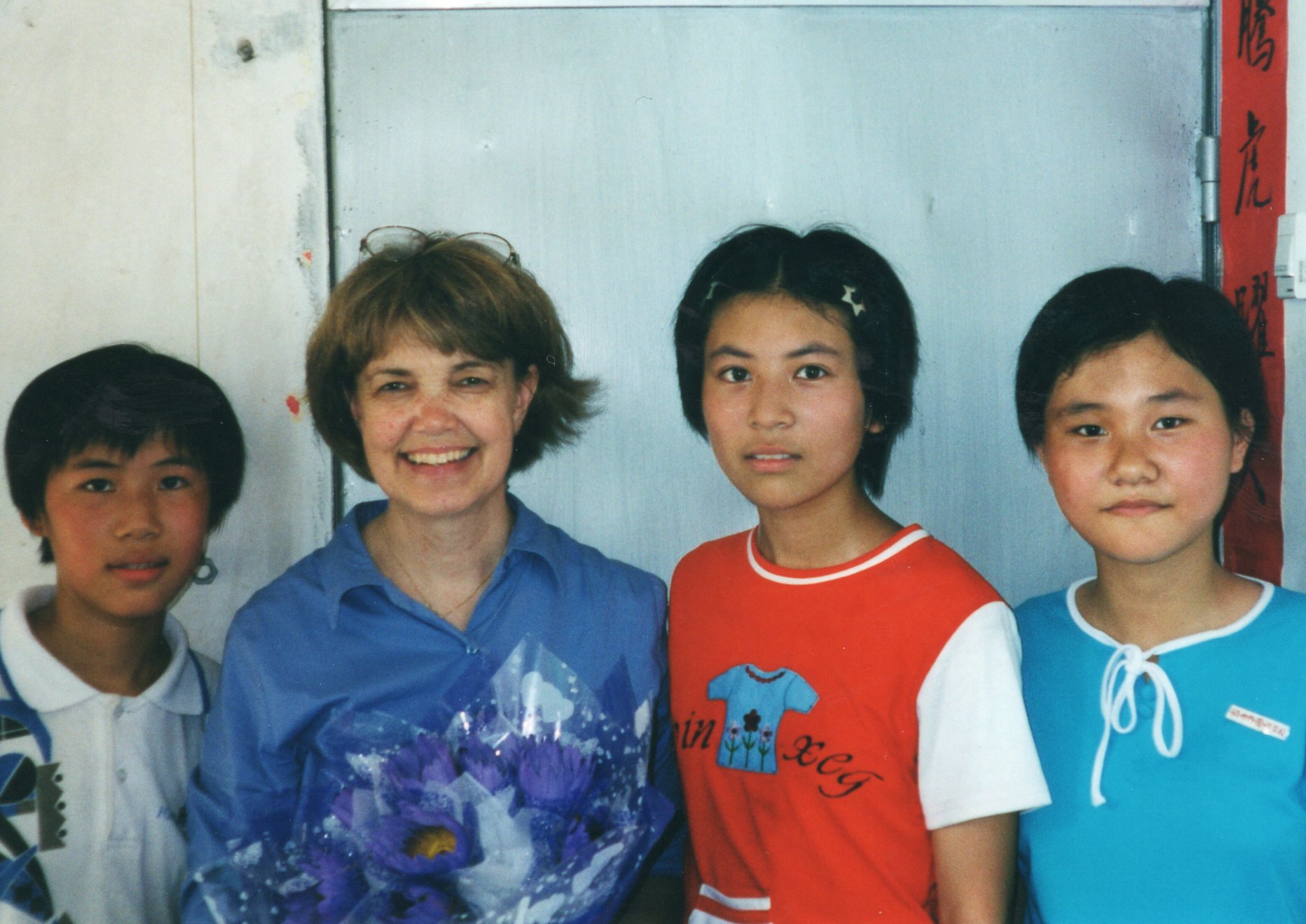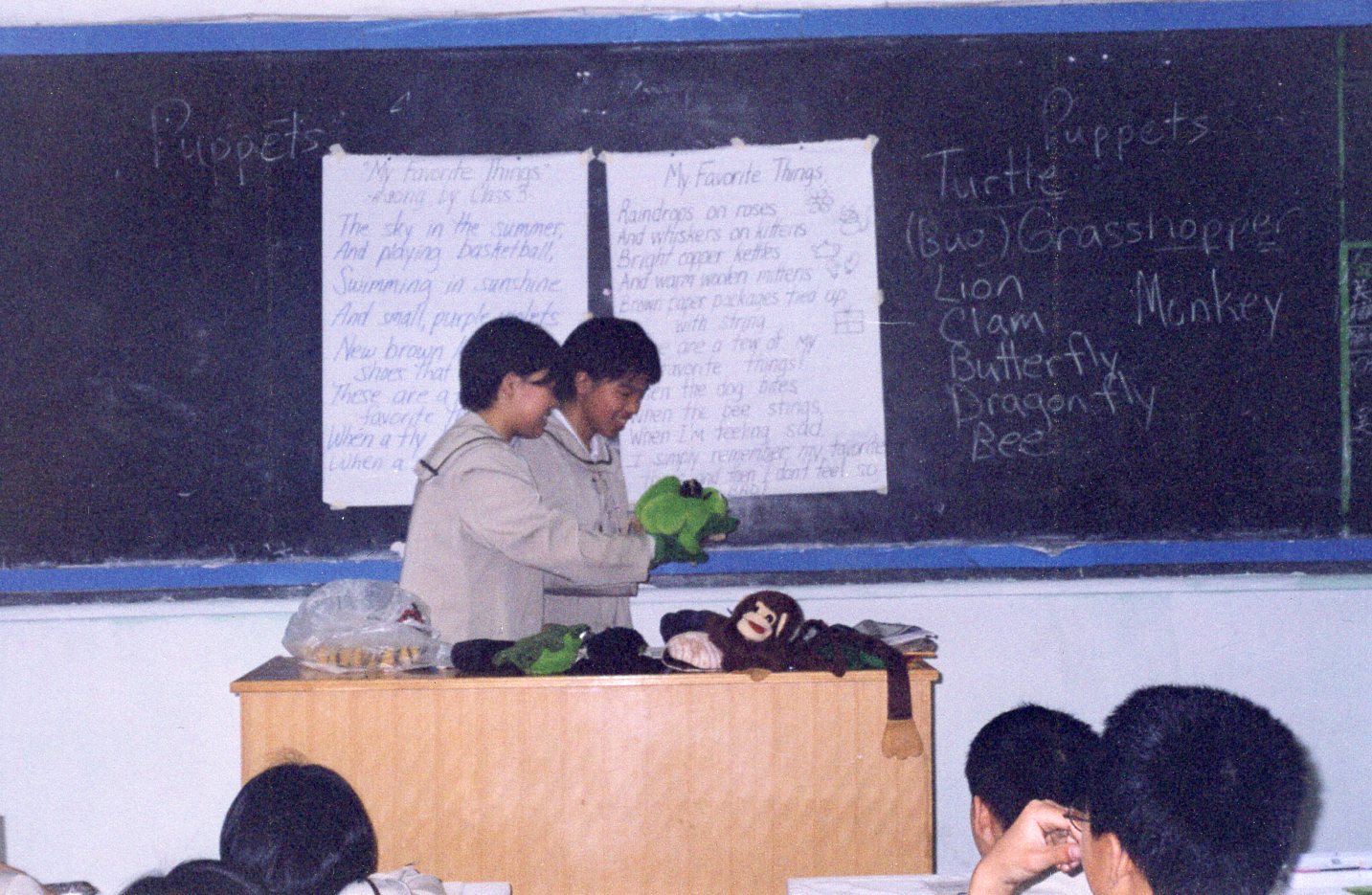 Photos from Jo Ann's time teaching at the Fuzhou Foreign Languages School in Fuzhou, China (2001–2002)—the school's first native English-speaking American teacher, known there as Miss Jones. The gallery includes the First Foreign Language Festival (December 2001), with Miss Fang's all-school celebration: songs, dances, and the O. Henry play The Policeman and the Anthem, performed by her spoken-English class at a packed local cinema.