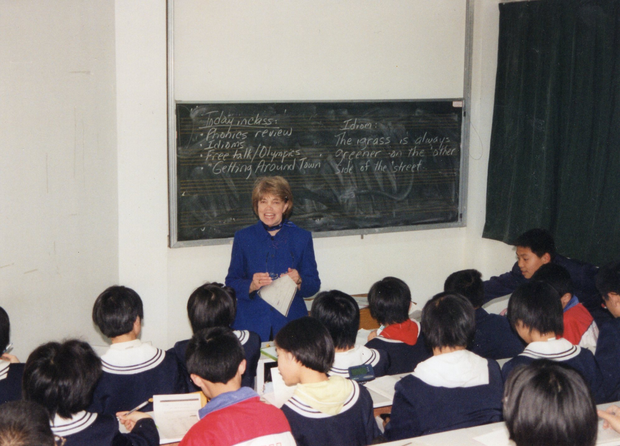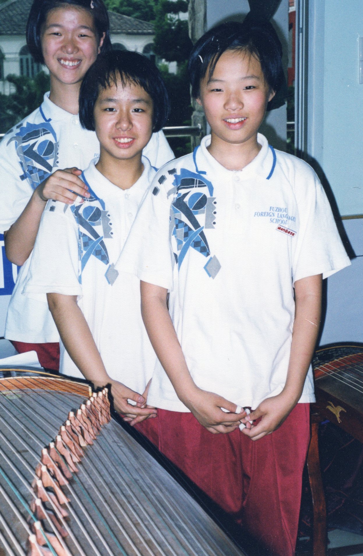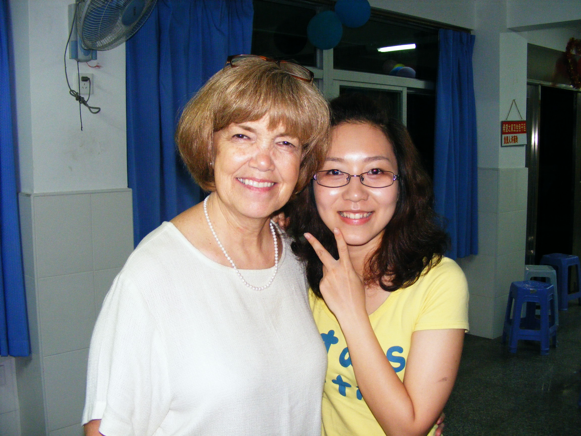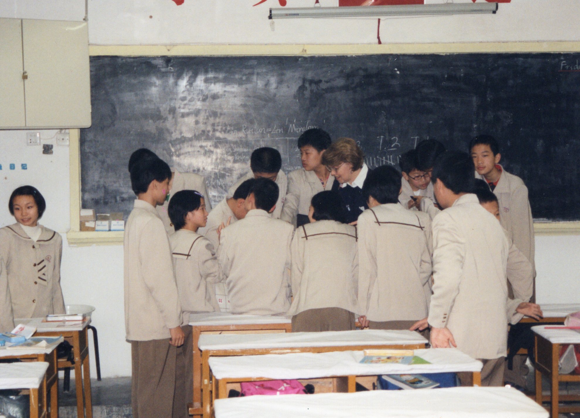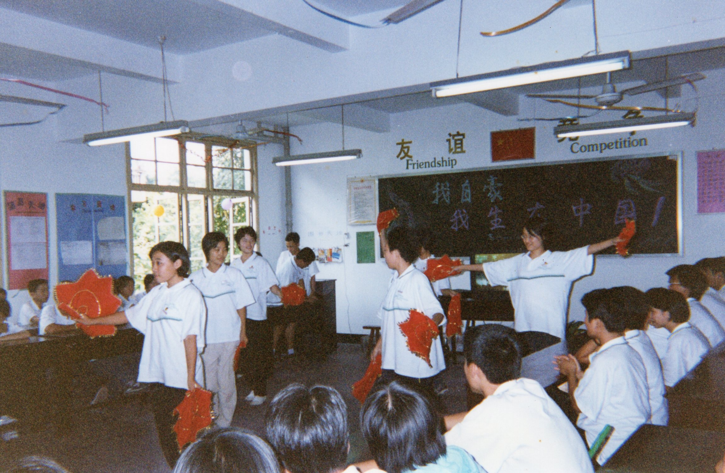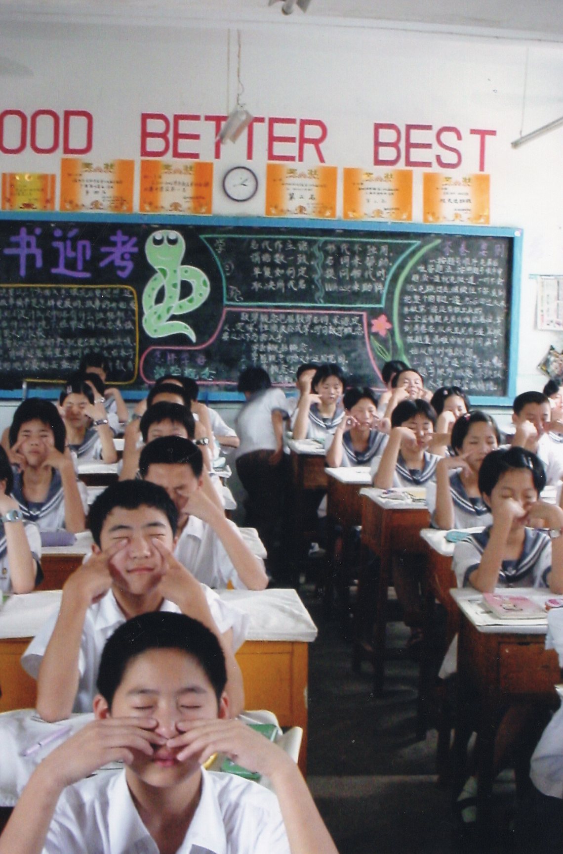 Photos from Jo Ann's time teaching at the Fuzhou Foreign Languages School in Fuzhou, China (2001–2002)—the school's first native English-speaking American teacher, known there as Miss Jones. The gallery includes the First Foreign Language Festival (December 2001), with Miss Fang's all-school celebration: songs, dances, and the O. Henry play The Policeman and the Anthem, performed by her spoken-English class at a packed local cinema.