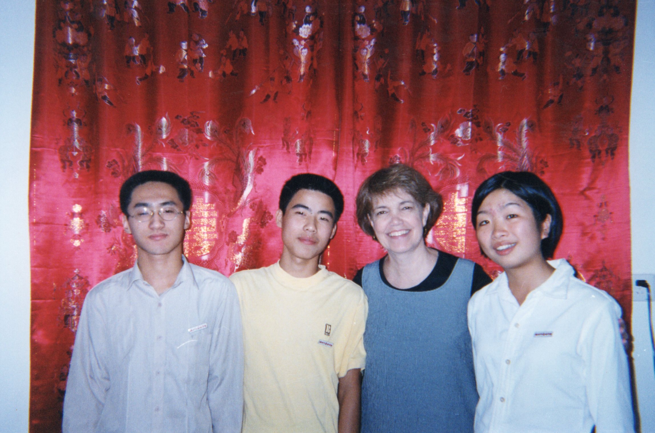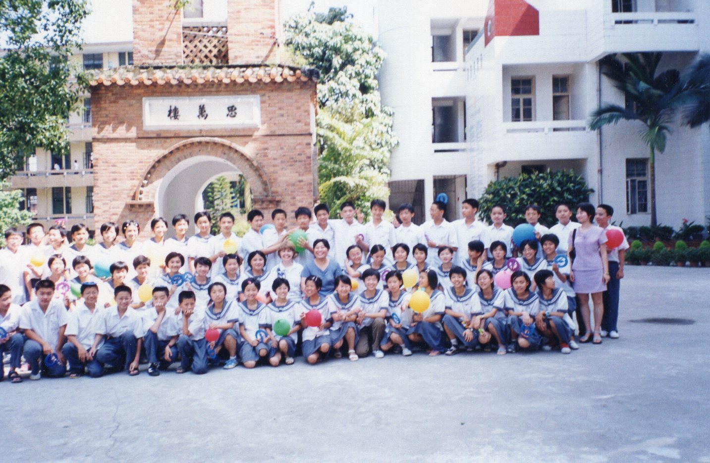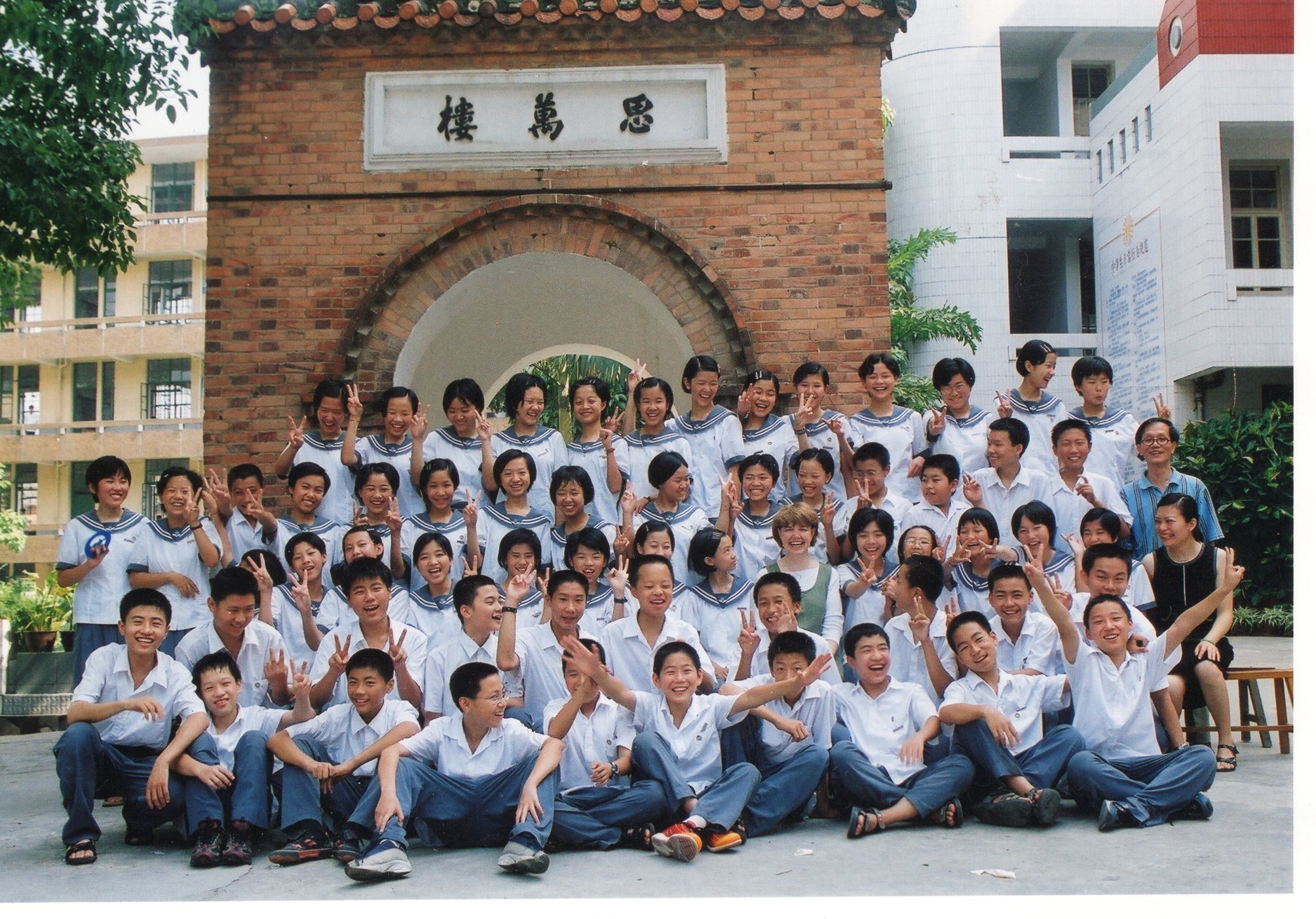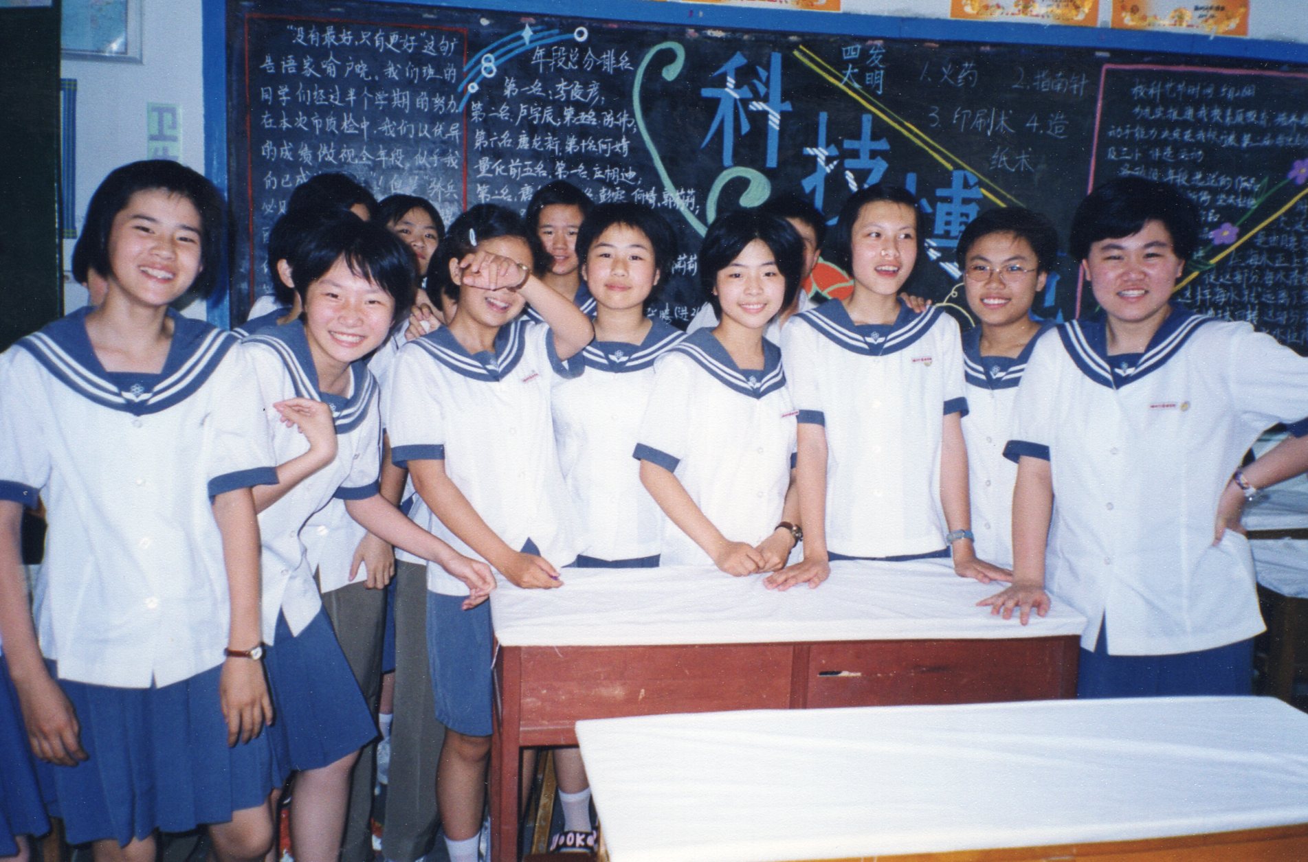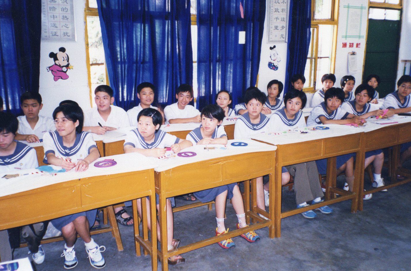 Photos from Jo Ann's time teaching at the Fuzhou Foreign Languages School in Fuzhou, China (2001–2002)—the school's first native English-speaking American teacher, known there as Miss Jones. The gallery includes the First Foreign Language Festival (December 2001), with Miss Fang's all-school celebration: songs, dances, and the O. Henry play The Policeman and the Anthem, performed by her spoken-English class at a packed local cinema.