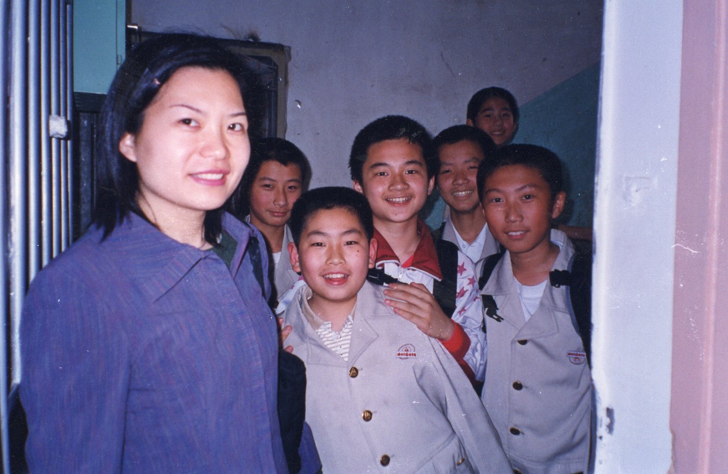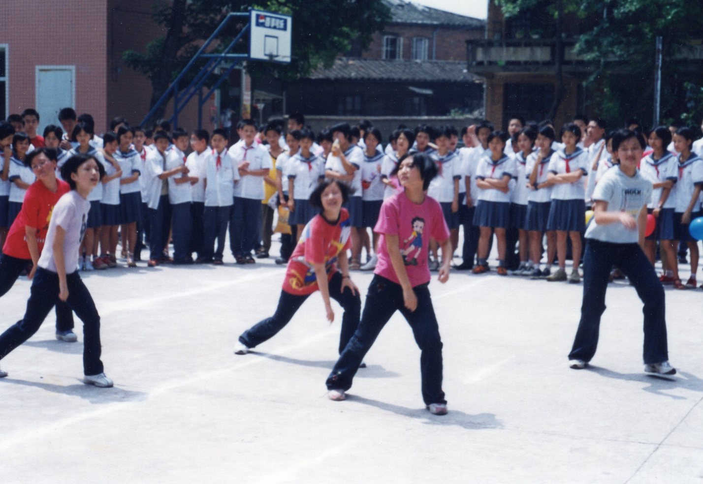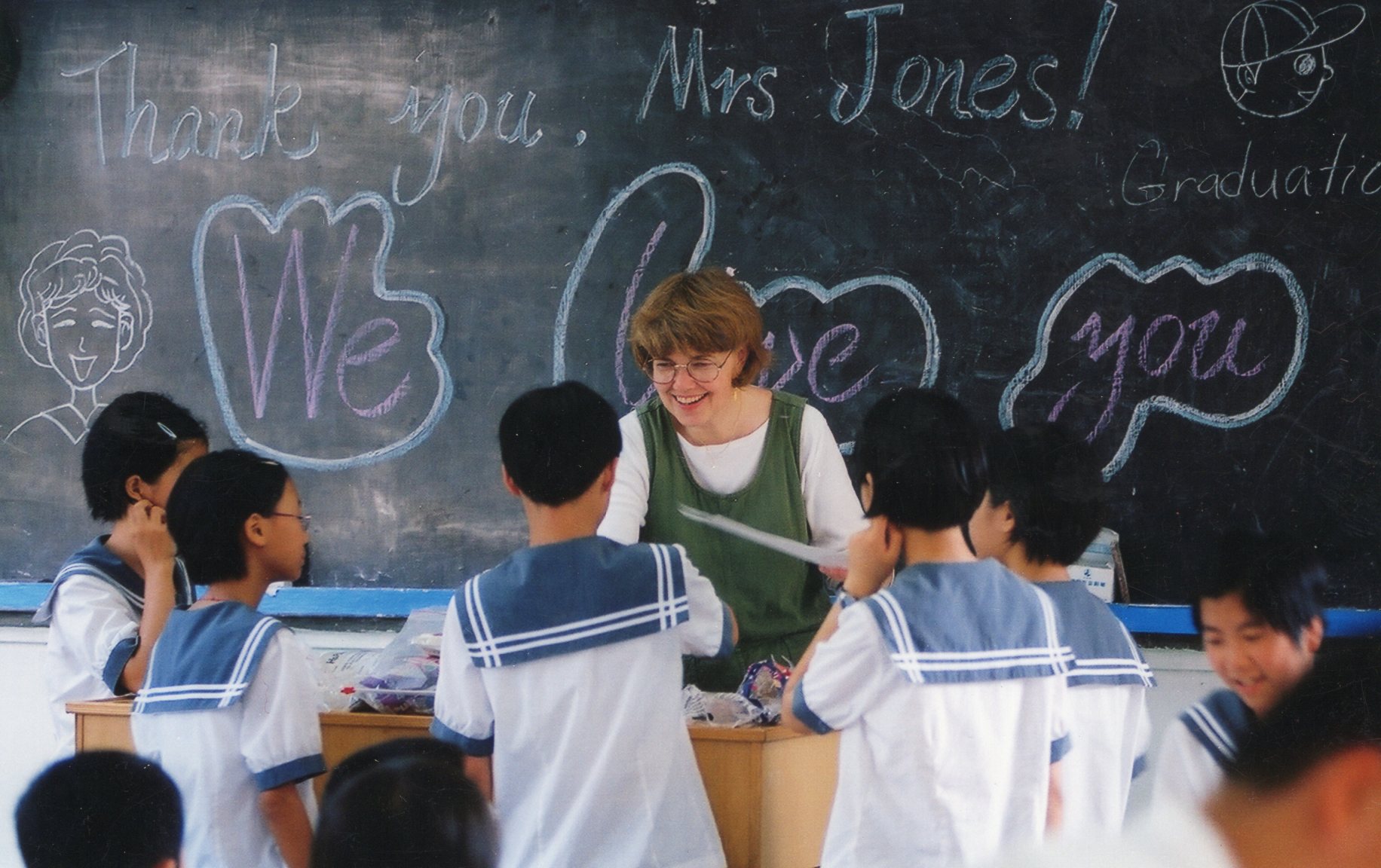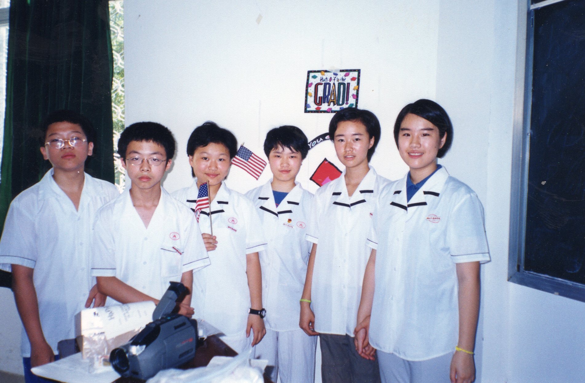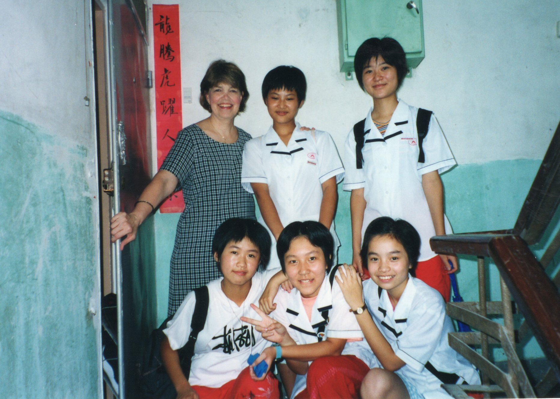 Photos from Jo Ann's time teaching at the Fuzhou Foreign Languages School in Fuzhou, China (2001–2002)—the school's first native English-speaking American teacher, known there as Miss Jones. The gallery includes the First Foreign Language Festival (December 2001), with Miss Fang's all-school celebration: songs, dances, and the O. Henry play The Policeman and the Anthem, performed by her spoken-English class at a packed local cinema.