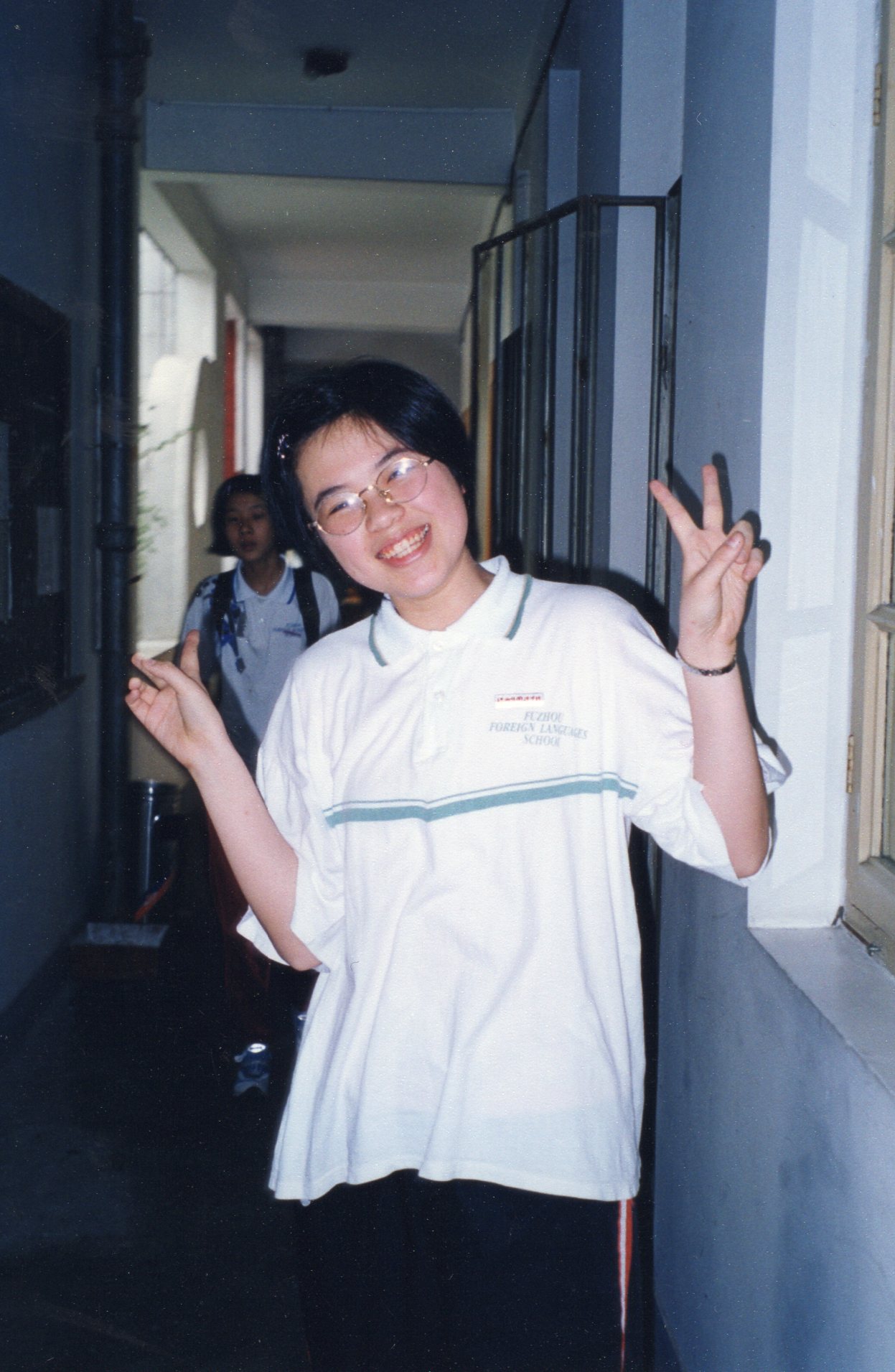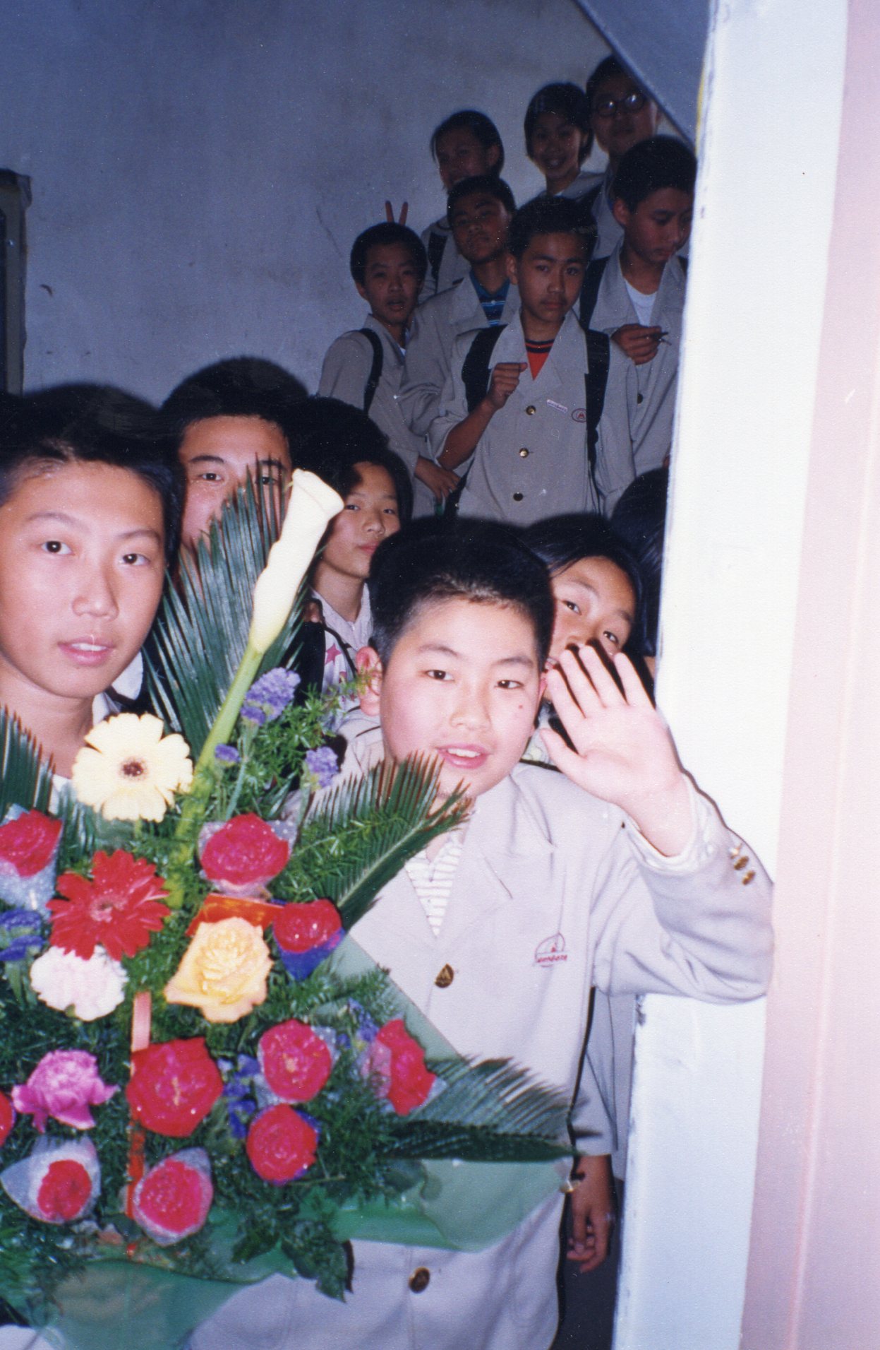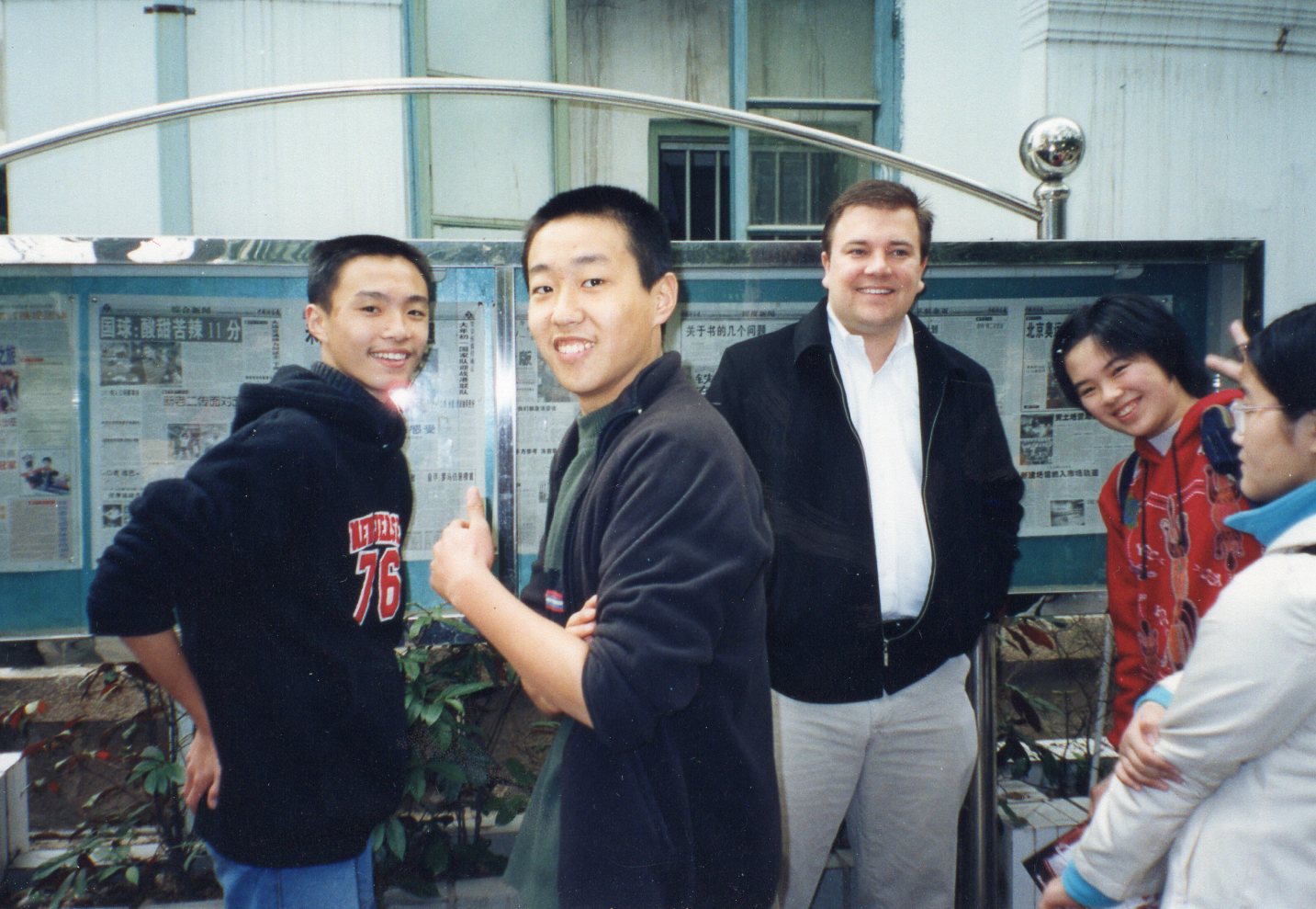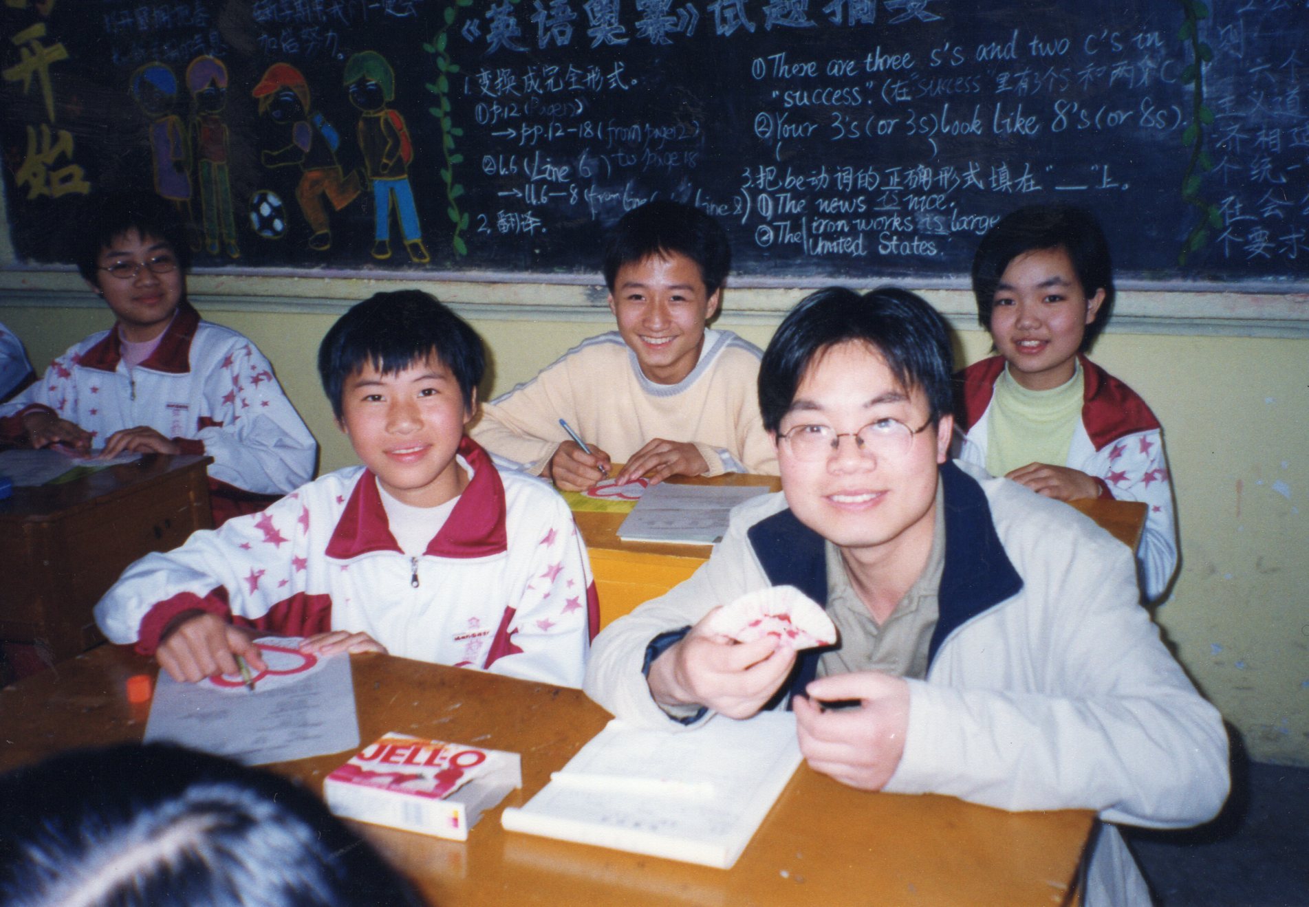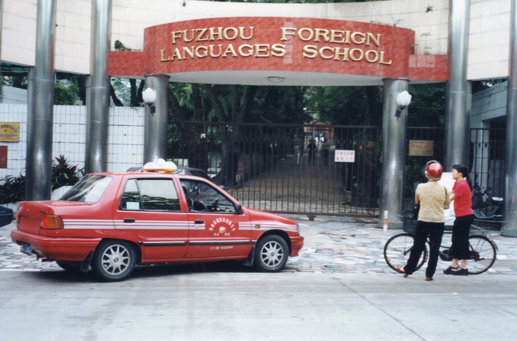 Photos from Jo Ann's time teaching at the Fuzhou Foreign Languages School in Fuzhou, China (2001–2002)—the school's first native English-speaking American teacher, known there as Miss Jones. The gallery includes the First Foreign Language Festival (December 2001), with Miss Fang's all-school celebration: songs, dances, and the O. Henry play The Policeman and the Anthem, performed by her spoken-English class at a packed local cinema.