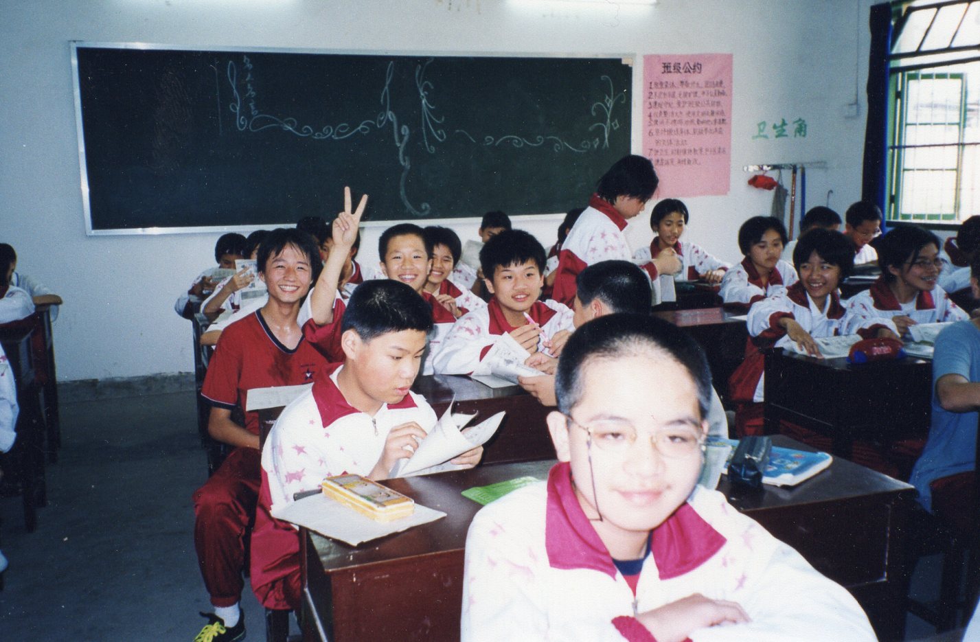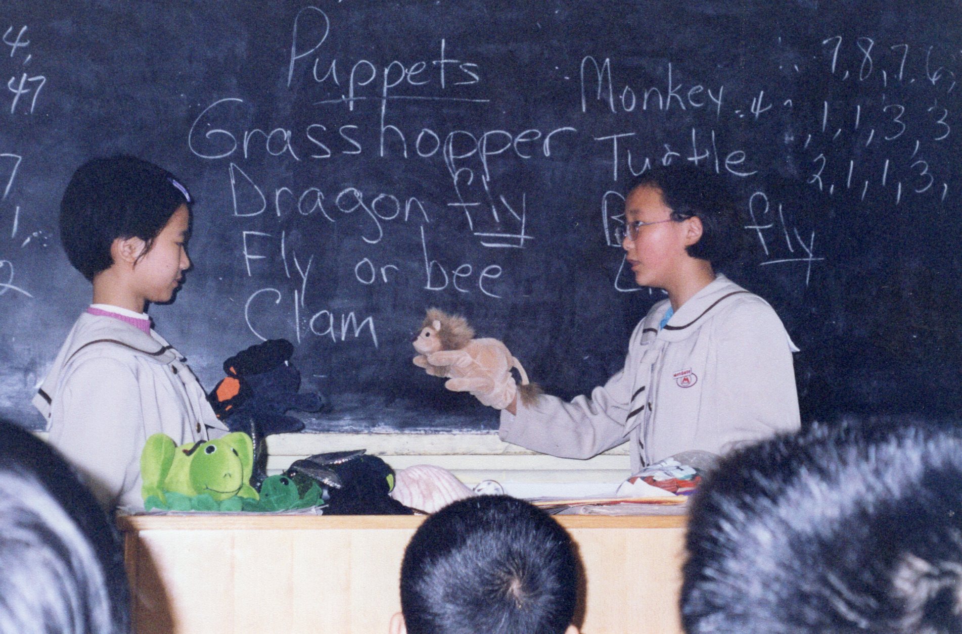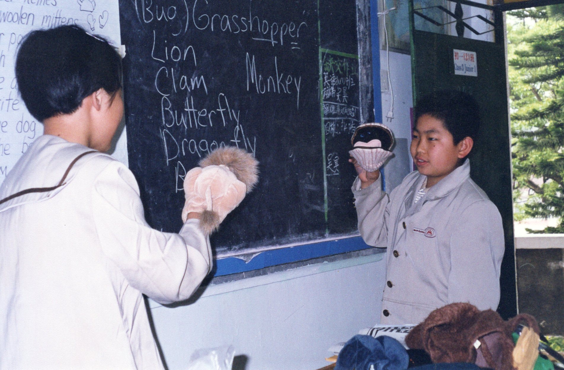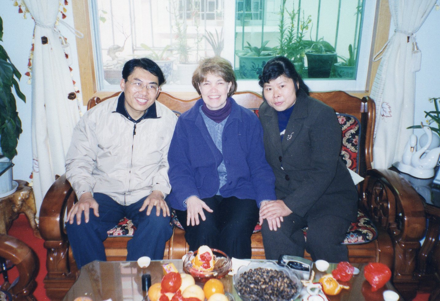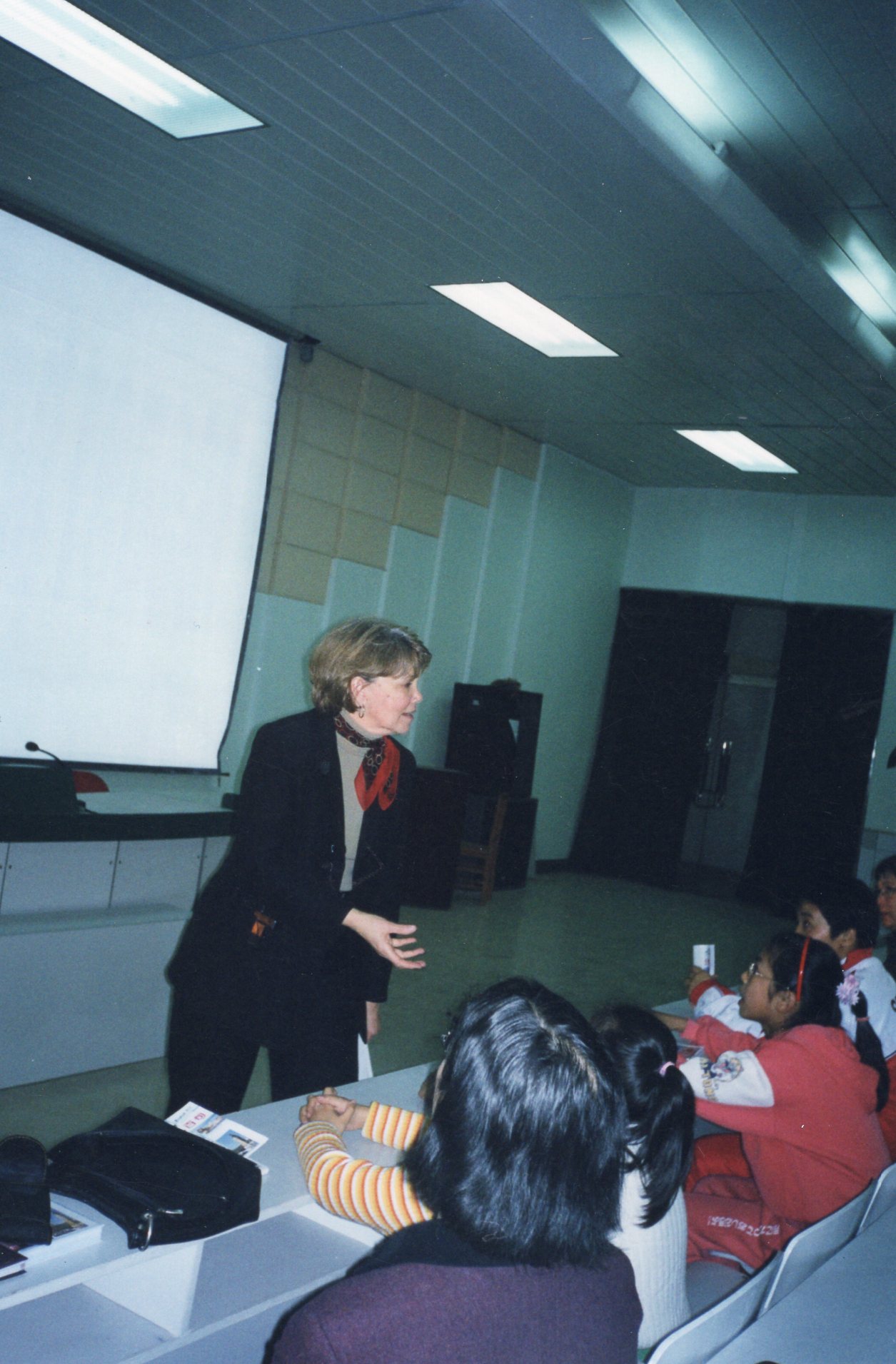 Photos from Jo Ann's time teaching at the Fuzhou Foreign Languages School in Fuzhou, China (2001–2002)—the school's first native English-speaking American teacher, known there as Miss Jones. The gallery includes the First Foreign Language Festival (December 2001), with Miss Fang's all-school celebration: songs, dances, and the O. Henry play The Policeman and the Anthem, performed by her spoken-English class at a packed local cinema.