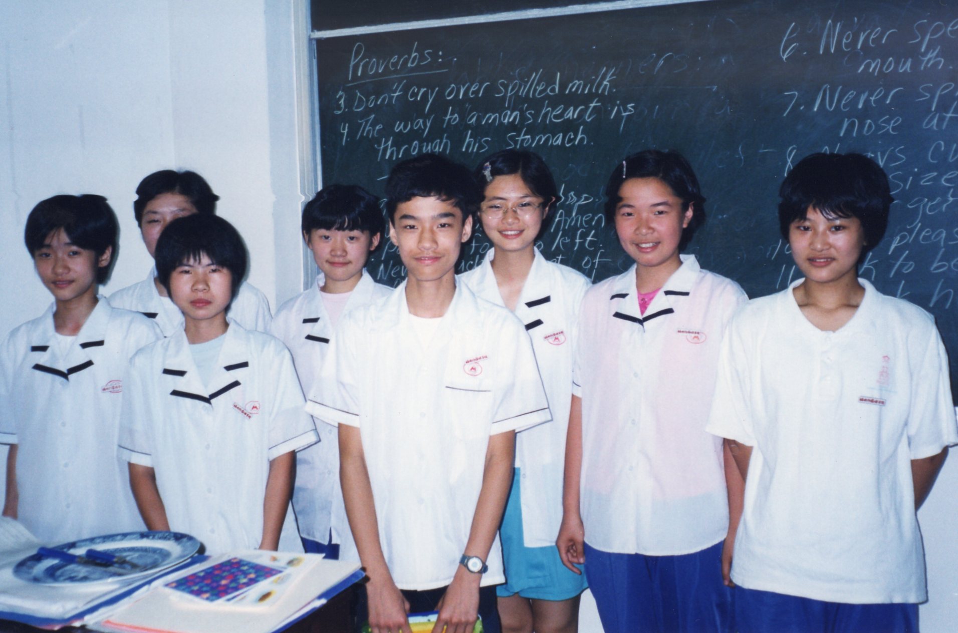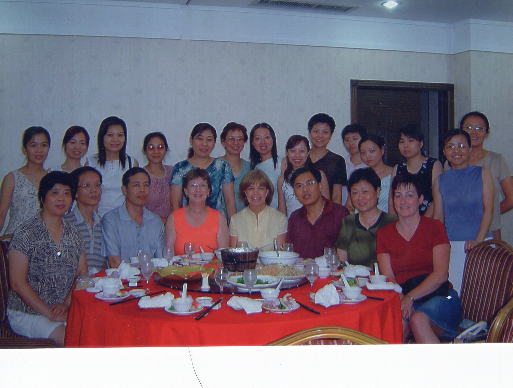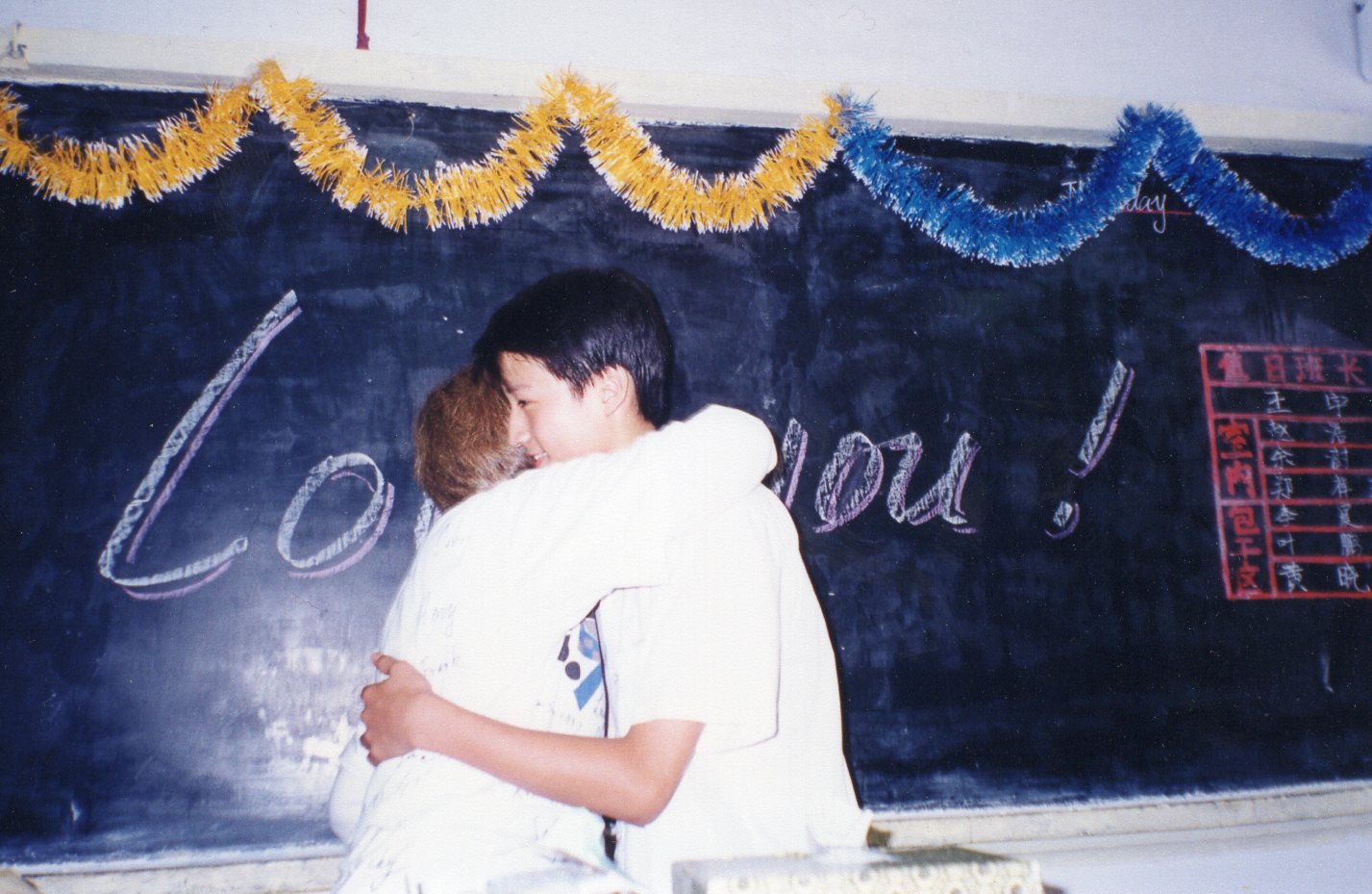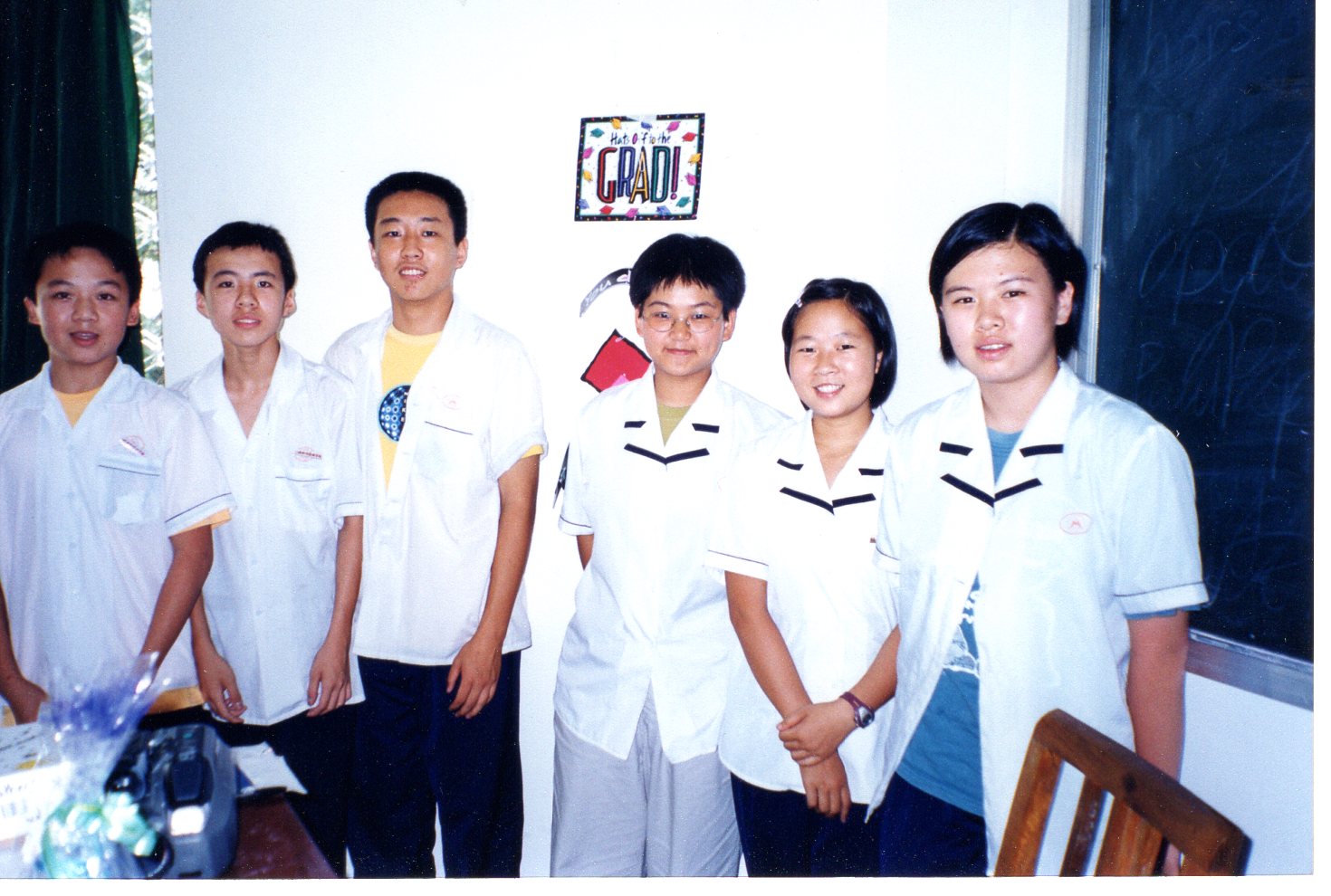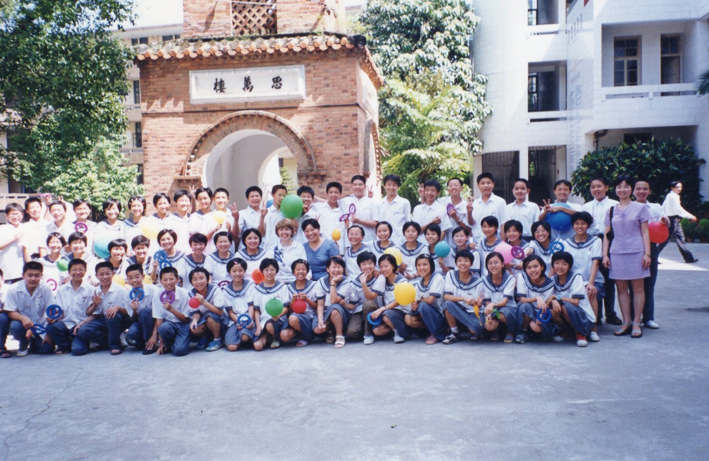 Photos from Jo Ann's time teaching at the Fuzhou Foreign Languages School in Fuzhou, China (2001–2002)—the school's first native English-speaking American teacher, known there as Miss Jones. The gallery includes the First Foreign Language Festival (December 2001), with Miss Fang's all-school celebration: songs, dances, and the O. Henry play The Policeman and the Anthem, performed by her spoken-English class at a packed local cinema.
