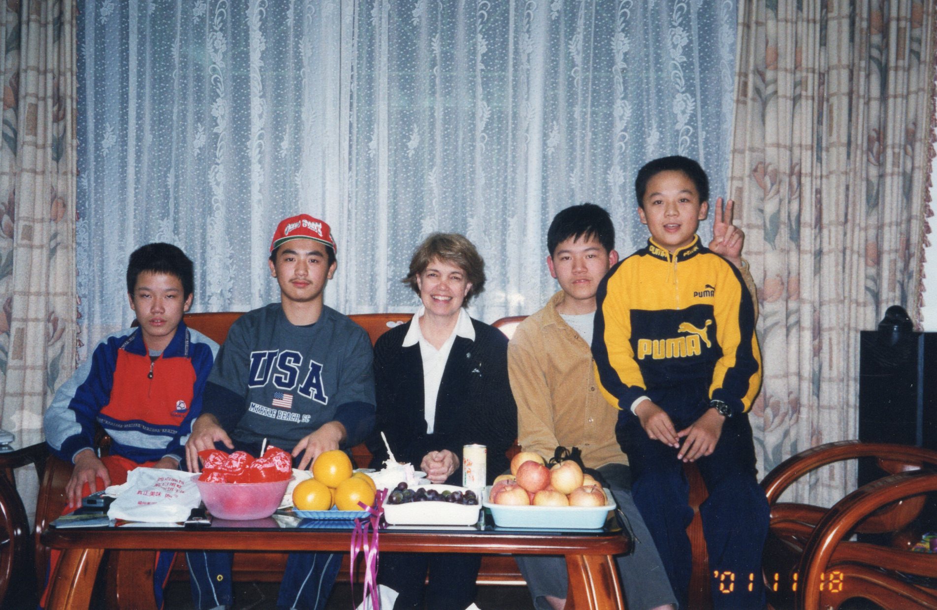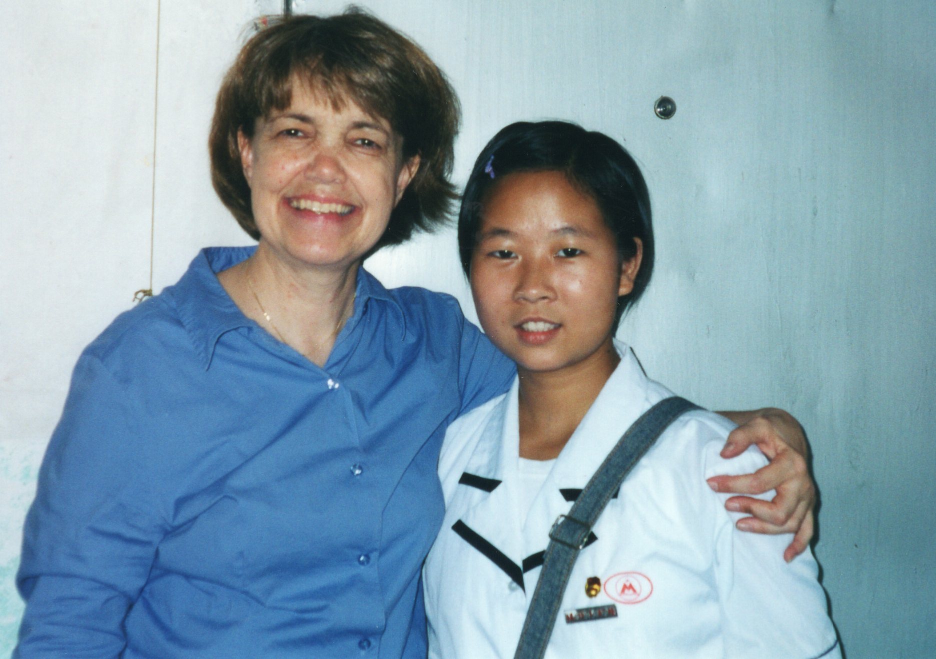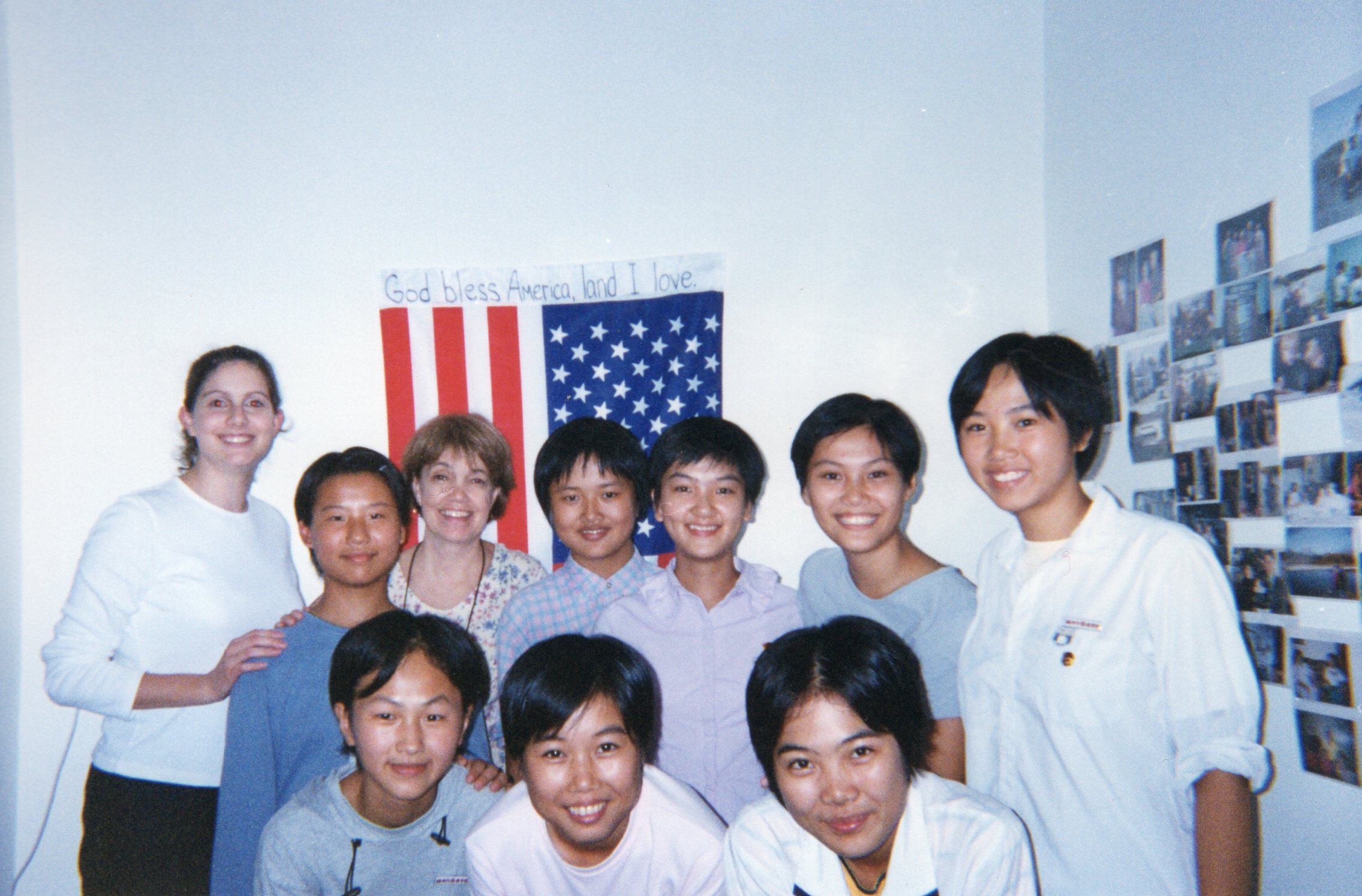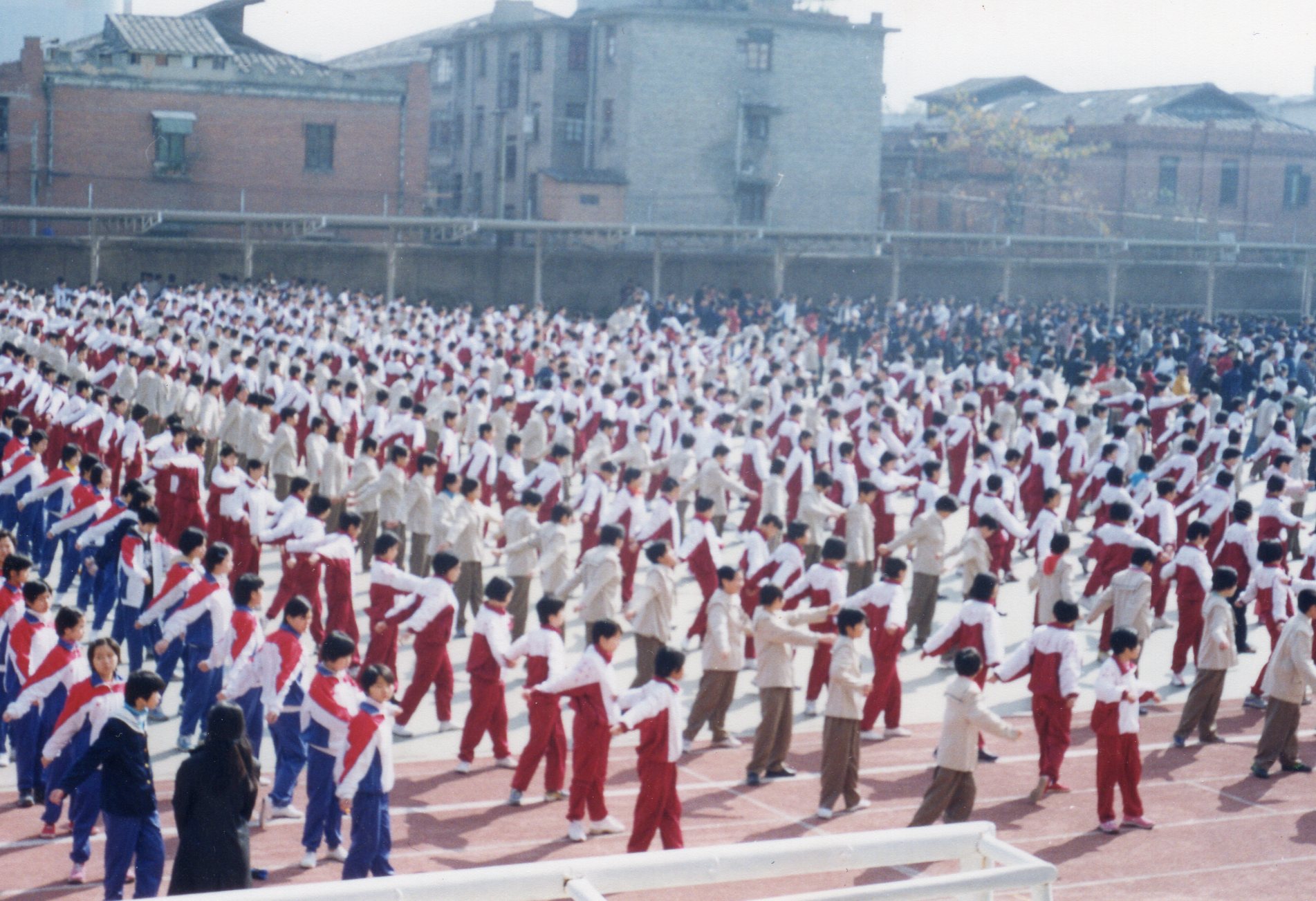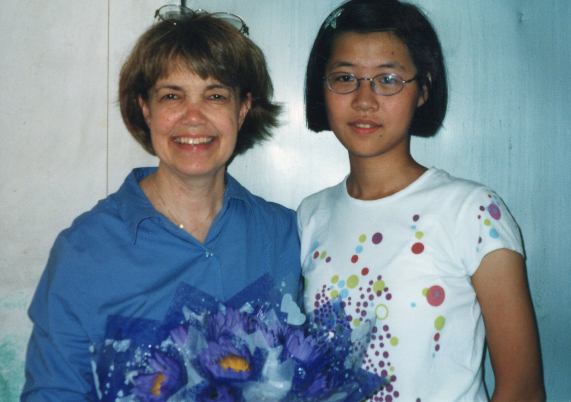 Photos from Jo Ann's time teaching at the Fuzhou Foreign Languages School in Fuzhou, China (2001–2002)—the school's first native English-speaking American teacher, known there as Miss Jones. The gallery includes the First Foreign Language Festival (December 2001), with Miss Fang's all-school celebration: songs, dances, and the O. Henry play The Policeman and the Anthem, performed by her spoken-English class at a packed local cinema.