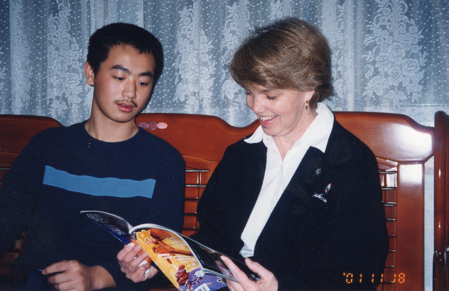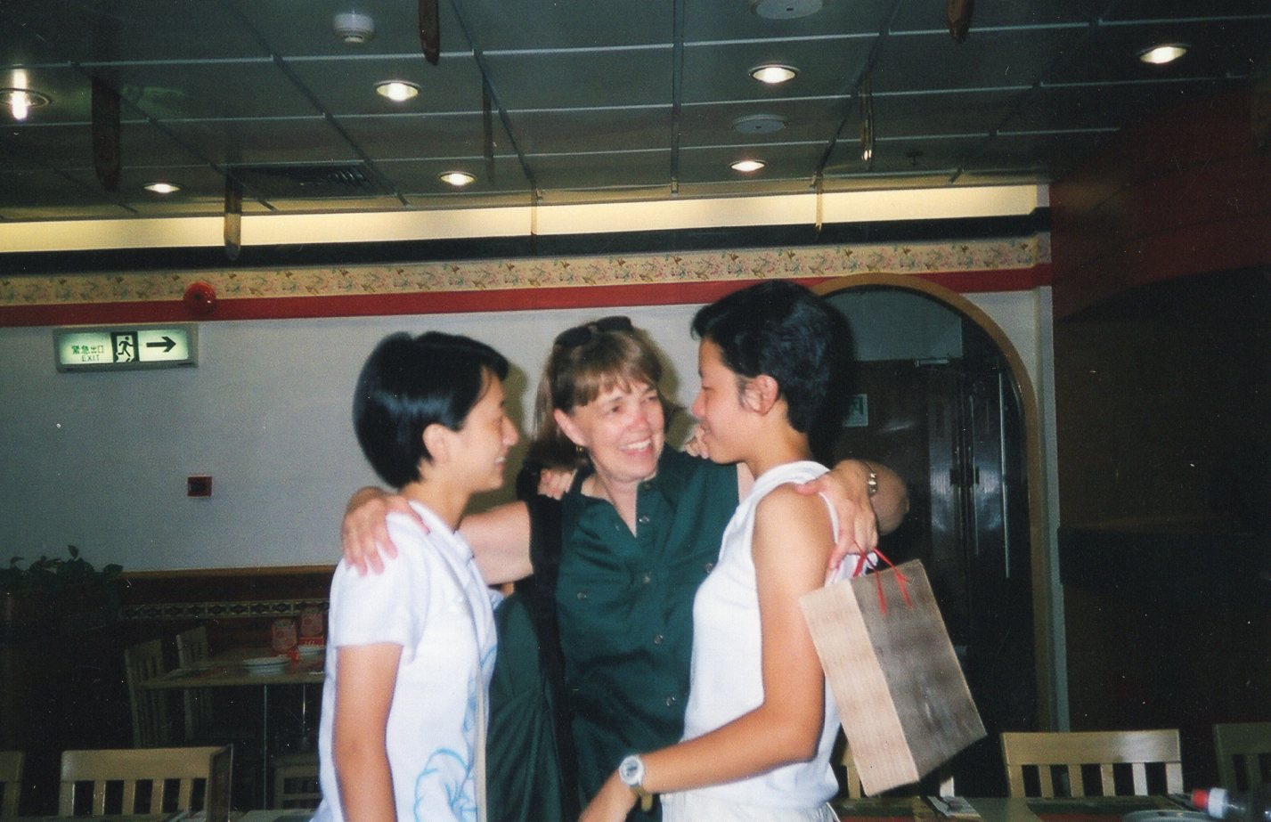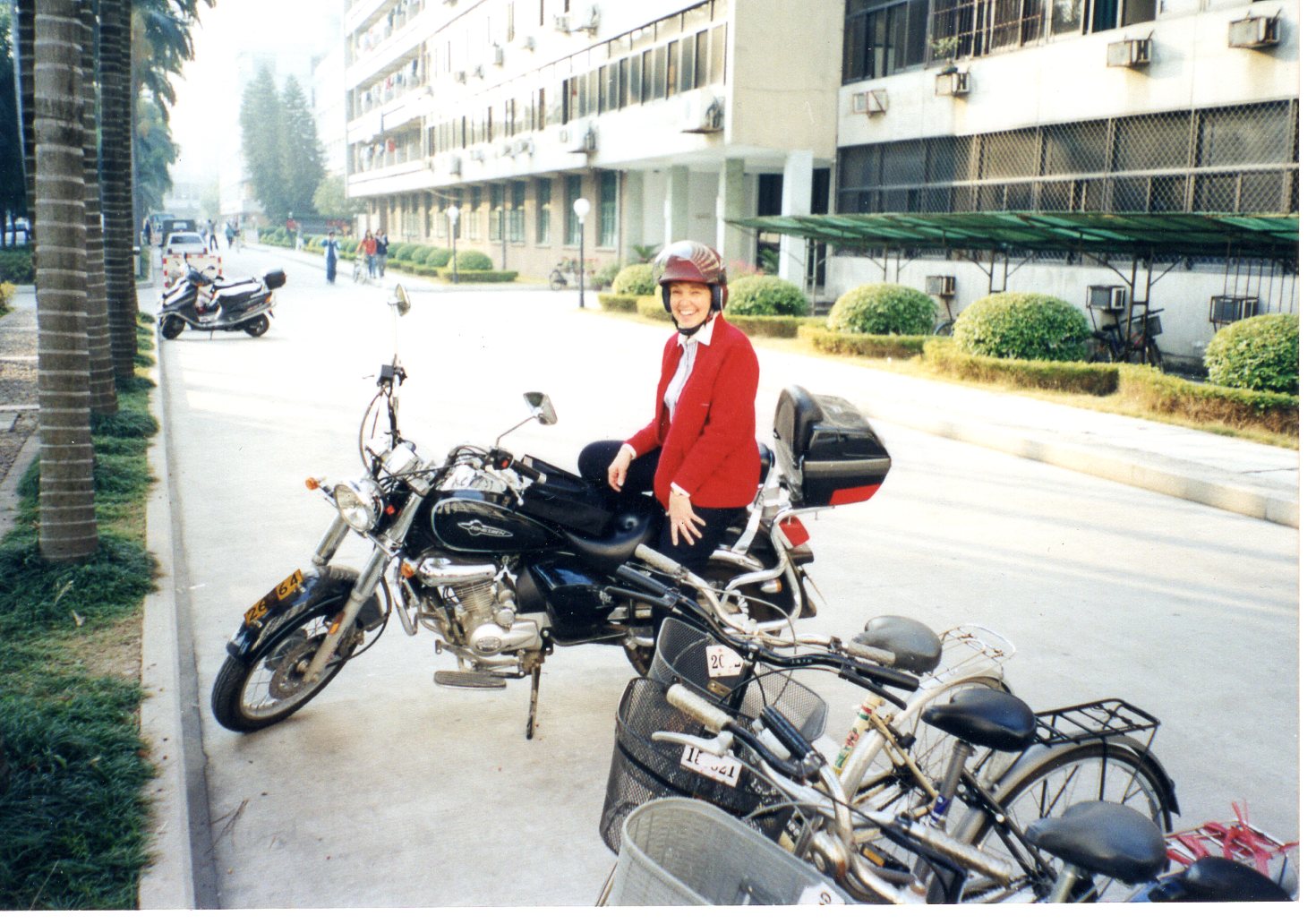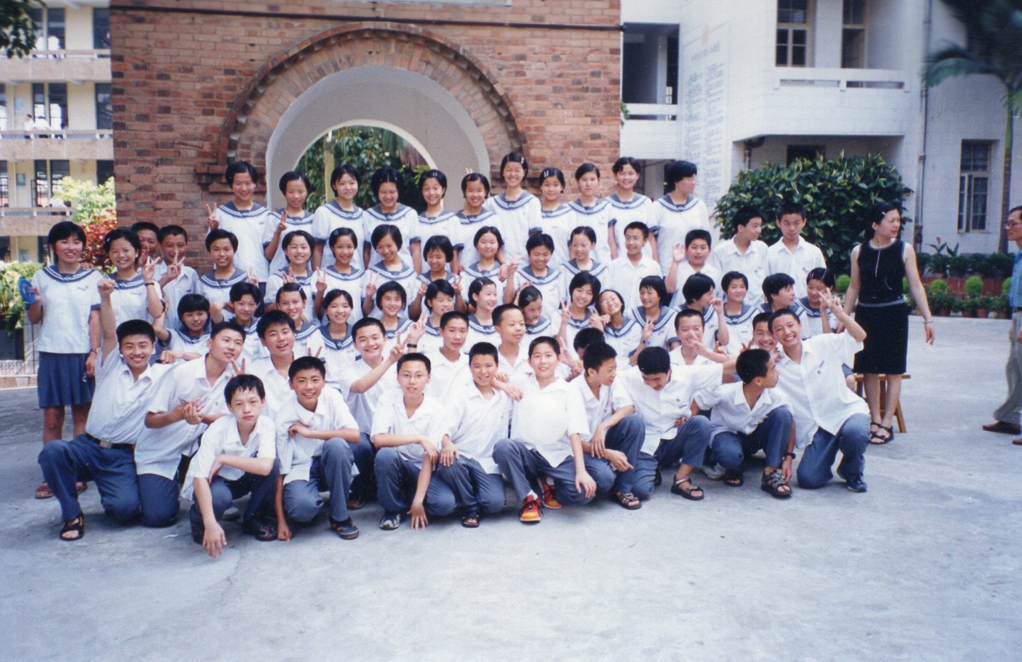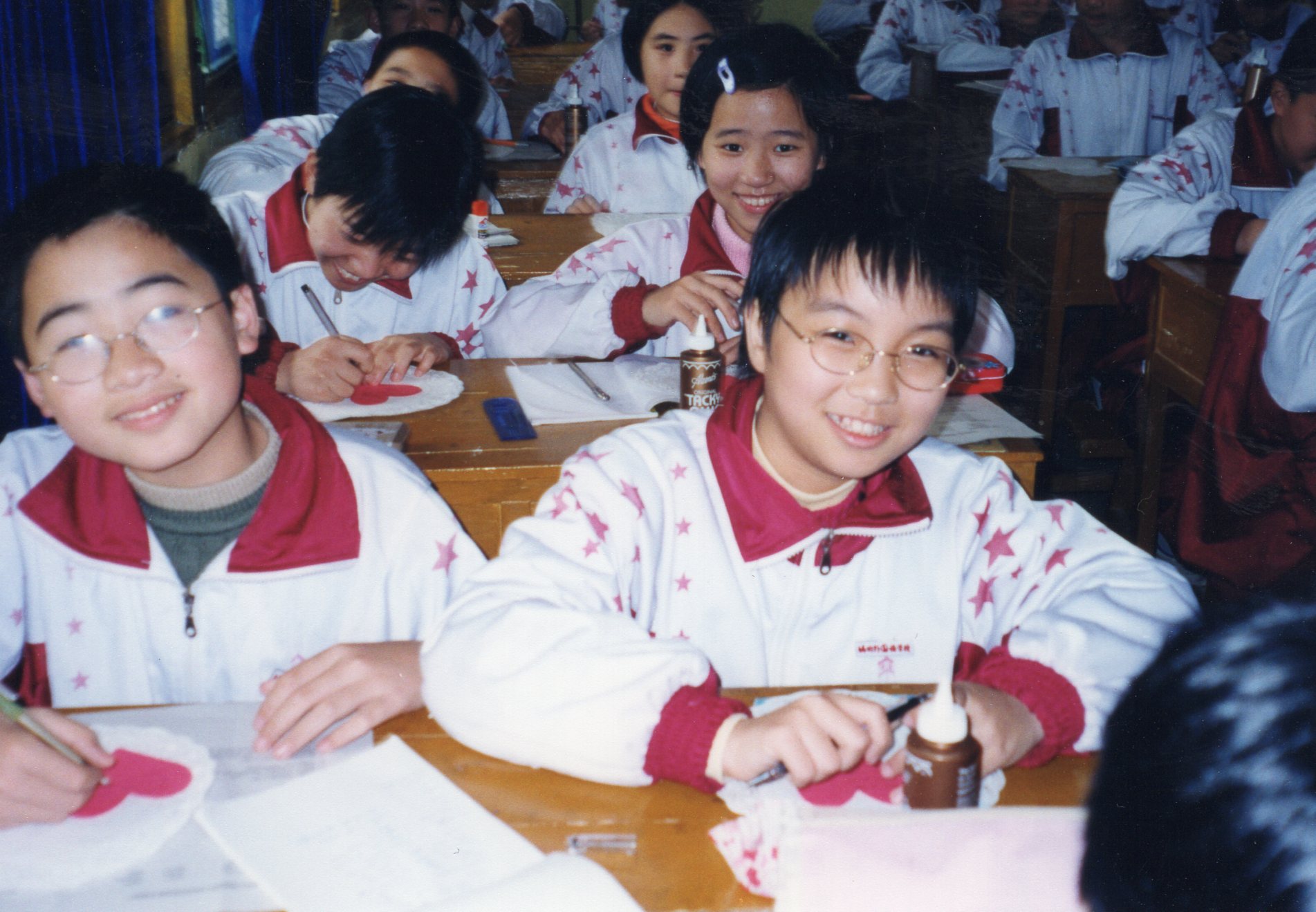 Photos from Jo Ann's time teaching at the Fuzhou Foreign Languages School in Fuzhou, China (2001–2002)—the school's first native English-speaking American teacher, known there as Miss Jones. The gallery includes the First Foreign Language Festival (December 2001), with Miss Fang's all-school celebration: songs, dances, and the O. Henry play The Policeman and the Anthem, performed by her spoken-English class at a packed local cinema.