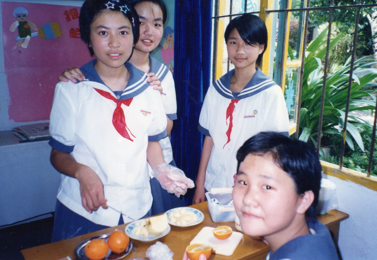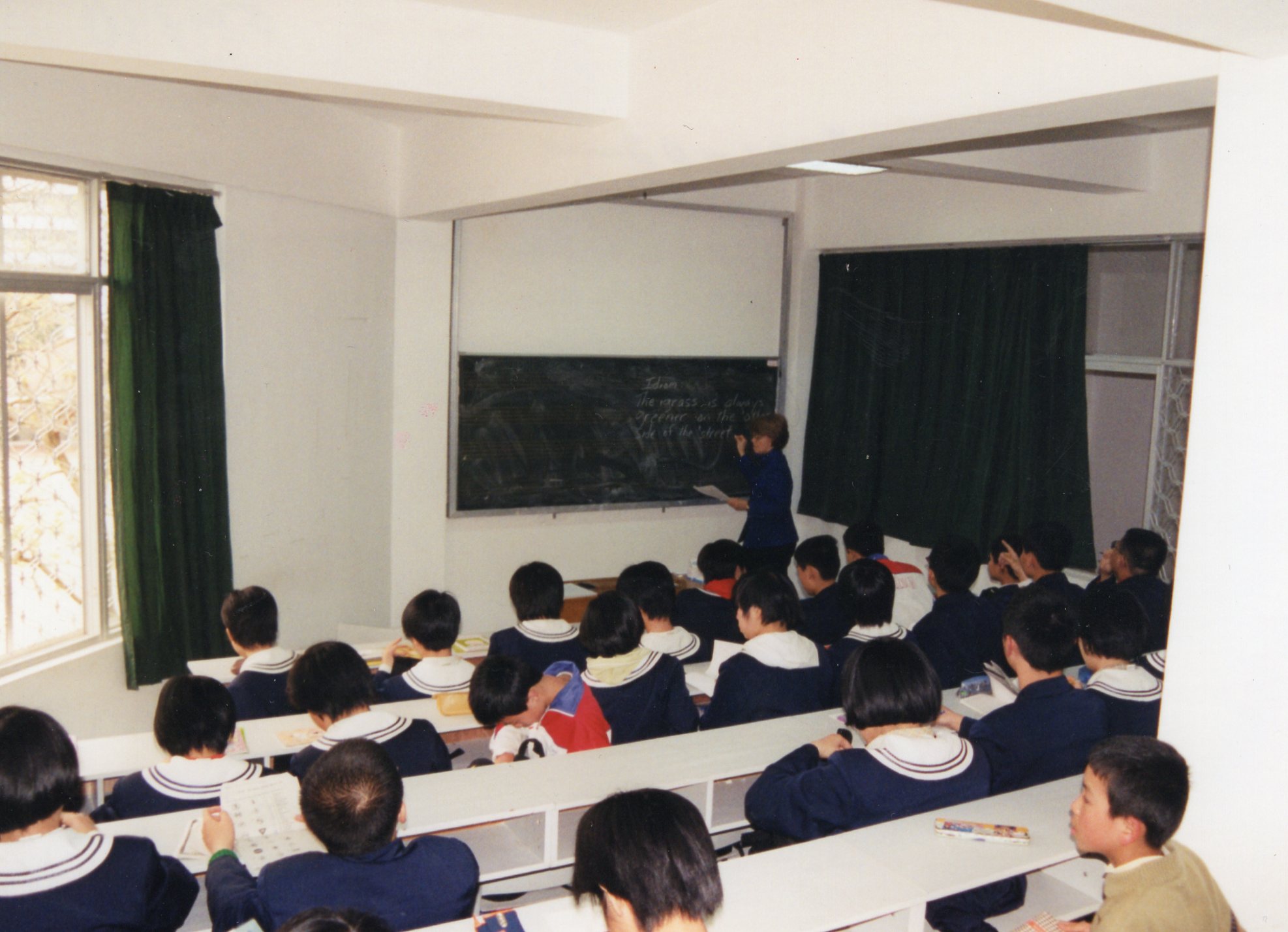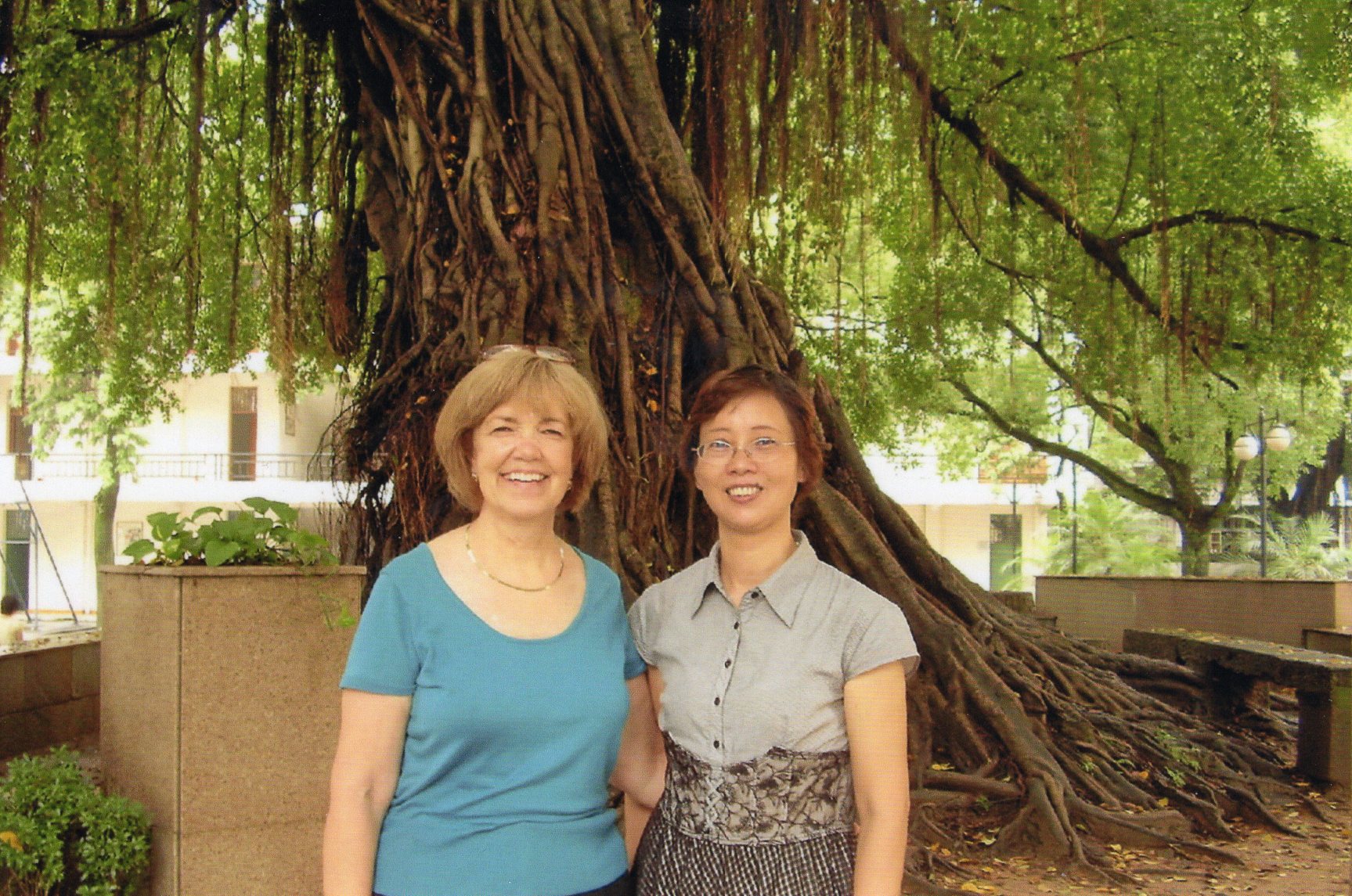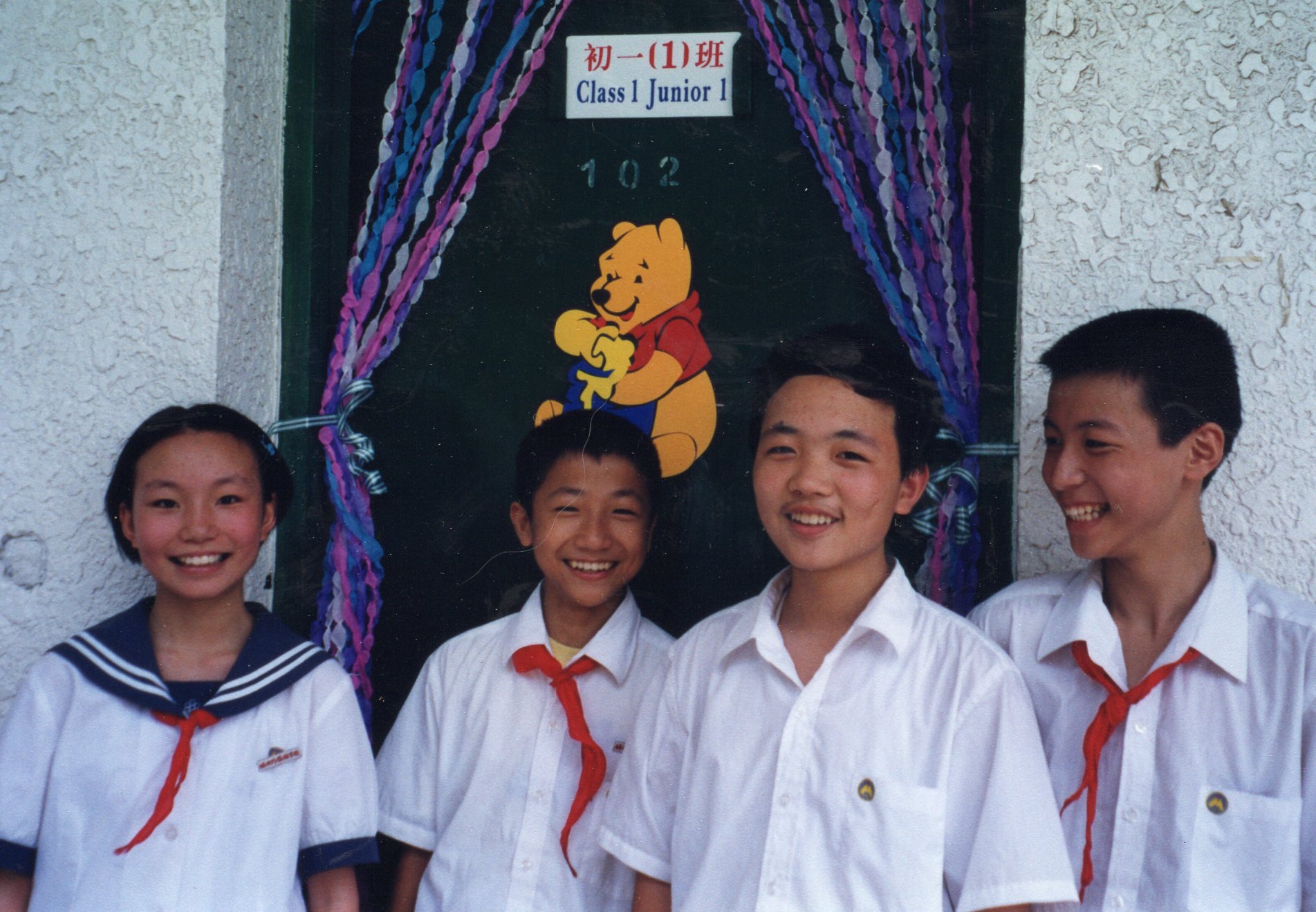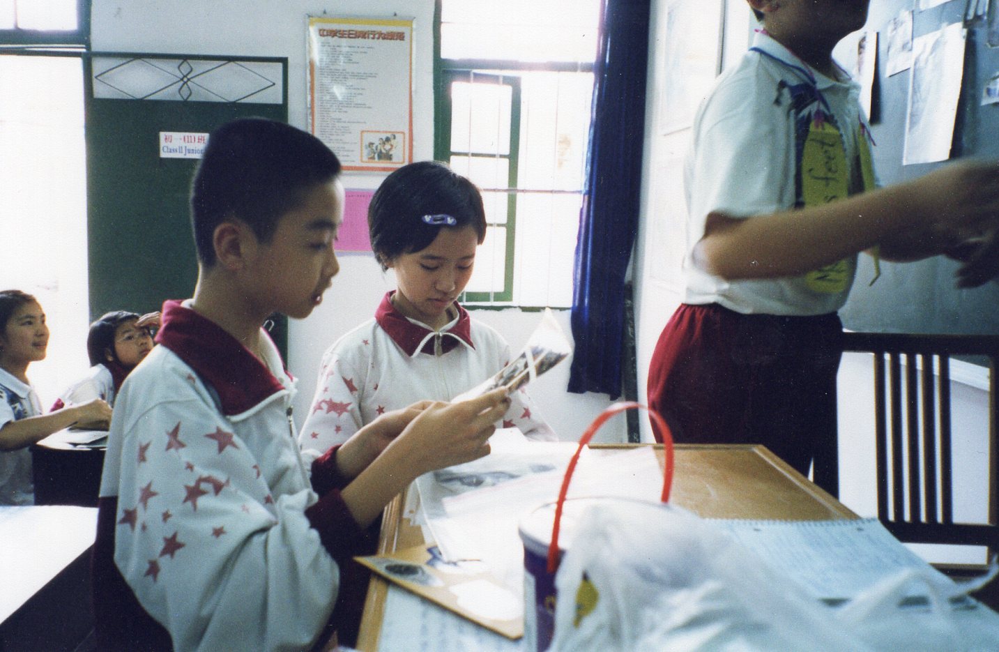 Photos from Jo Ann's time teaching at the Fuzhou Foreign Languages School in Fuzhou, China (2001–2002)—the school's first native English-speaking American teacher, known there as Miss Jones. The gallery includes the First Foreign Language Festival (December 2001), with Miss Fang's all-school celebration: songs, dances, and the O. Henry play The Policeman and the Anthem, performed by her spoken-English class at a packed local cinema.