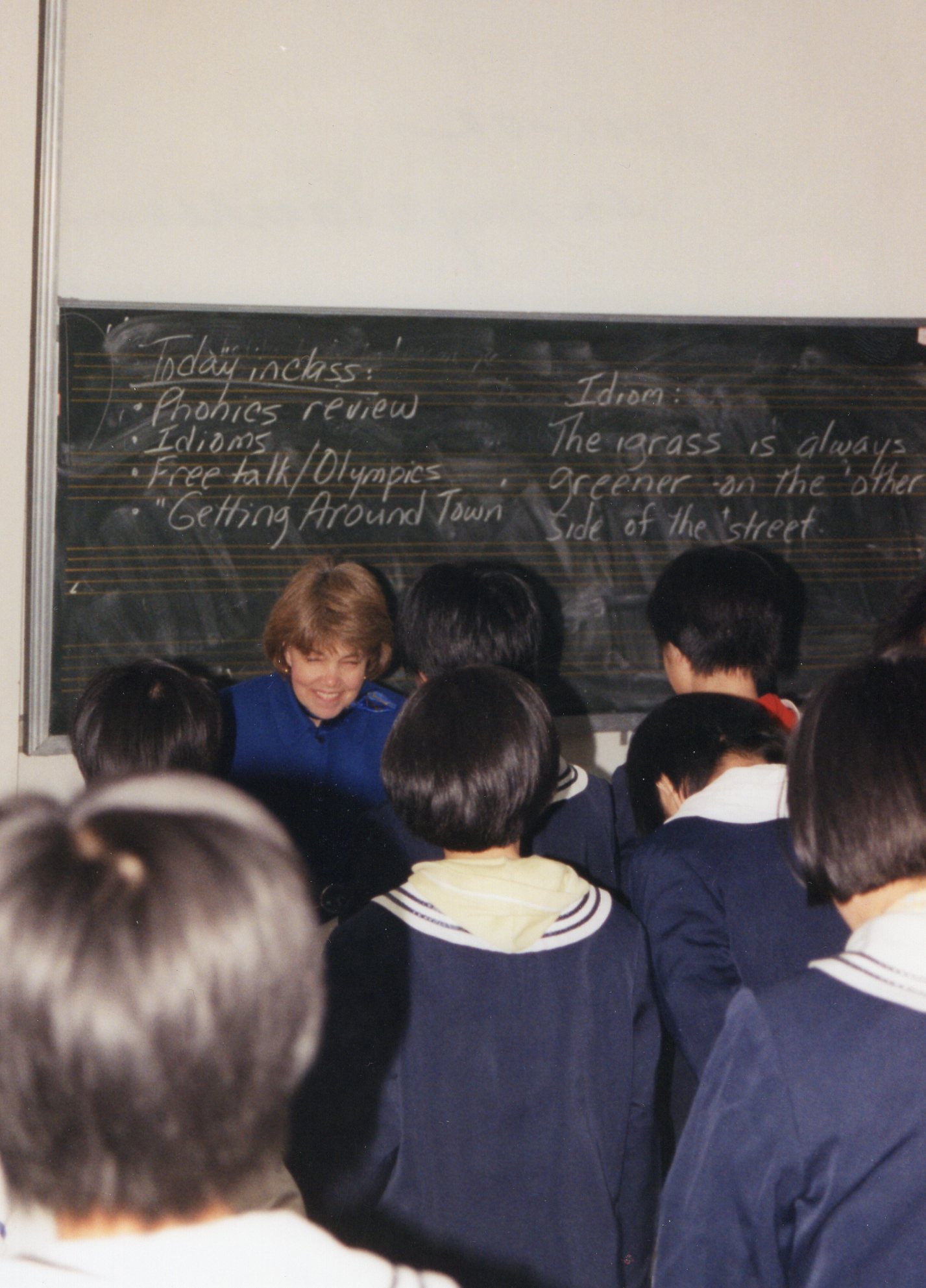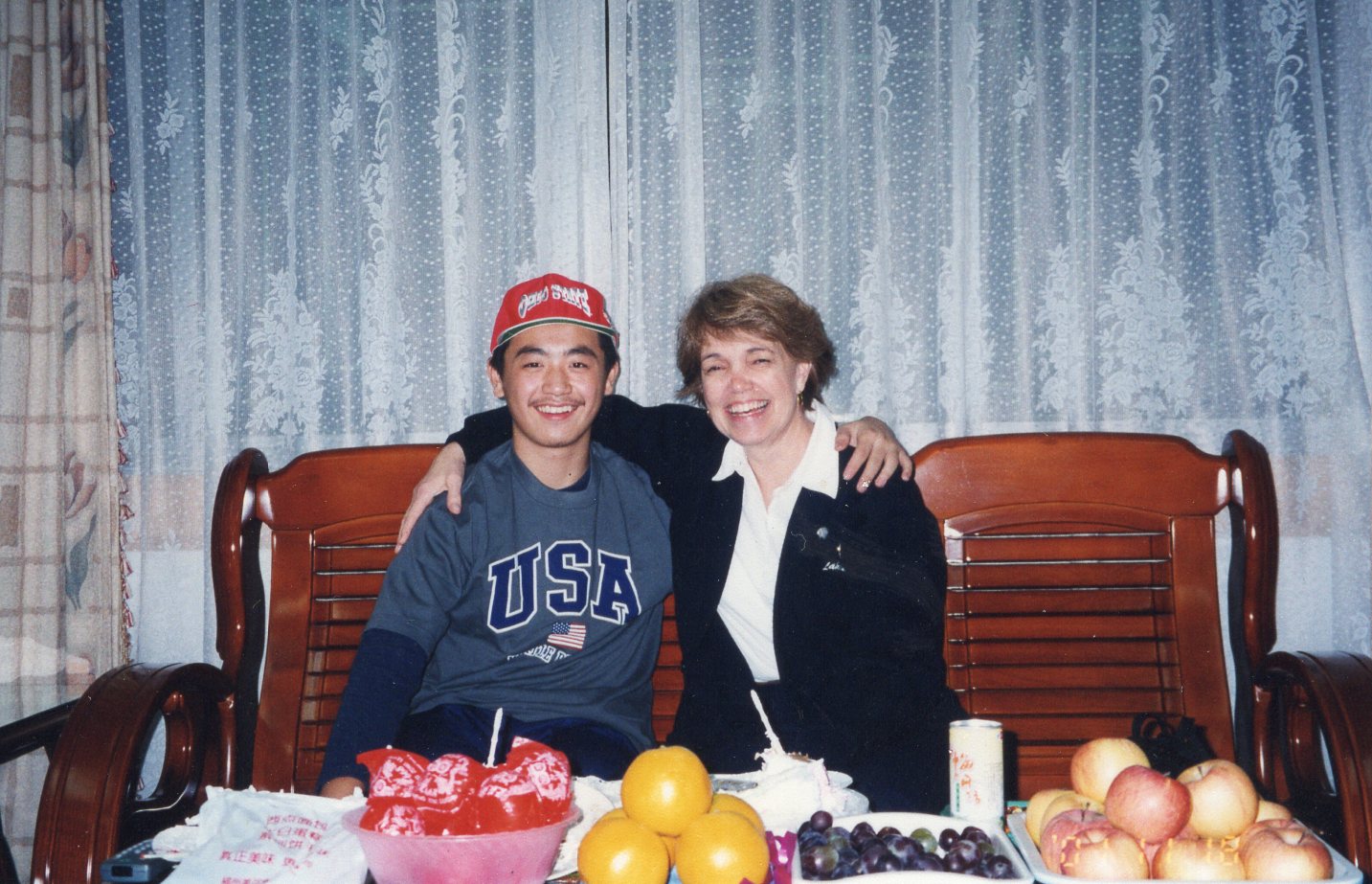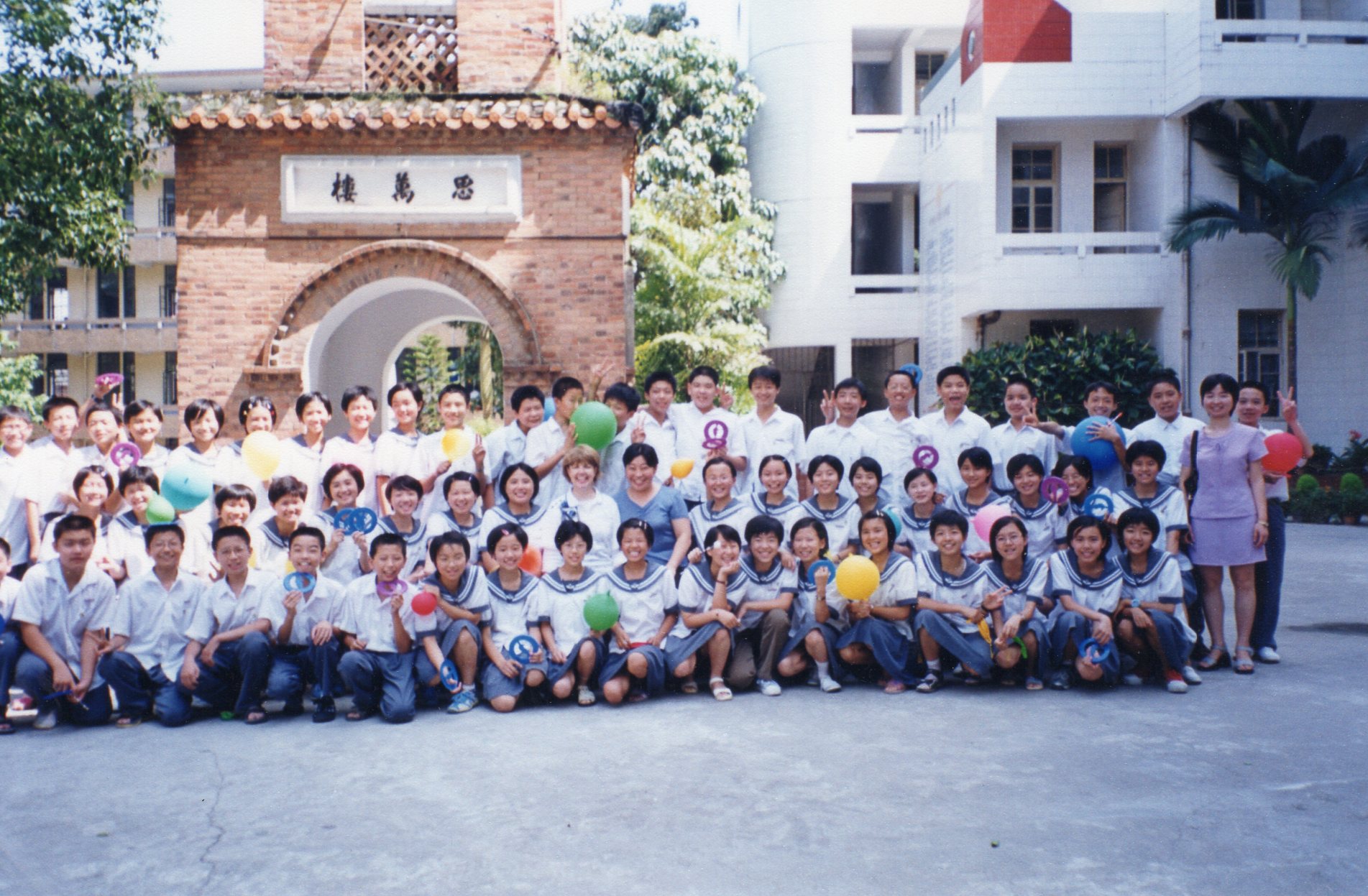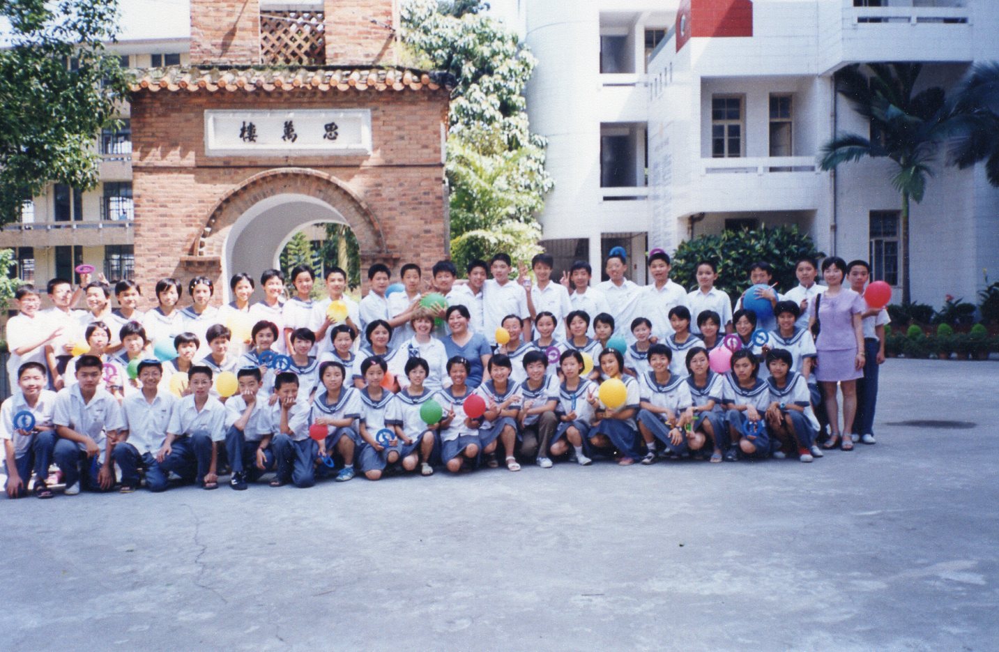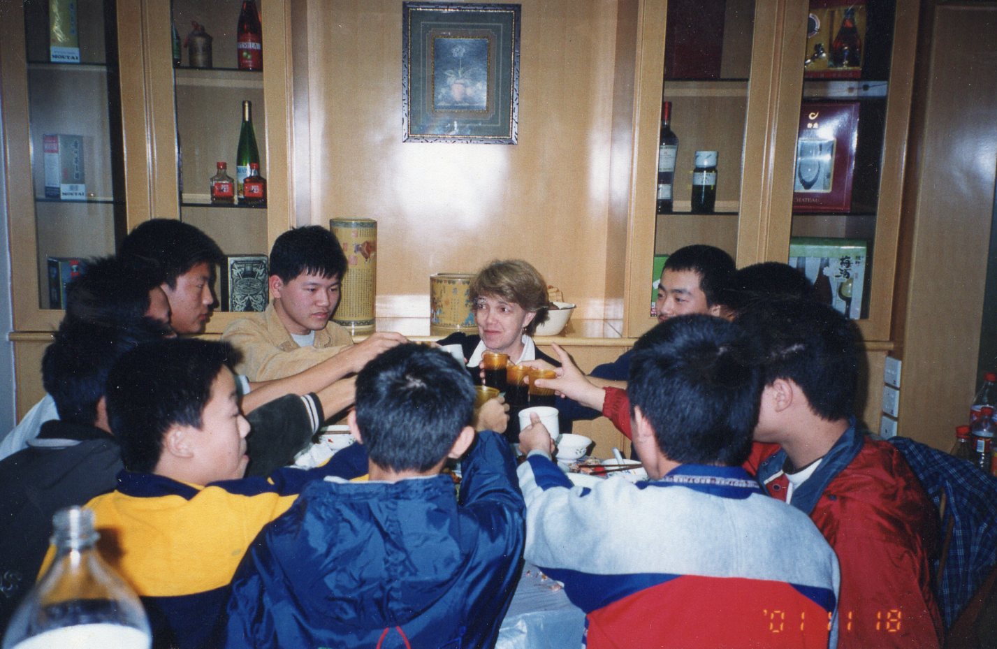 Photos from Jo Ann's time teaching at the Fuzhou Foreign Languages School in Fuzhou, China (2001–2002)—the school's first native English-speaking American teacher, known there as Miss Jones. The gallery includes the First Foreign Language Festival (December 2001), with Miss Fang's all-school celebration: songs, dances, and the O. Henry play The Policeman and the Anthem, performed by her spoken-English class at a packed local cinema.