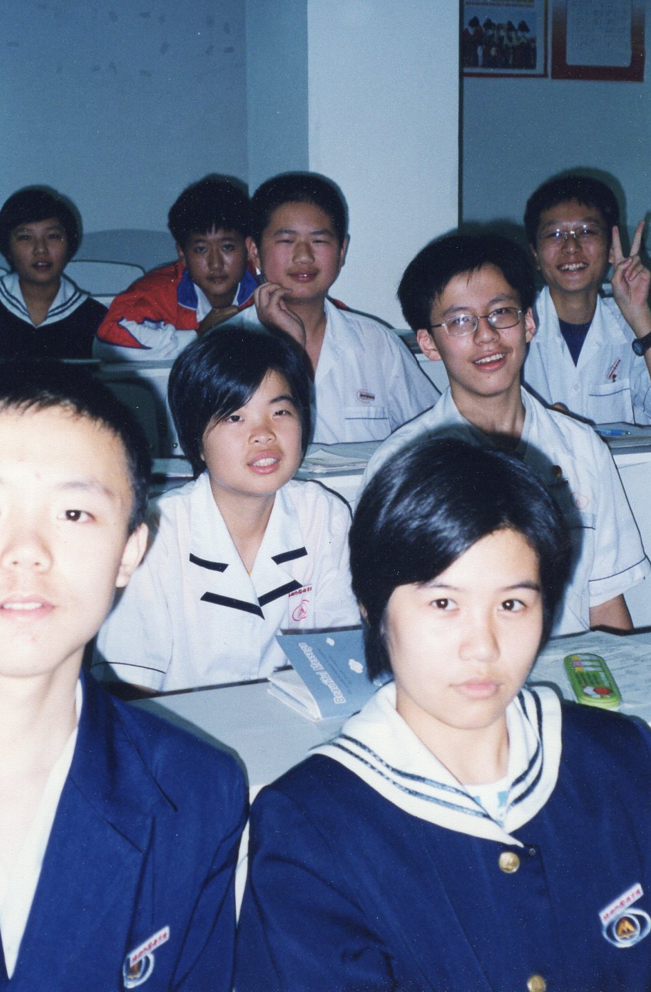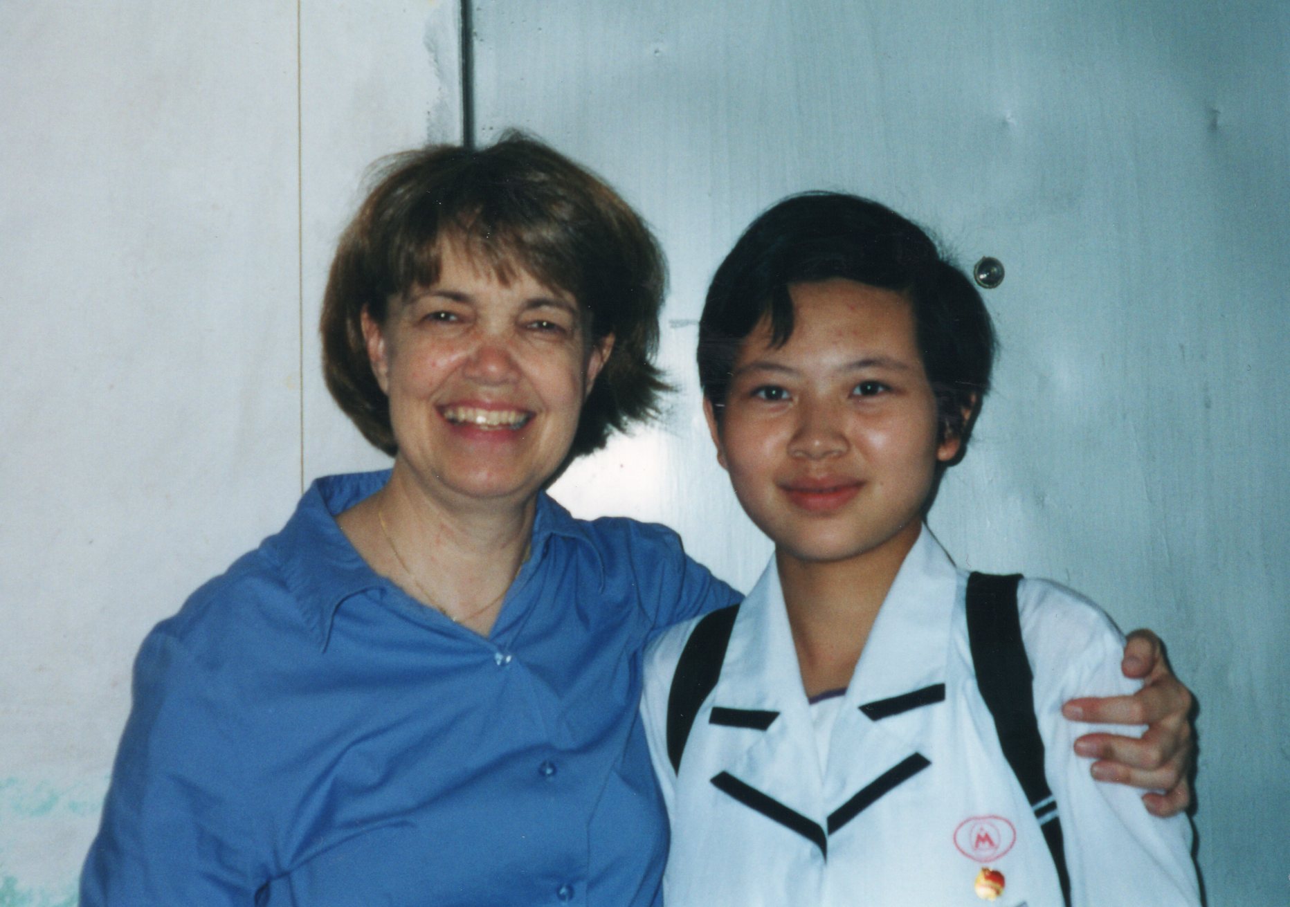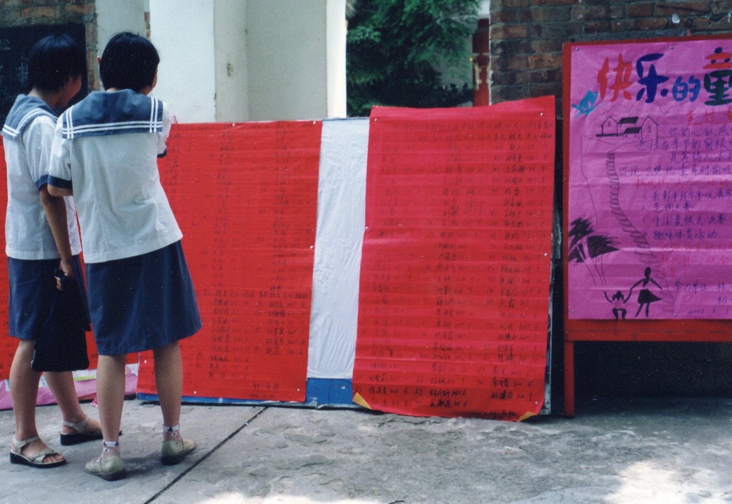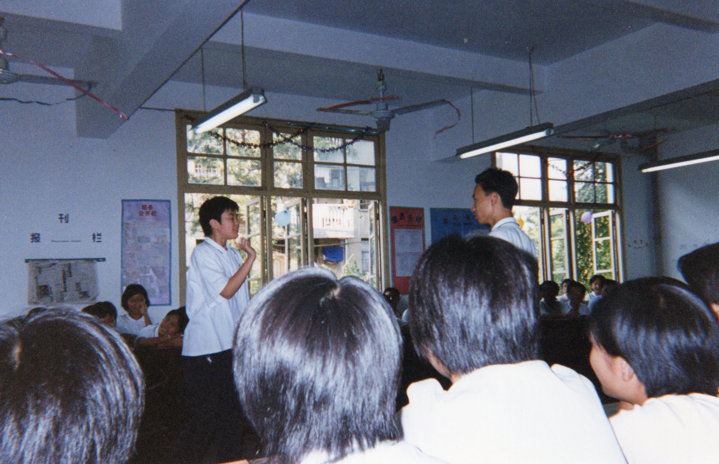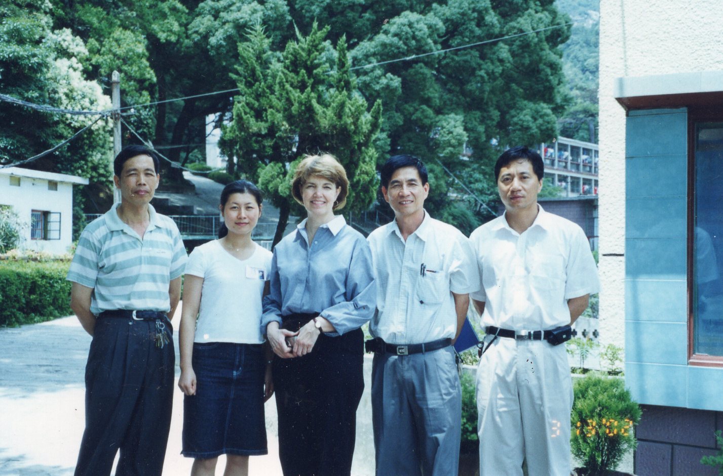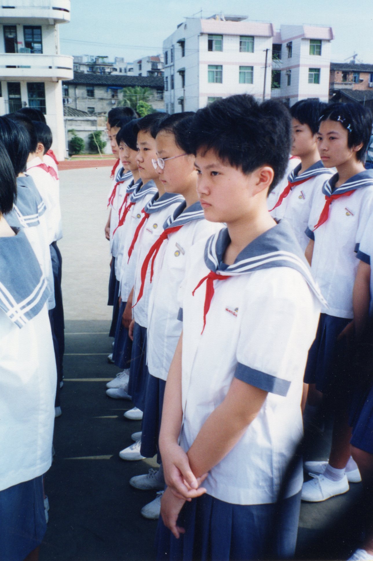 Photos from Jo Ann's time teaching at the Fuzhou Foreign Languages School in Fuzhou, China (2001–2002)—the school's first native English-speaking American teacher, known there as Miss Jones. The gallery includes the First Foreign Language Festival (December 2001), with Miss Fang's all-school celebration: songs, dances, and the O. Henry play The Policeman and the Anthem, performed by her spoken-English class at a packed local cinema.