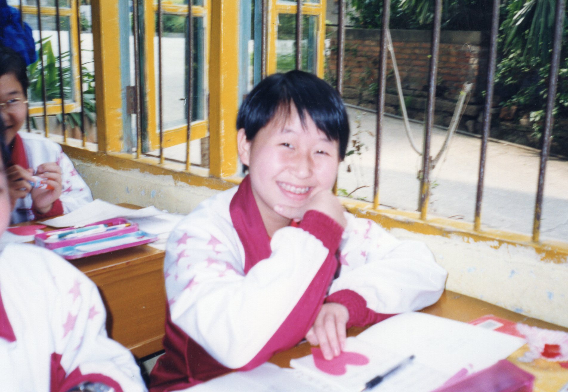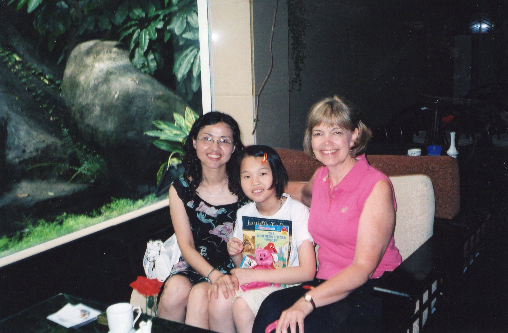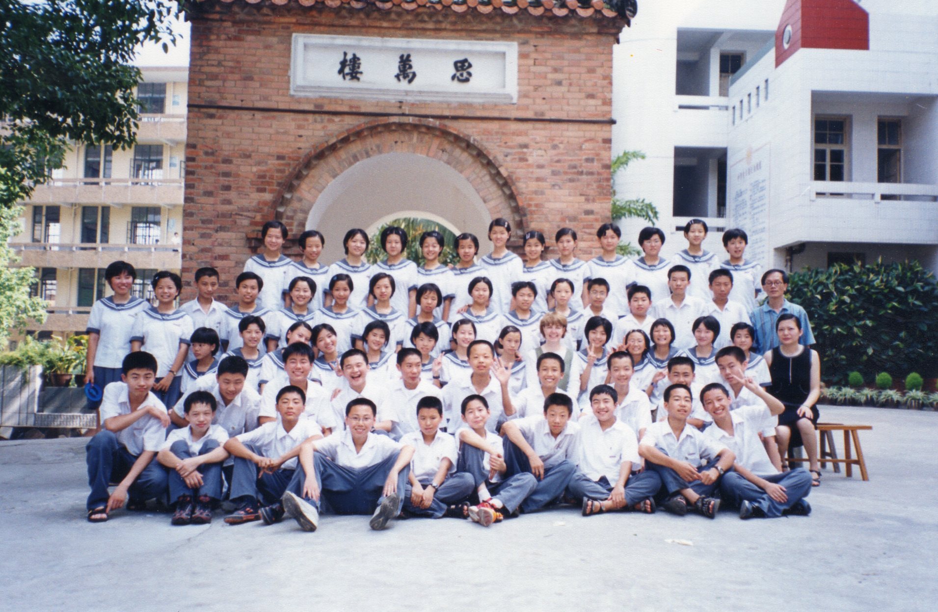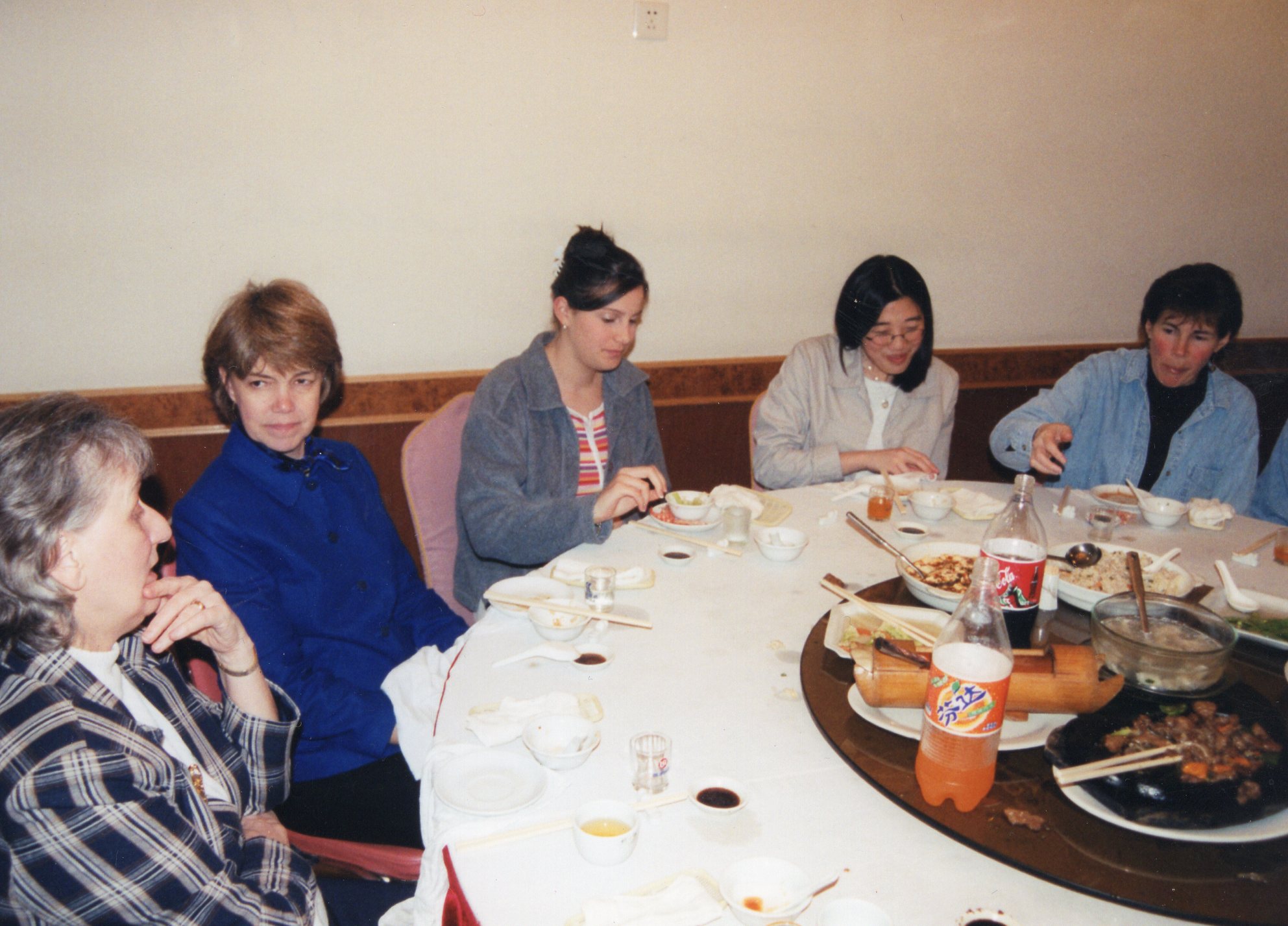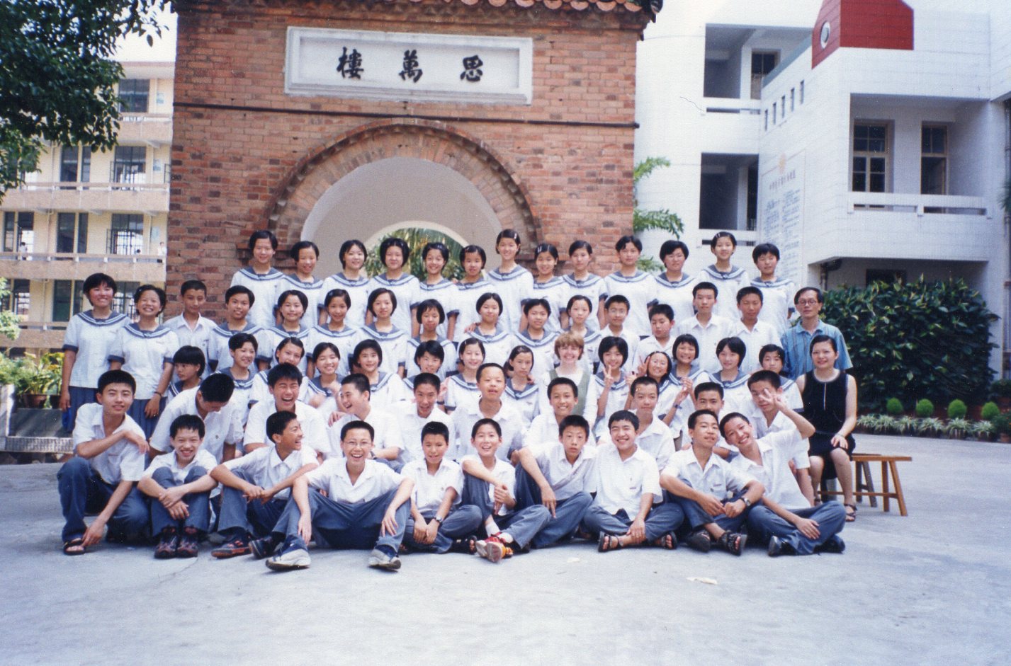 Photos from Jo Ann's time teaching at the Fuzhou Foreign Languages School in Fuzhou, China (2001–2002)—the school's first native English-speaking American teacher, known there as Miss Jones. The gallery includes the First Foreign Language Festival (December 2001), with Miss Fang's all-school celebration: songs, dances, and the O. Henry play The Policeman and the Anthem, performed by her spoken-English class at a packed local cinema.