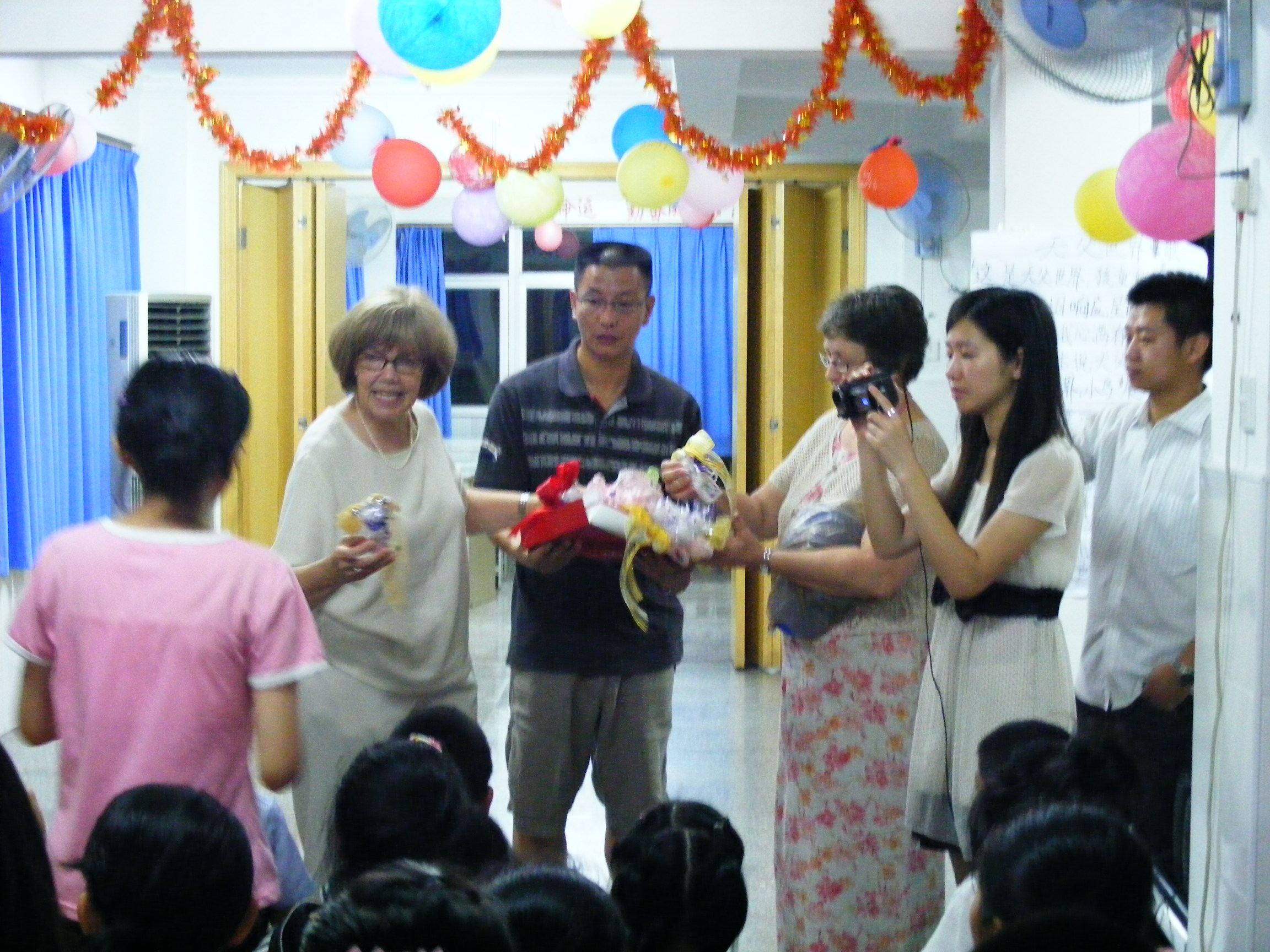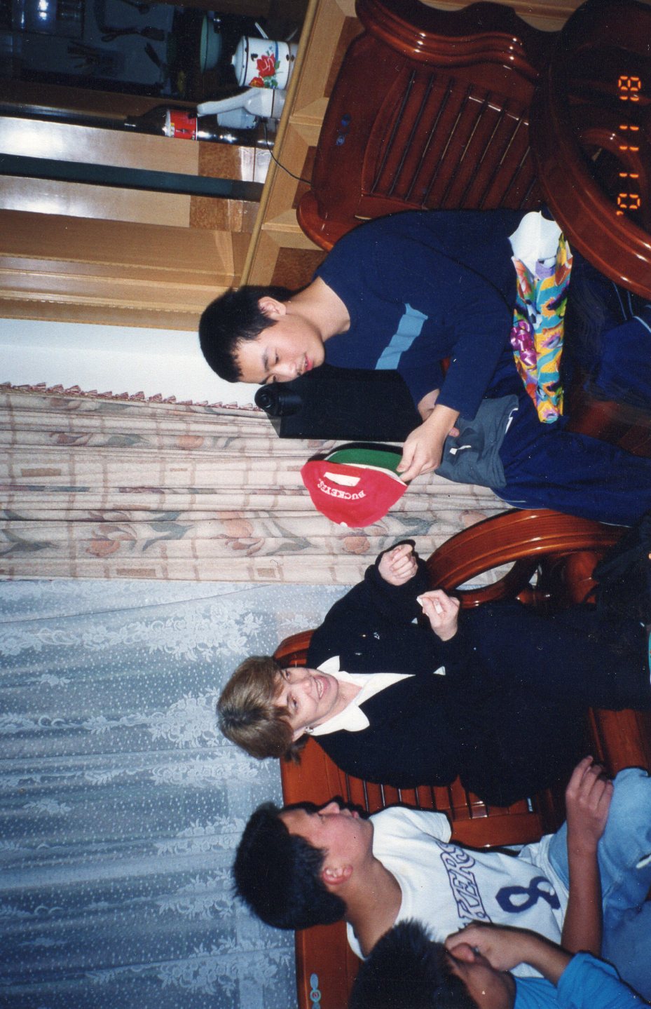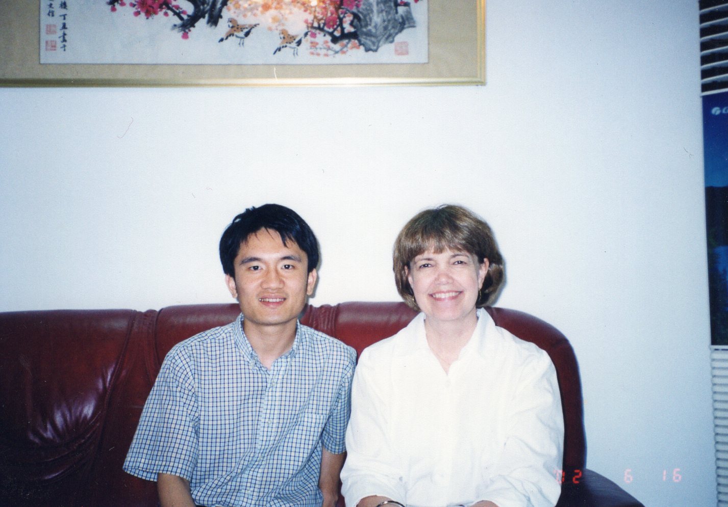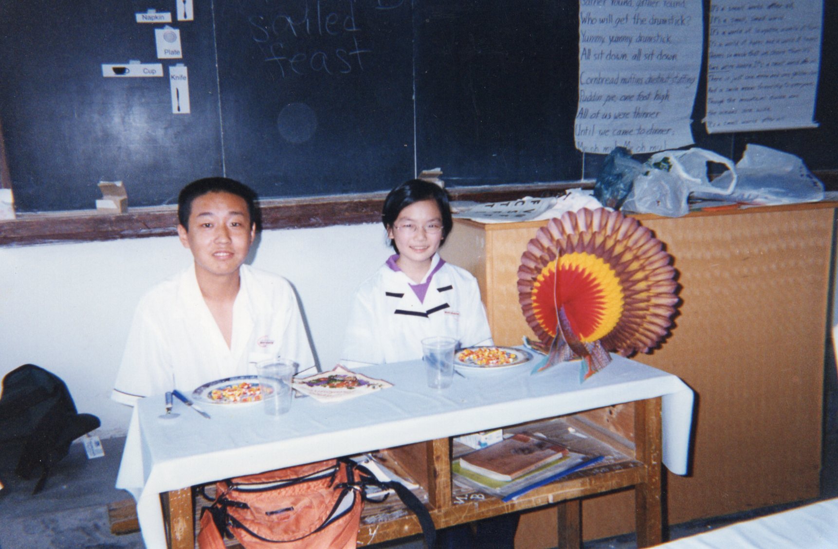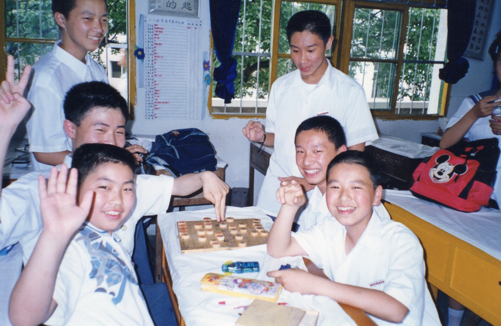 Photos from Jo Ann's time teaching at the Fuzhou Foreign Languages School in Fuzhou, China (2001–2002)—the school's first native English-speaking American teacher, known there as Miss Jones. The gallery includes the First Foreign Language Festival (December 2001), with Miss Fang's all-school celebration: songs, dances, and the O. Henry play The Policeman and the Anthem, performed by her spoken-English class at a packed local cinema.