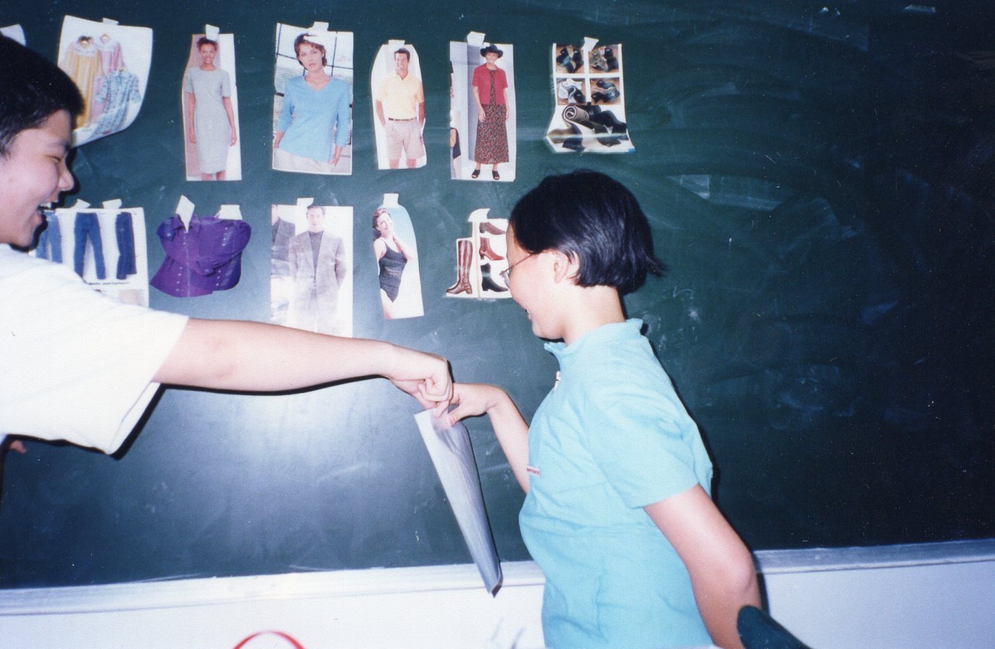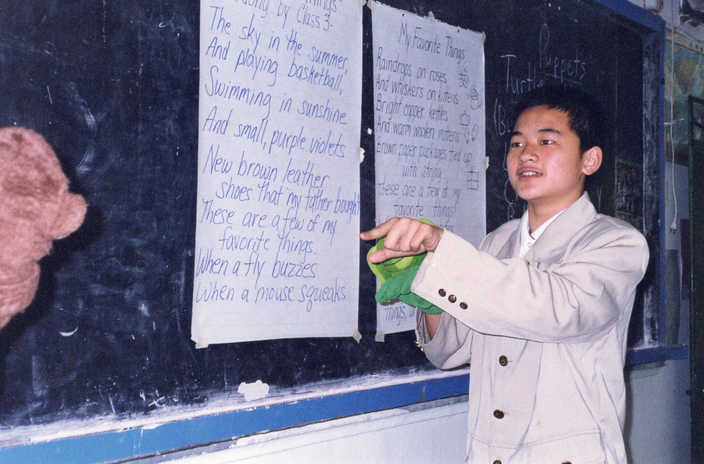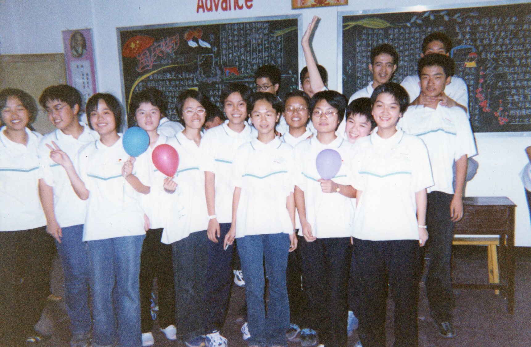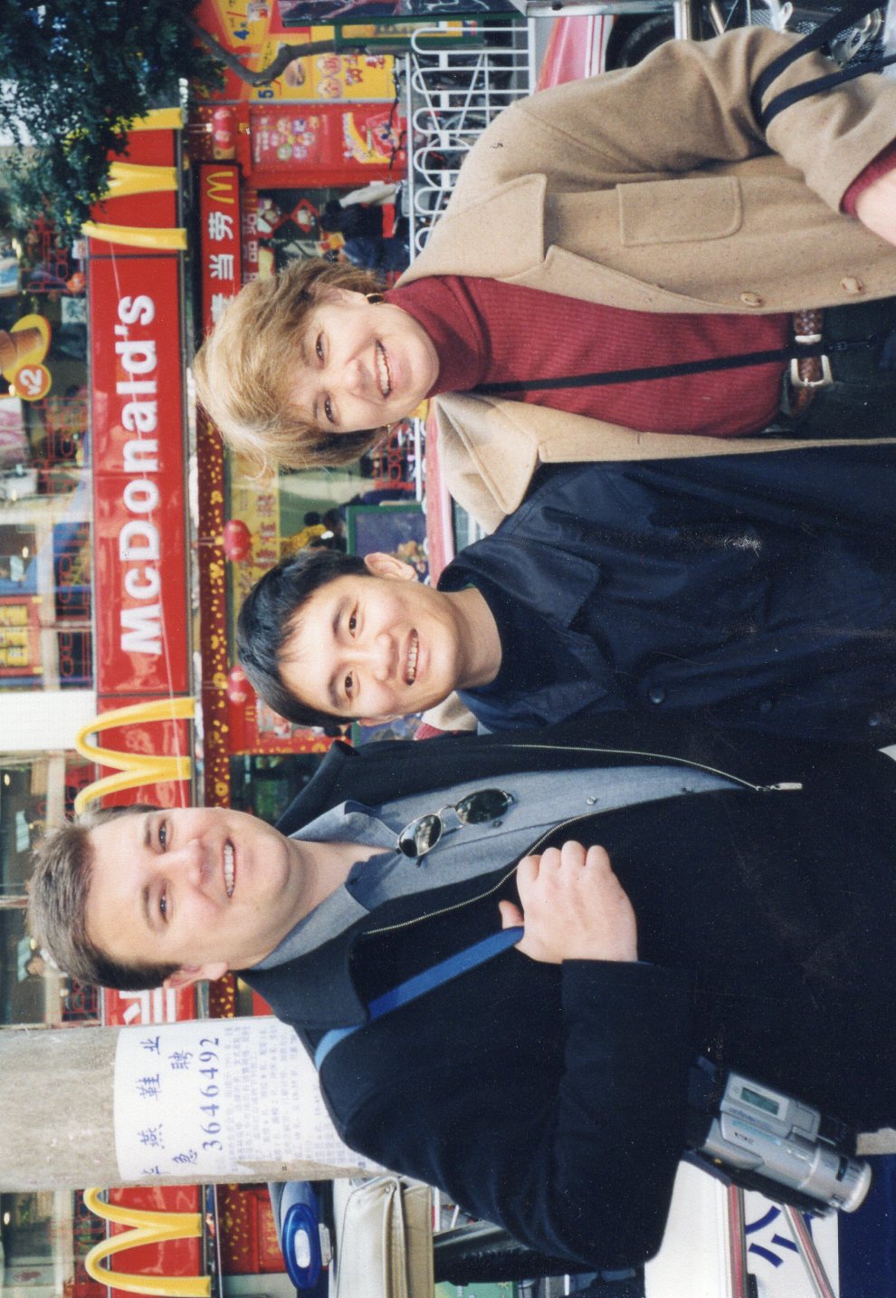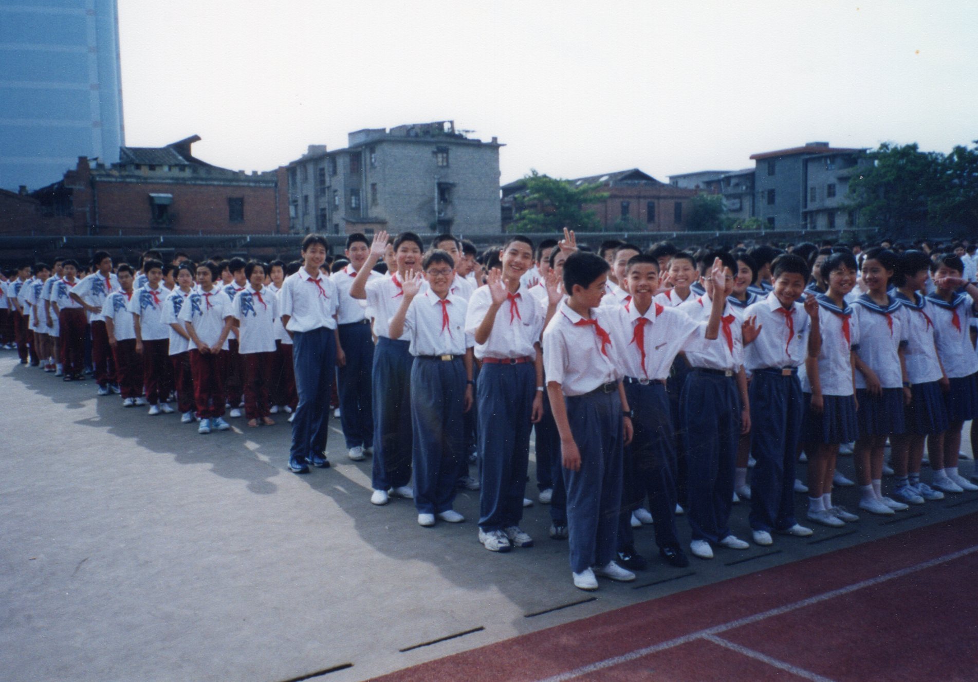 Photos from Jo Ann's time teaching at the Fuzhou Foreign Languages School in Fuzhou, China (2001–2002)—the school's first native English-speaking American teacher, known there as Miss Jones. The gallery includes the First Foreign Language Festival (December 2001), with Miss Fang's all-school celebration: songs, dances, and the O. Henry play The Policeman and the Anthem, performed by her spoken-English class at a packed local cinema.