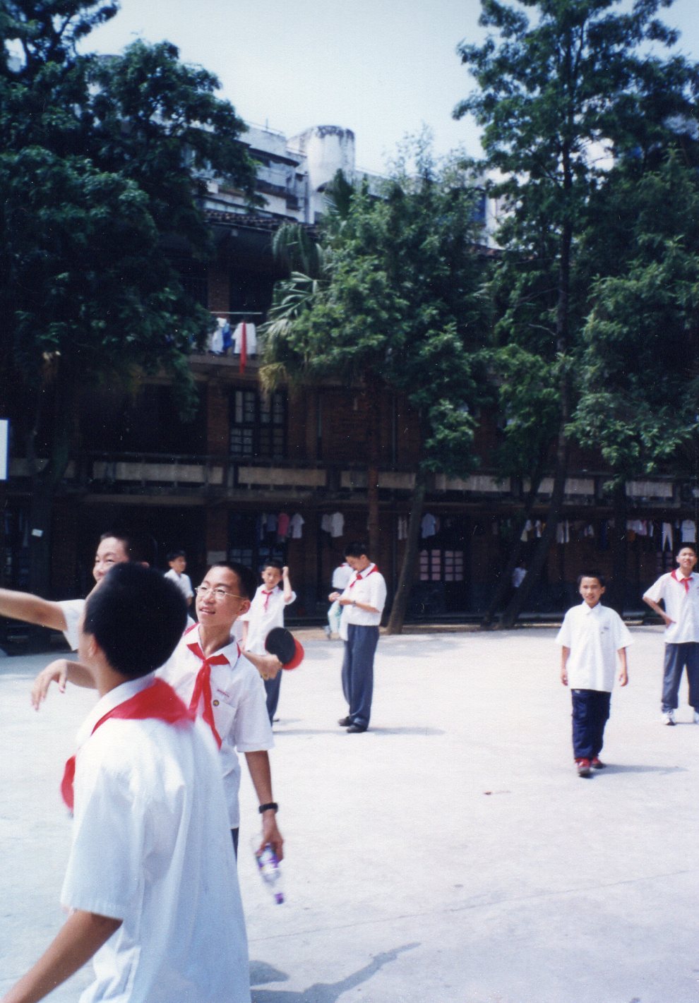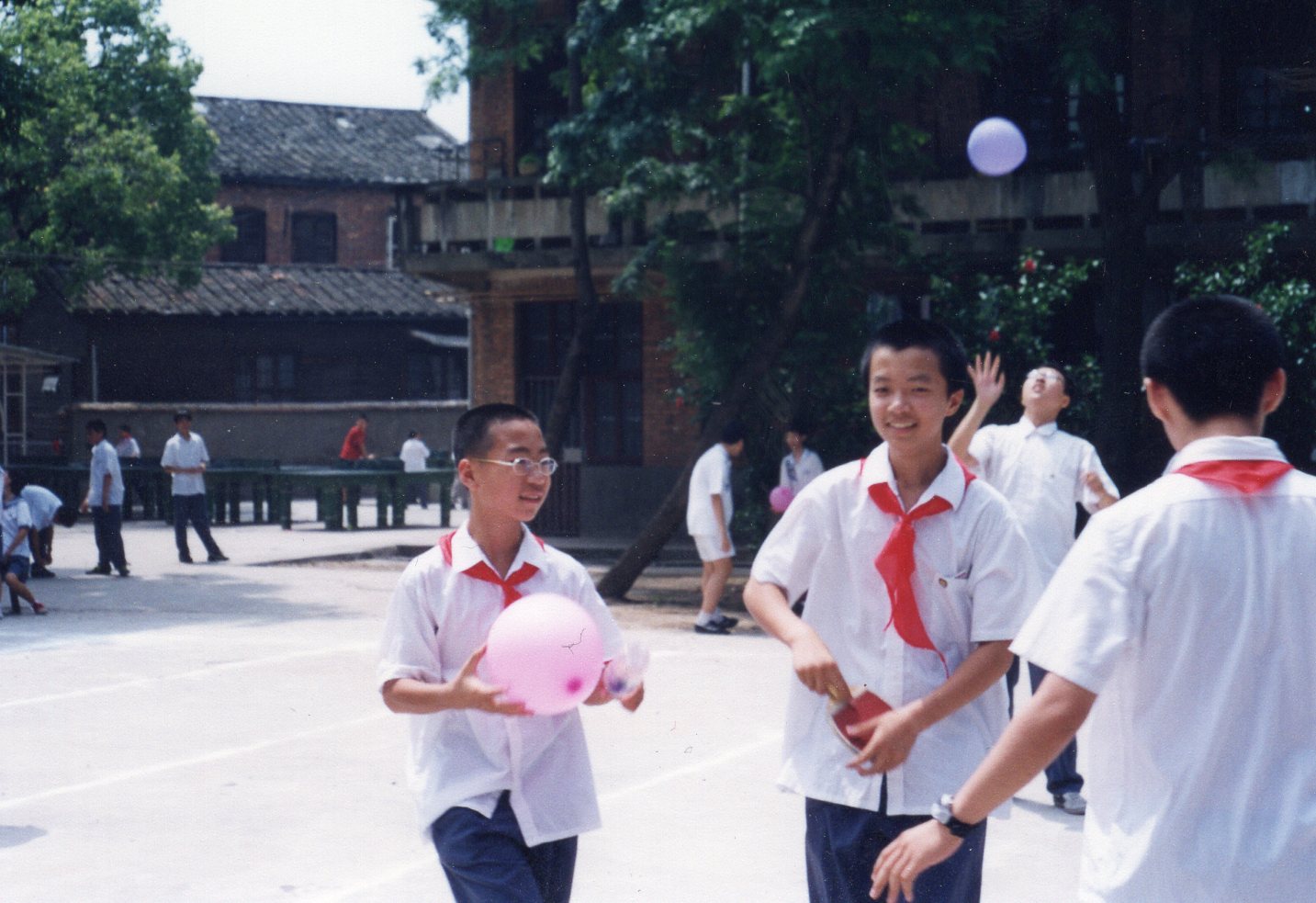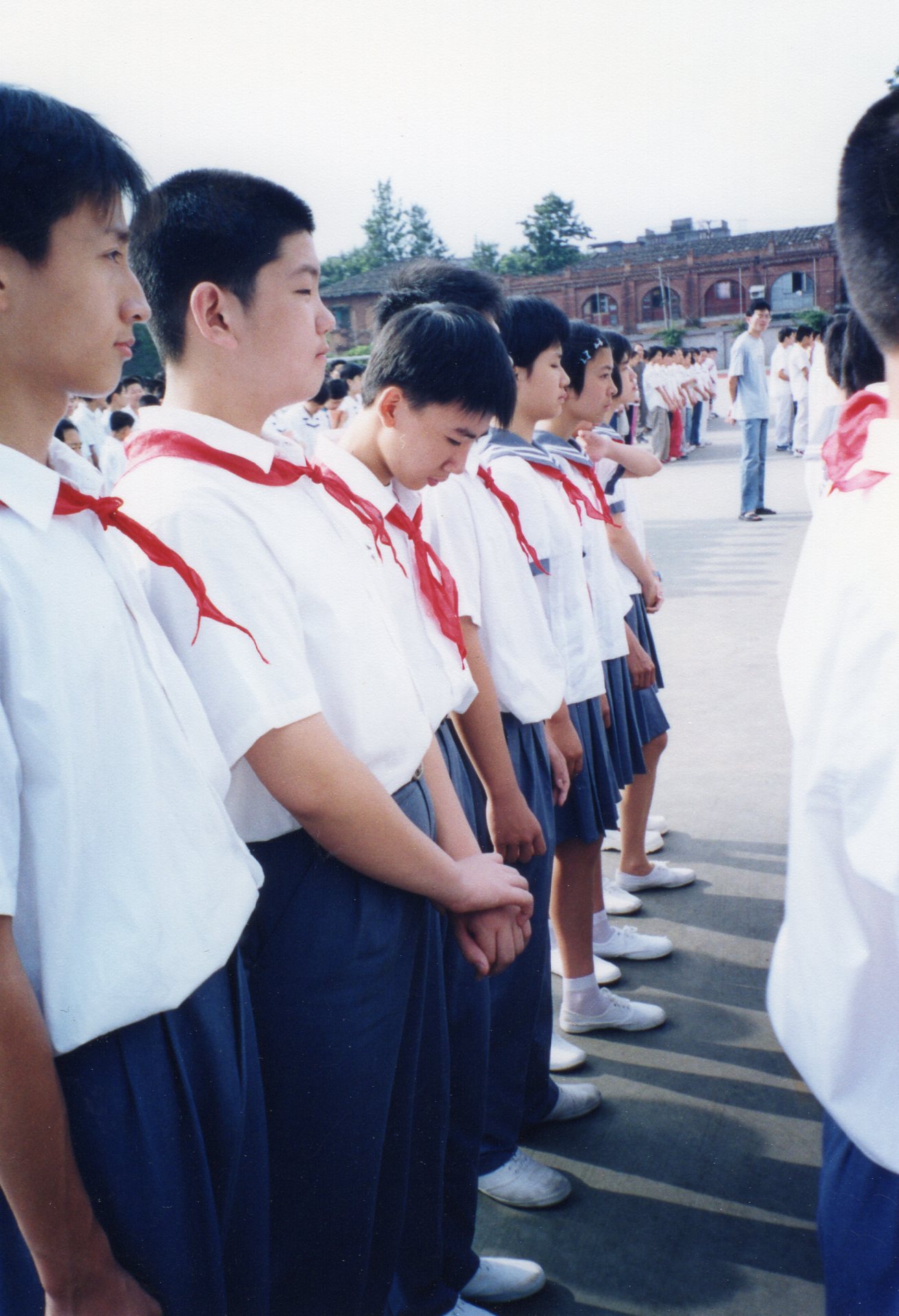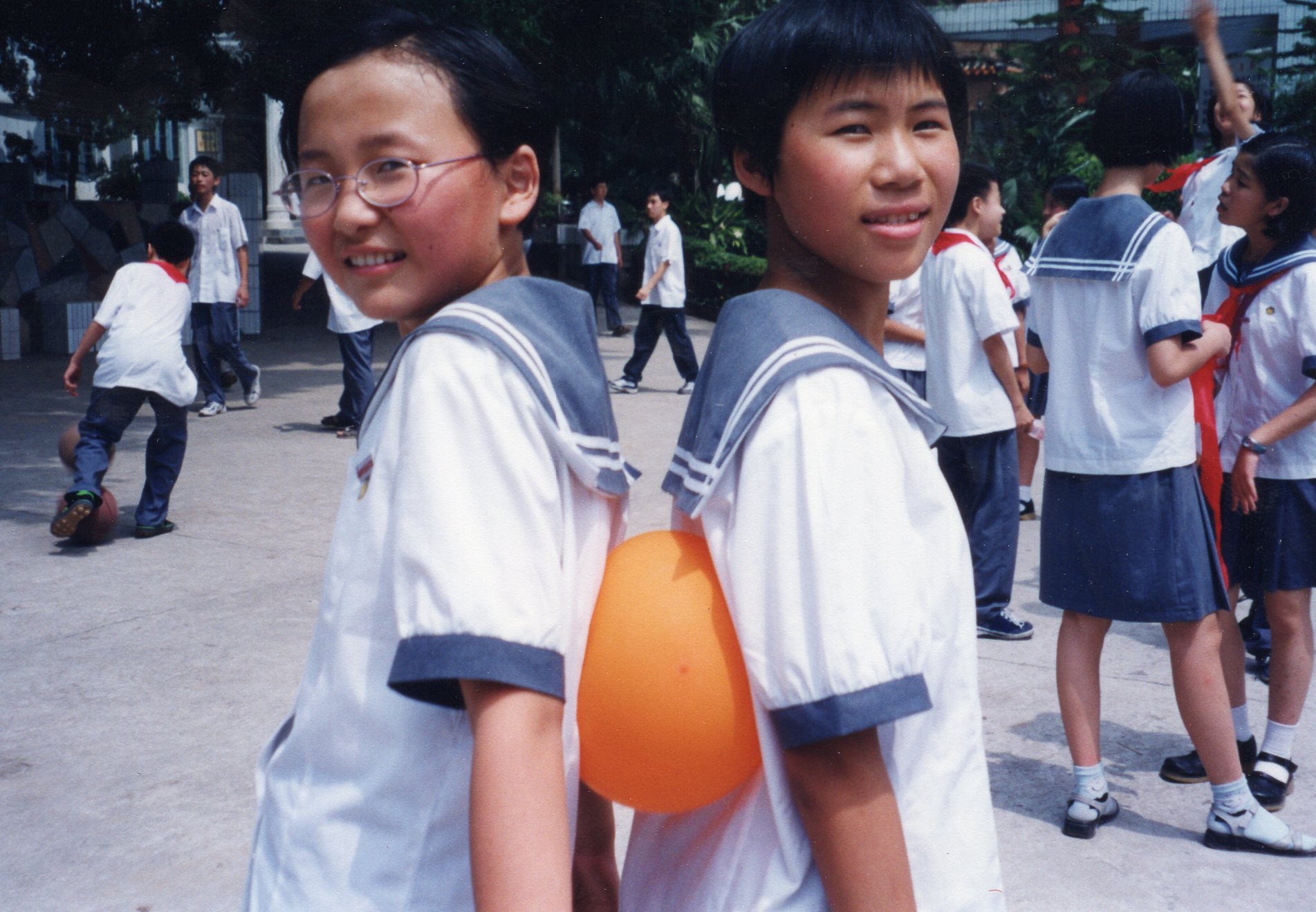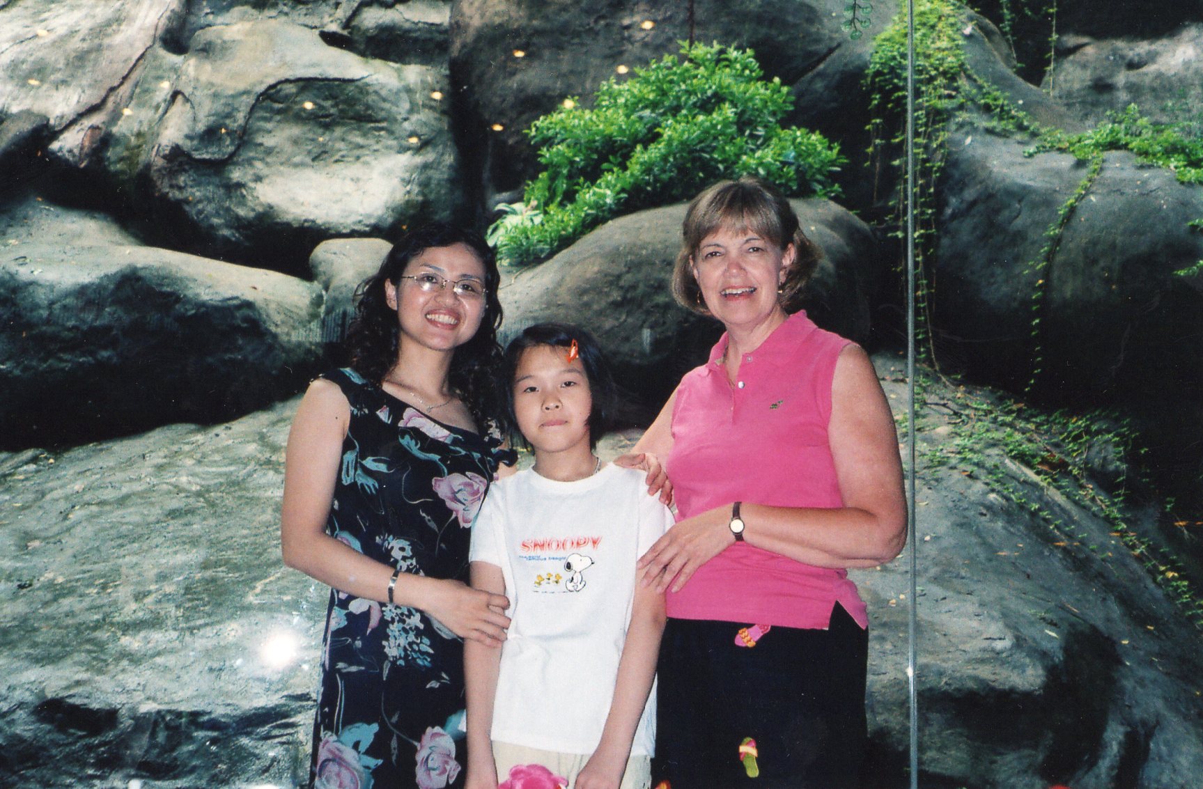 Photos from Jo Ann's time teaching at the Fuzhou Foreign Languages School in Fuzhou, China (2001–2002)—the school's first native English-speaking American teacher, known there as Miss Jones. The gallery includes the First Foreign Language Festival (December 2001), with Miss Fang's all-school celebration: songs, dances, and the O. Henry play The Policeman and the Anthem, performed by her spoken-English class at a packed local cinema.