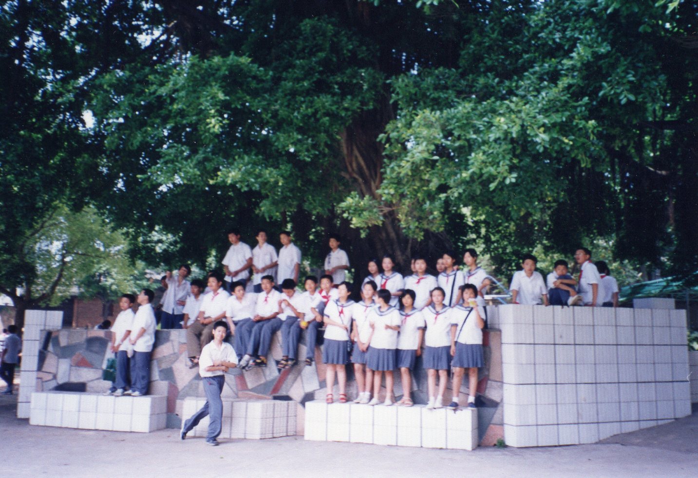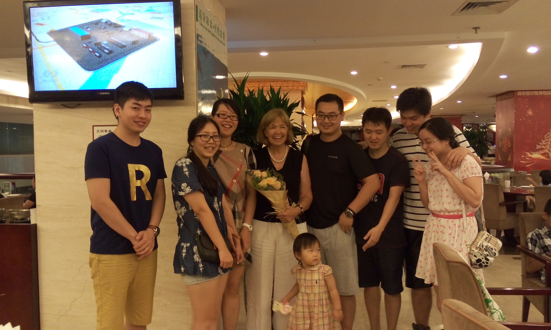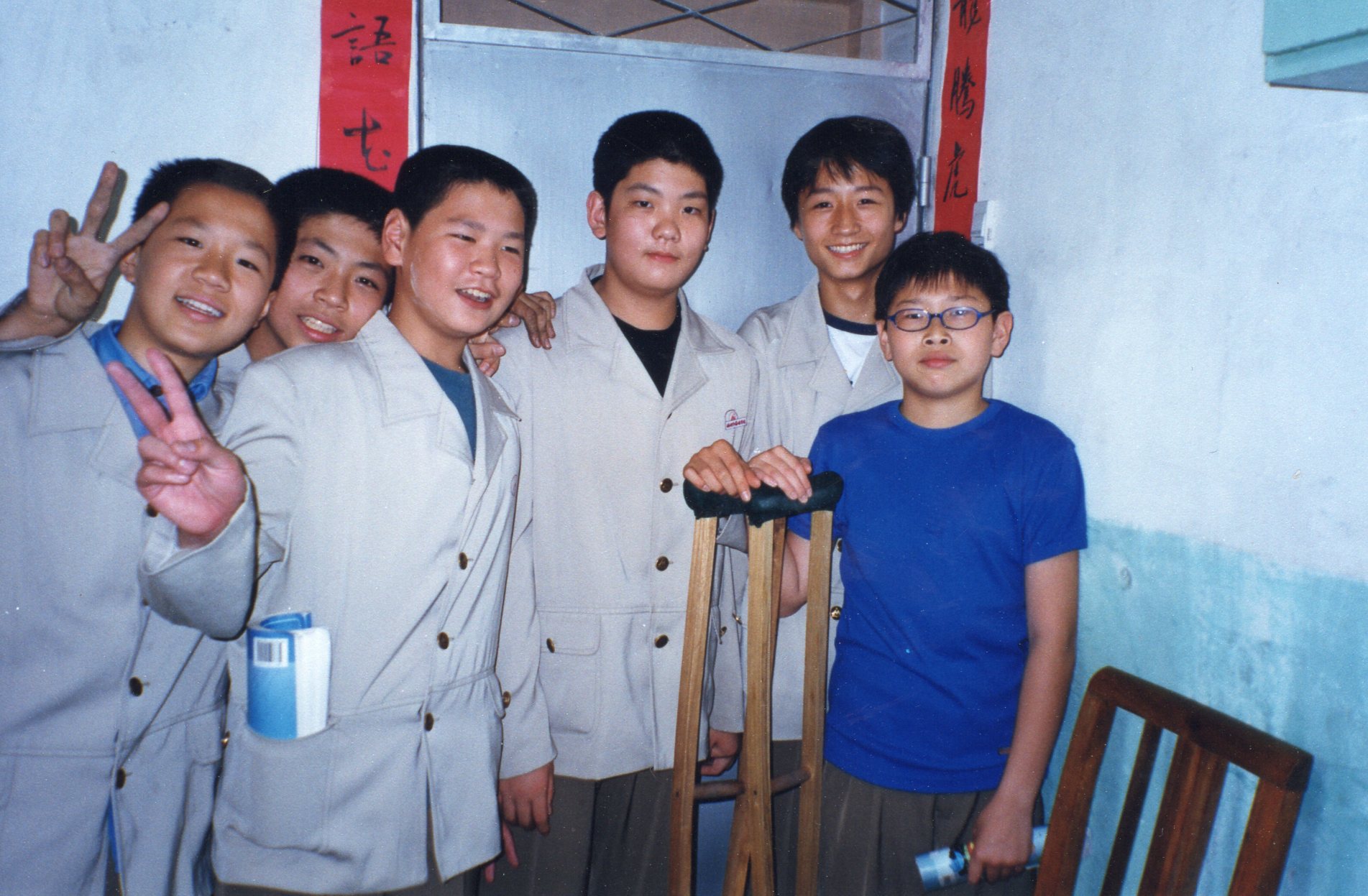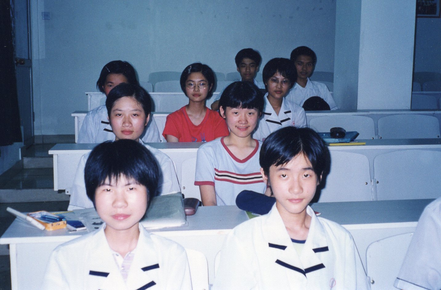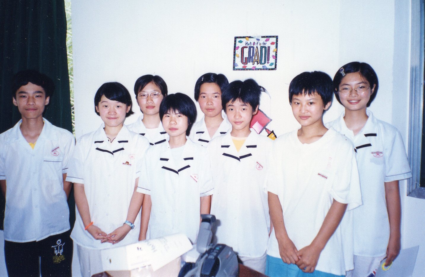 Photos from Jo Ann's time teaching at the Fuzhou Foreign Languages School in Fuzhou, China (2001–2002)—the school's first native English-speaking American teacher, known there as Miss Jones. The gallery includes the First Foreign Language Festival (December 2001), with Miss Fang's all-school celebration: songs, dances, and the O. Henry play The Policeman and the Anthem, performed by her spoken-English class at a packed local cinema.
