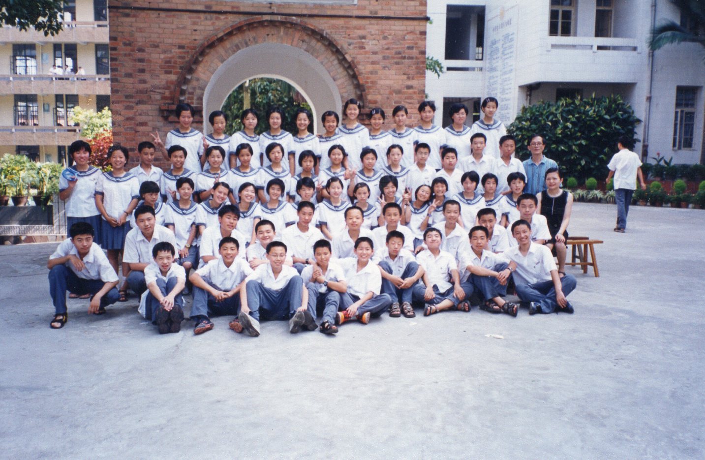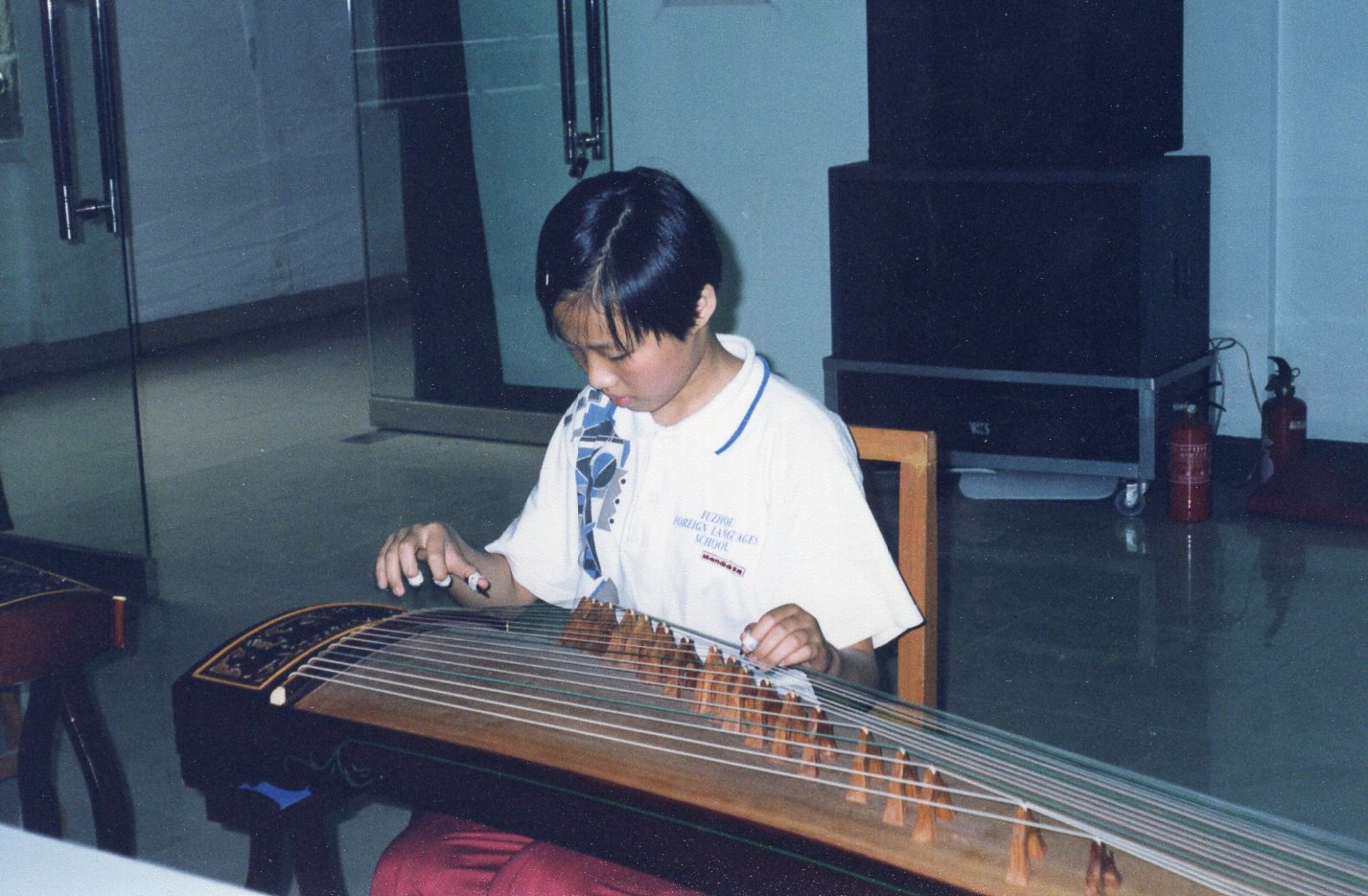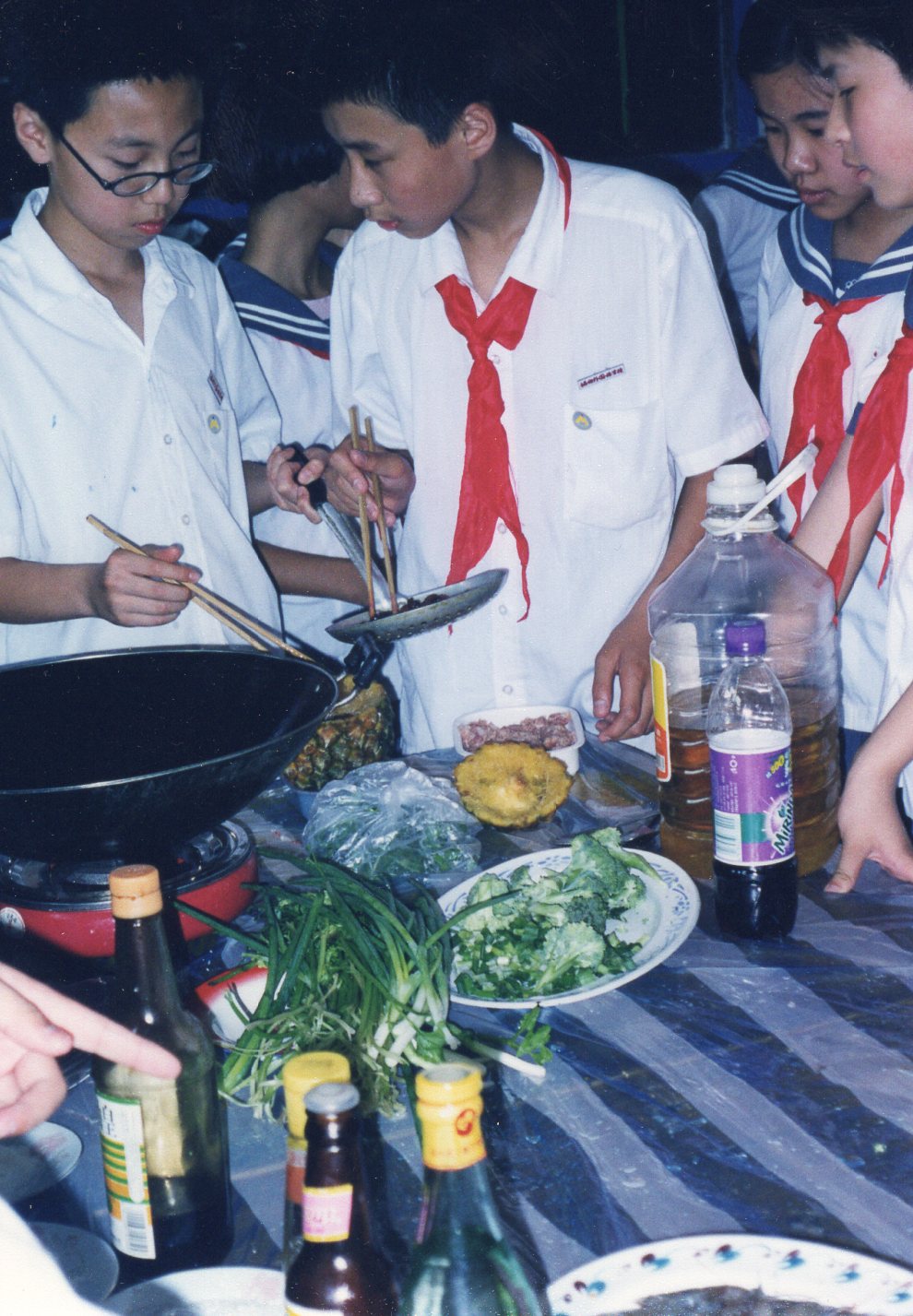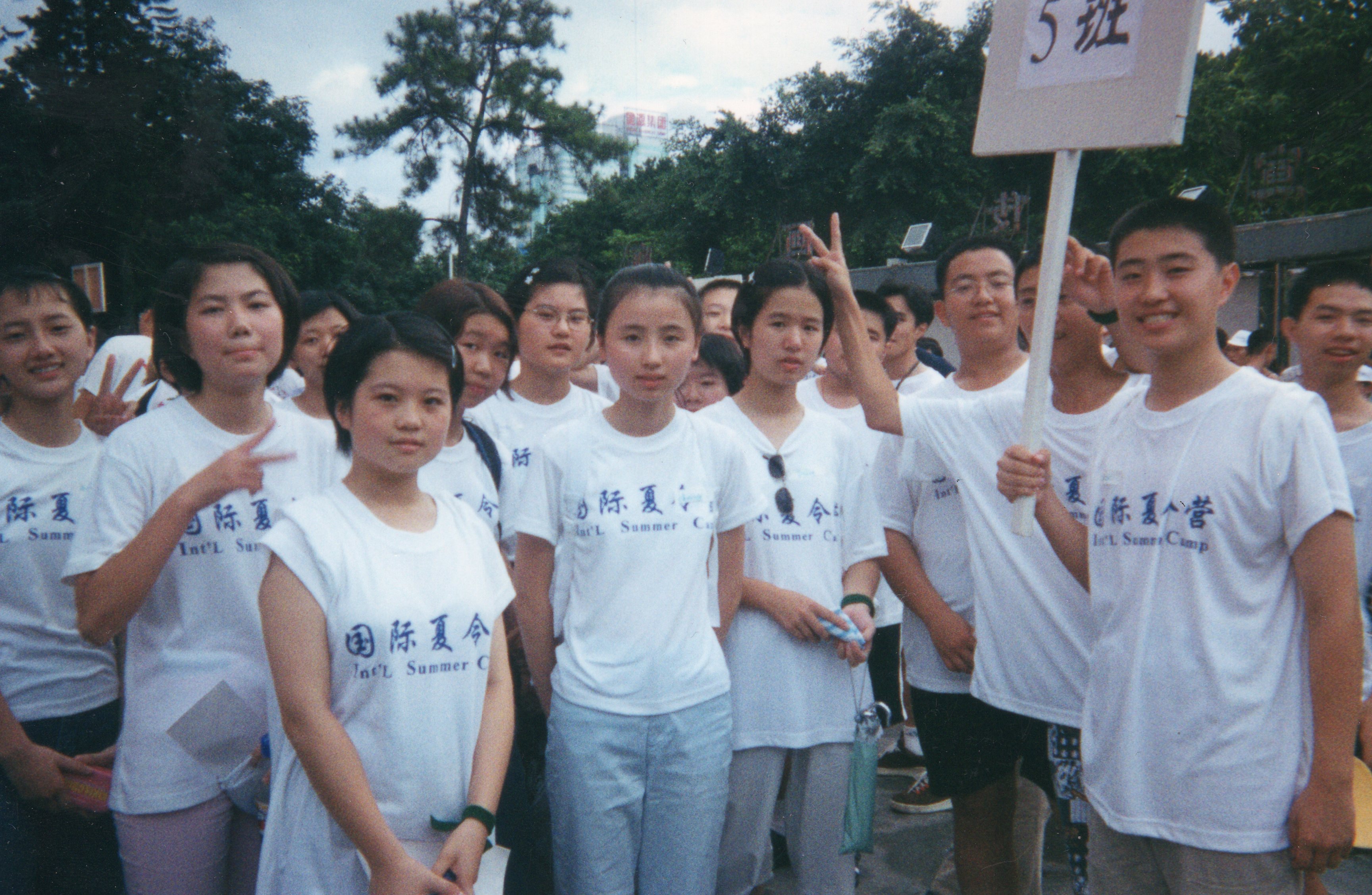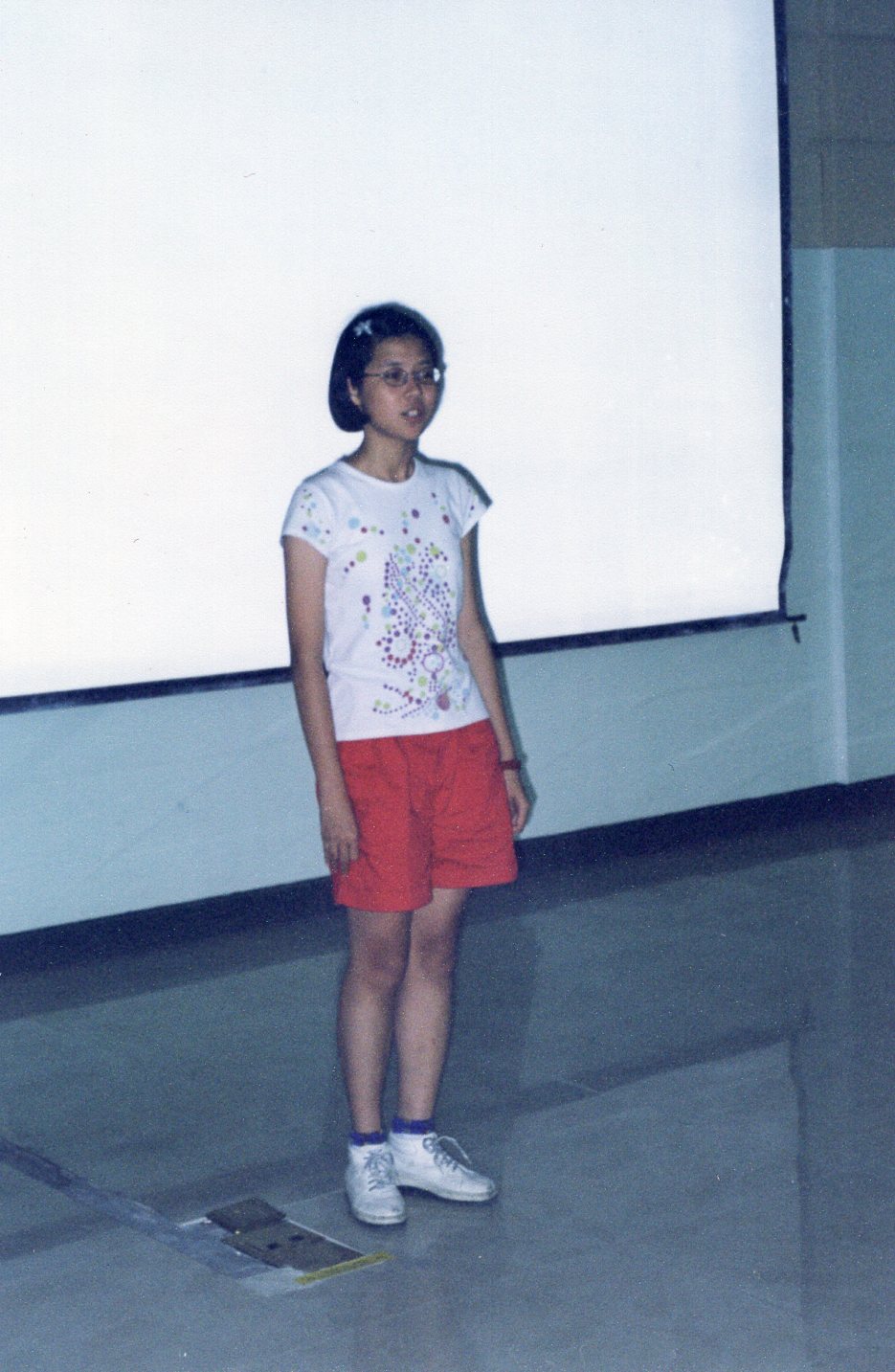 Photos from Jo Ann's time teaching at the Fuzhou Foreign Languages School in Fuzhou, China (2001–2002)—the school's first native English-speaking American teacher, known there as Miss Jones. The gallery includes the First Foreign Language Festival (December 2001), with Miss Fang's all-school celebration: songs, dances, and the O. Henry play The Policeman and the Anthem, performed by her spoken-English class at a packed local cinema.