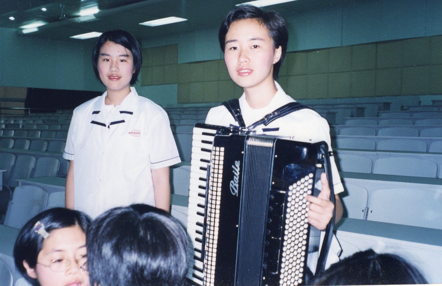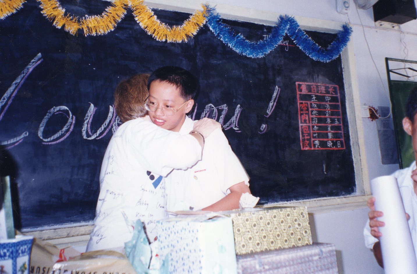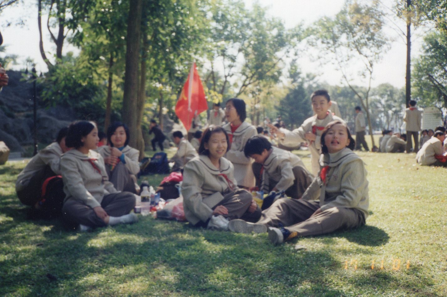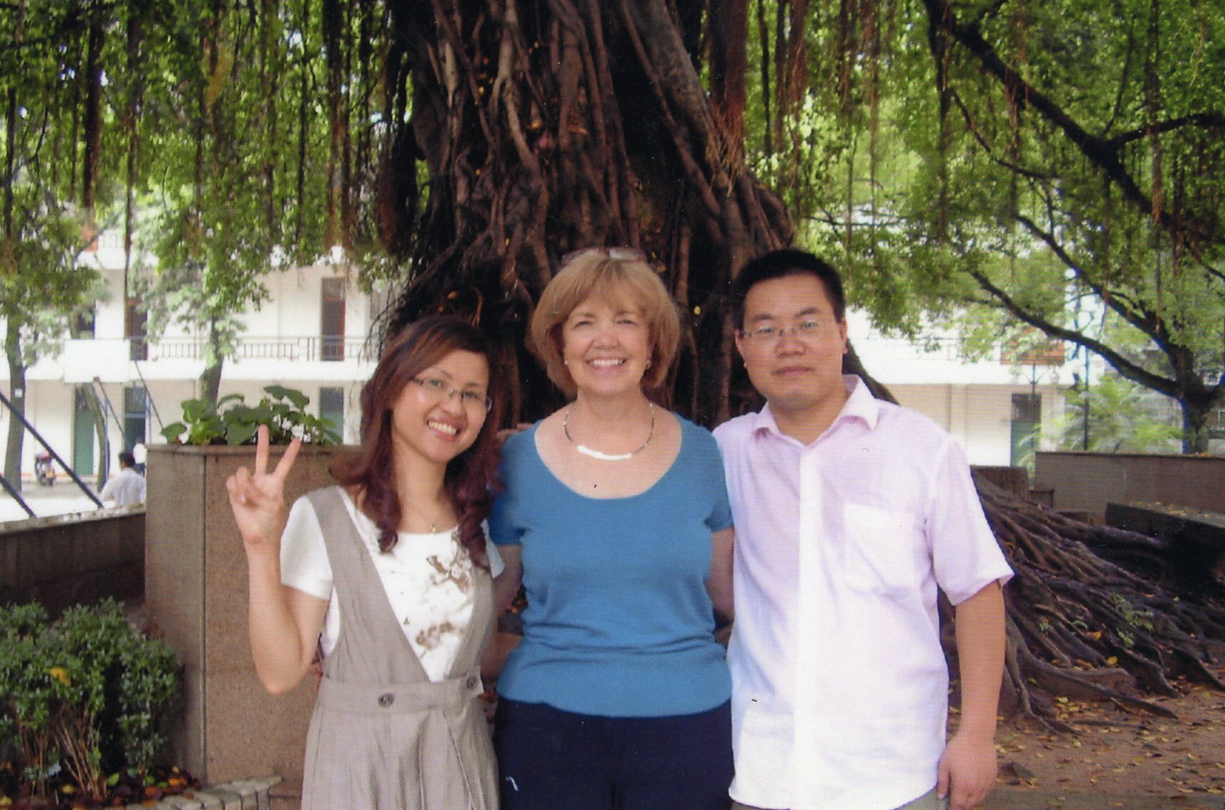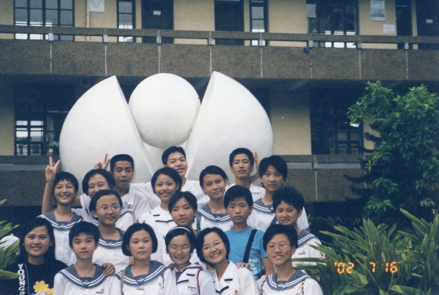 Photos from Jo Ann's time teaching at the Fuzhou Foreign Languages School in Fuzhou, China (2001–2002)—the school's first native English-speaking American teacher, known there as Miss Jones. The gallery includes the First Foreign Language Festival (December 2001), with Miss Fang's all-school celebration: songs, dances, and the O. Henry play The Policeman and the Anthem, performed by her spoken-English class at a packed local cinema.