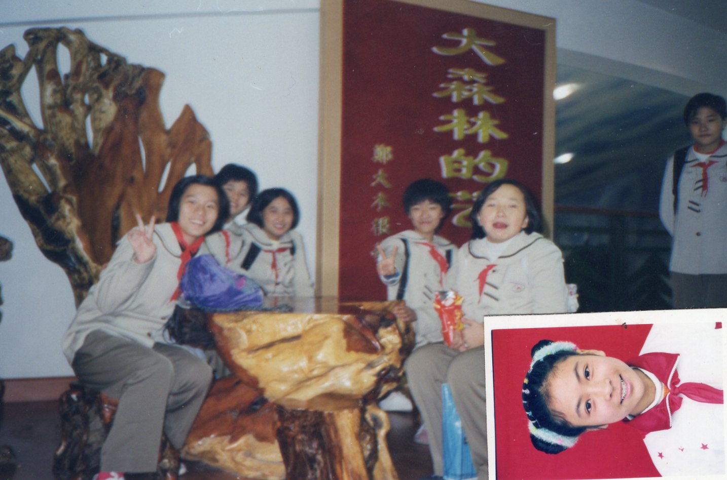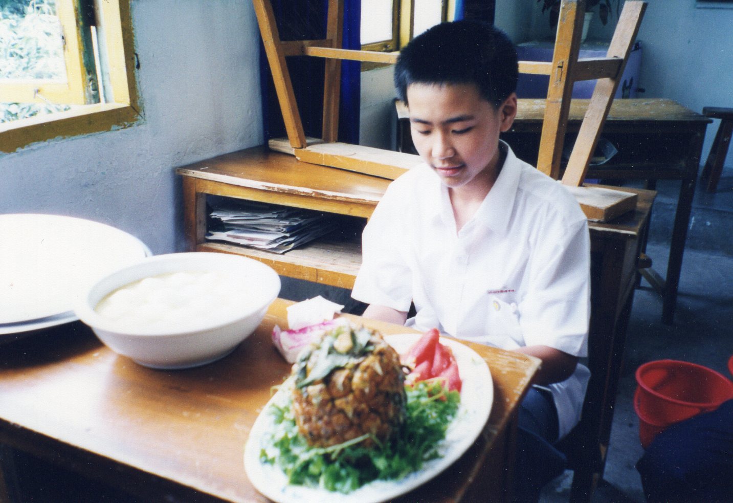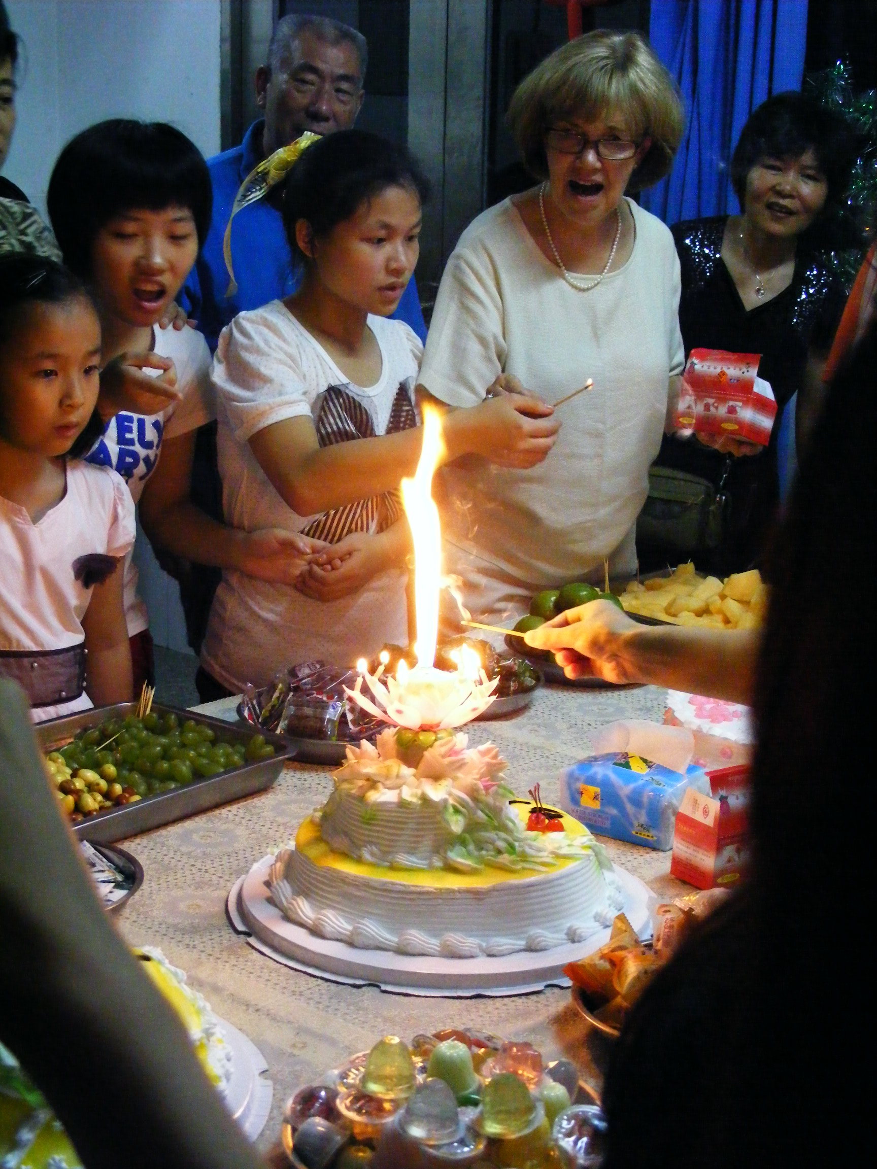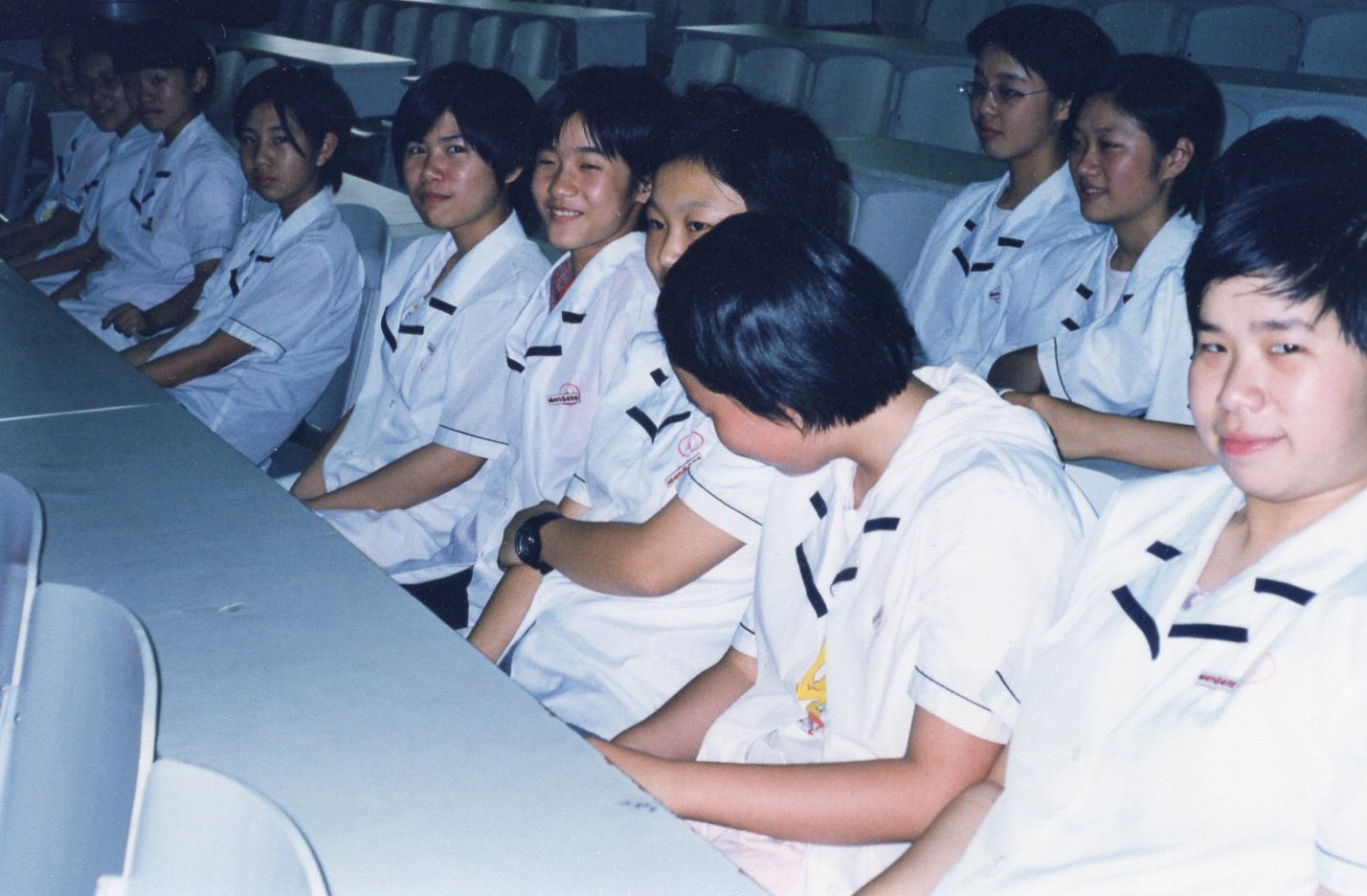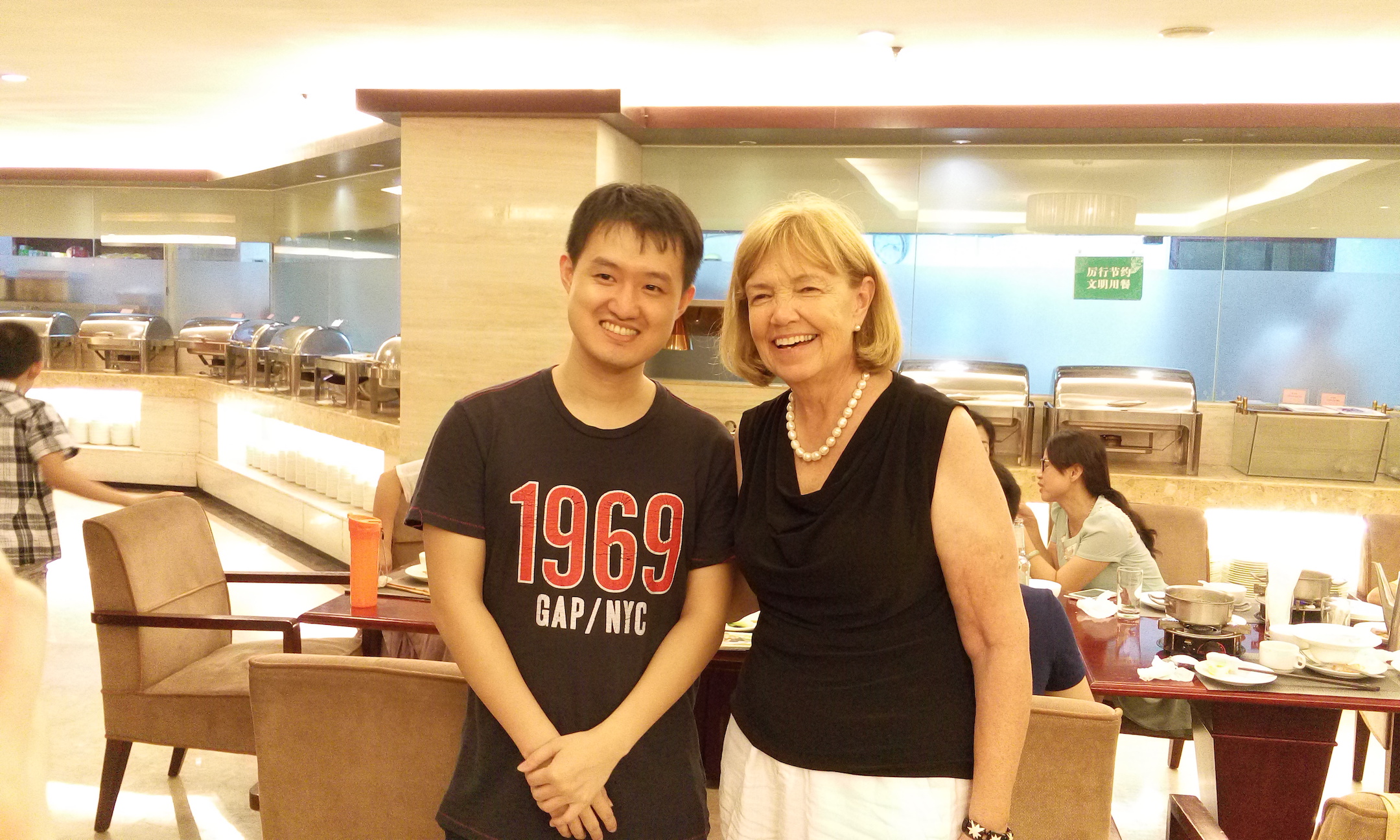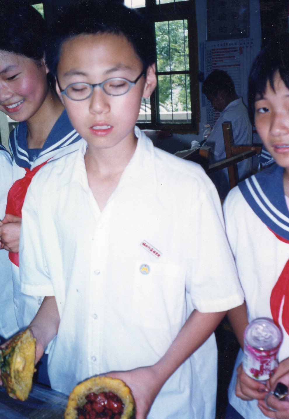 Photos from Jo Ann's time teaching at the Fuzhou Foreign Languages School in Fuzhou, China (2001–2002)—the school's first native English-speaking American teacher, known there as Miss Jones. The gallery includes the First Foreign Language Festival (December 2001), with Miss Fang's all-school celebration: songs, dances, and the O. Henry play The Policeman and the Anthem, performed by her spoken-English class at a packed local cinema.