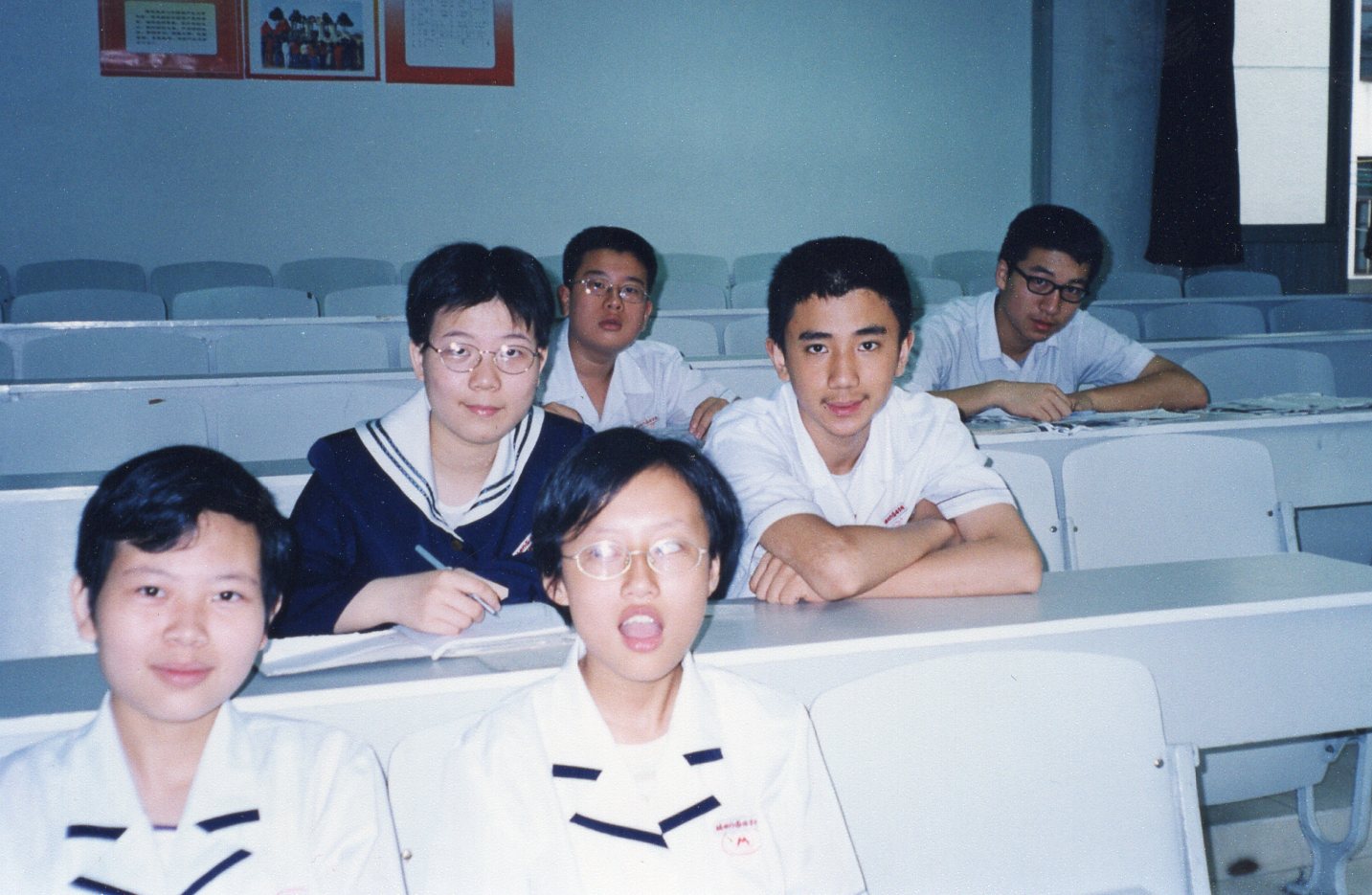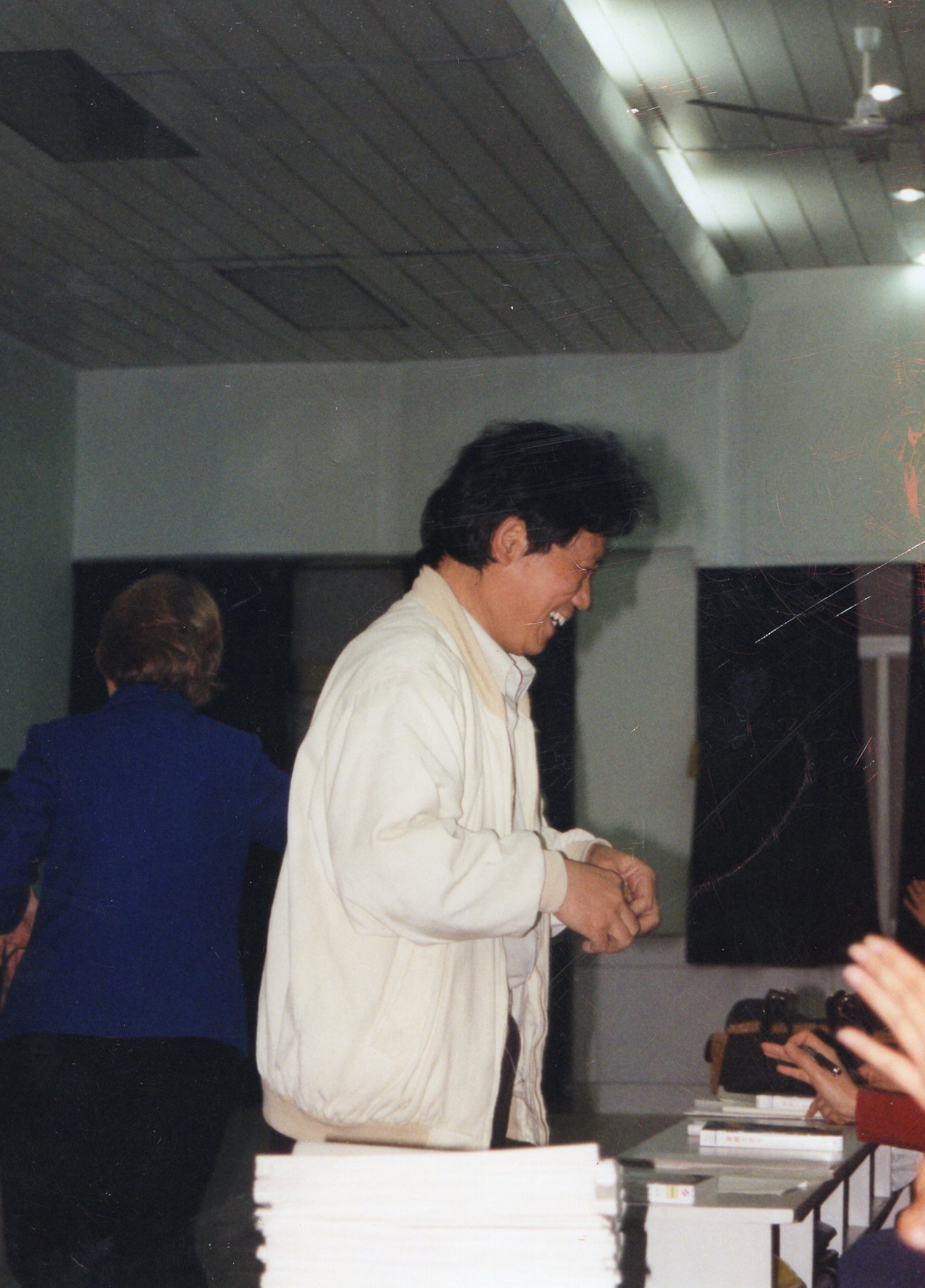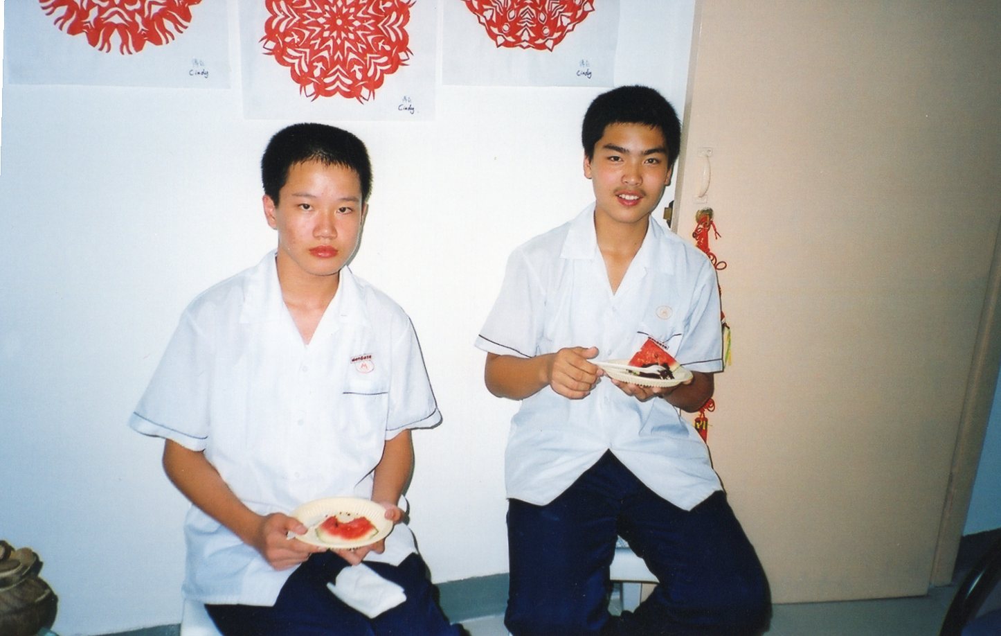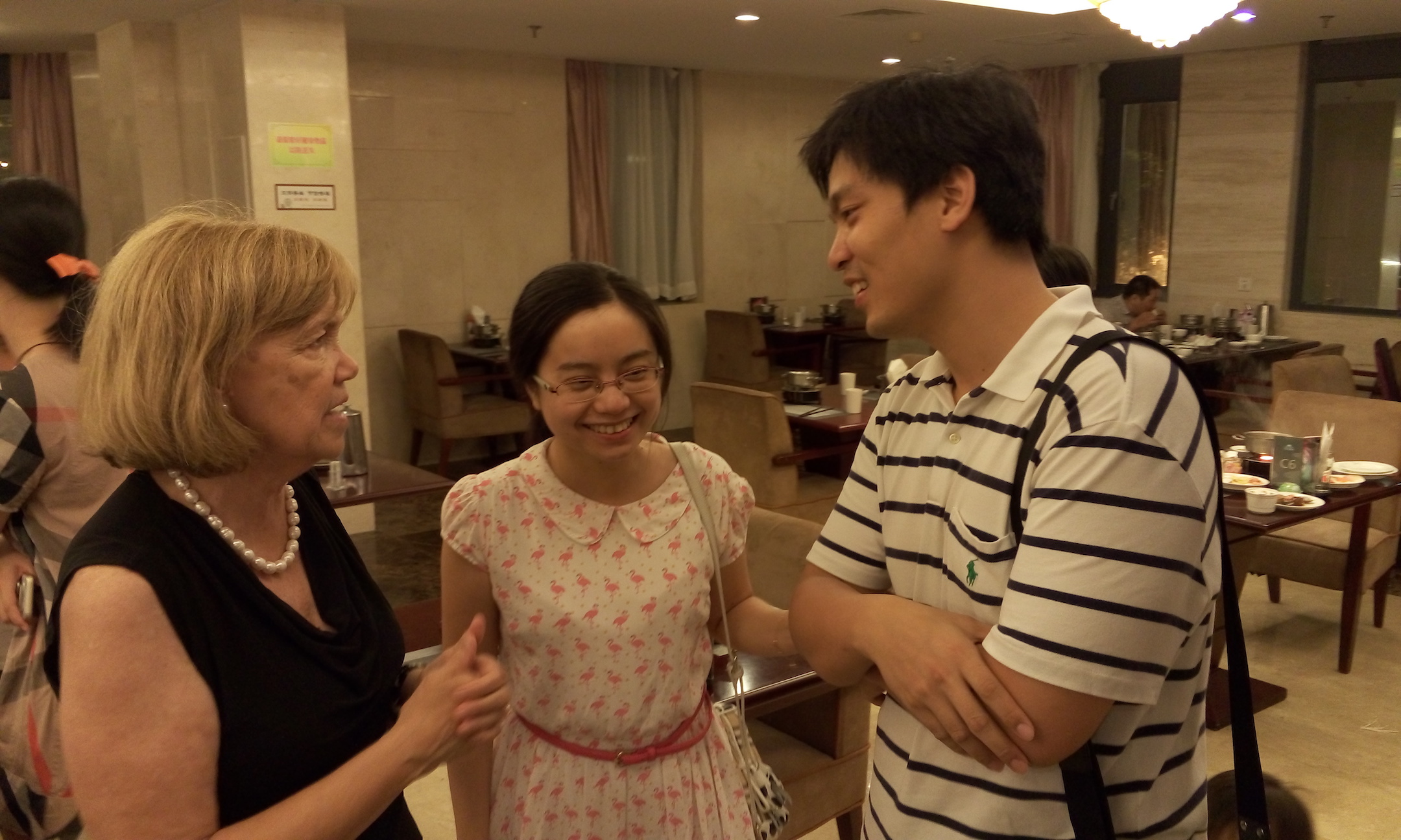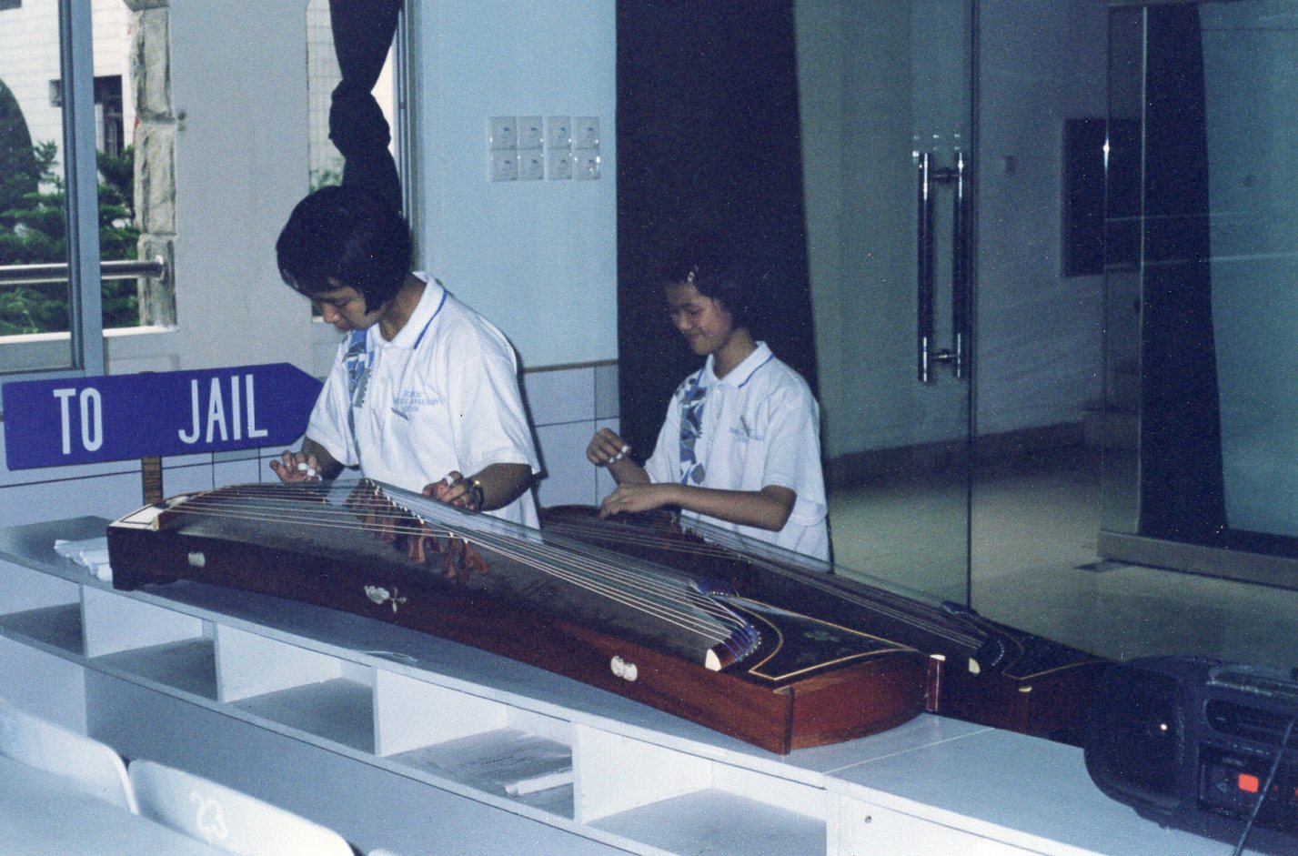 Photos from Jo Ann's time teaching at the Fuzhou Foreign Languages School in Fuzhou, China (2001–2002)—the school's first native English-speaking American teacher, known there as Miss Jones. The gallery includes the First Foreign Language Festival (December 2001), with Miss Fang's all-school celebration: songs, dances, and the O. Henry play The Policeman and the Anthem, performed by her spoken-English class at a packed local cinema.
