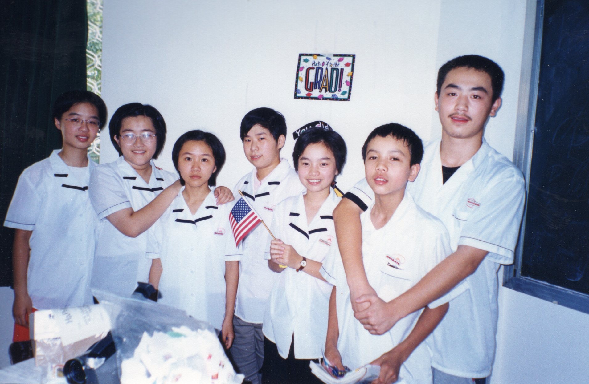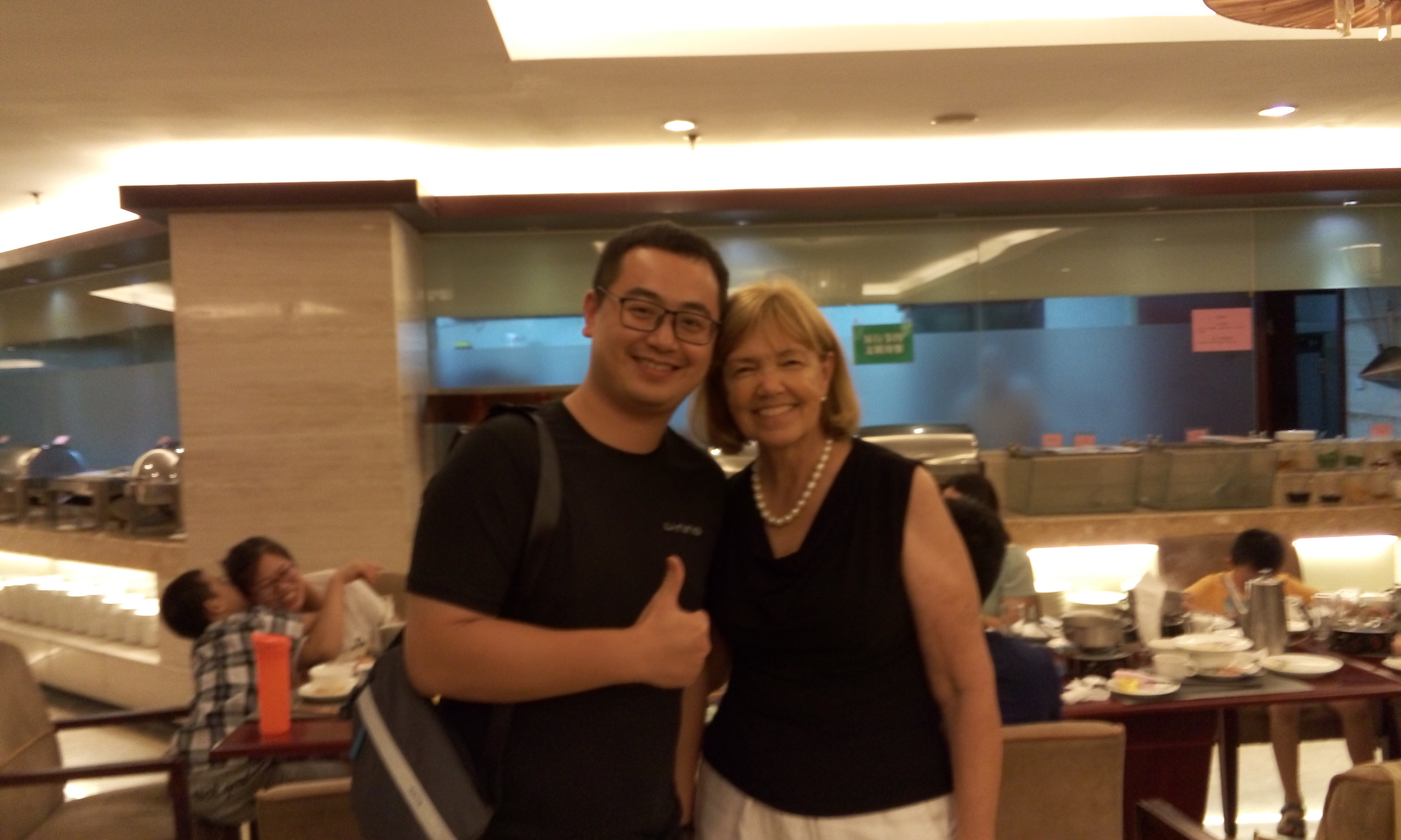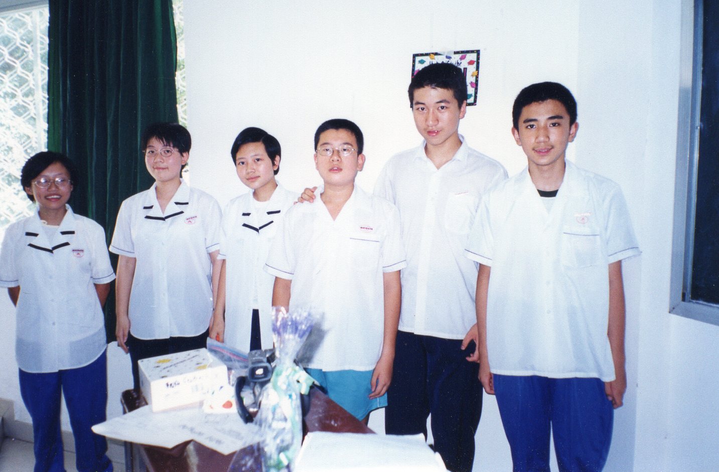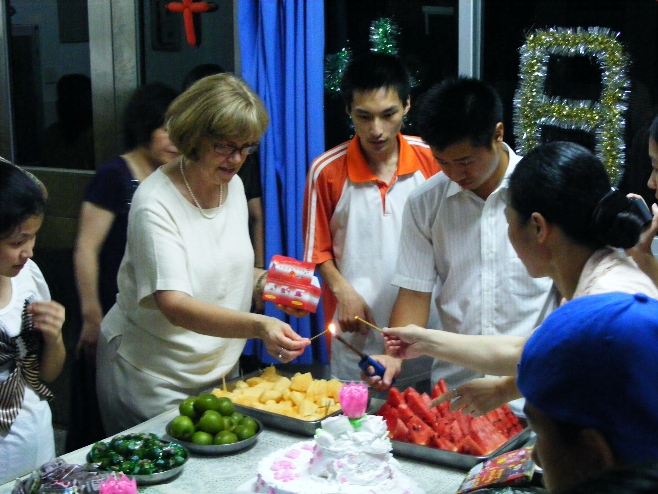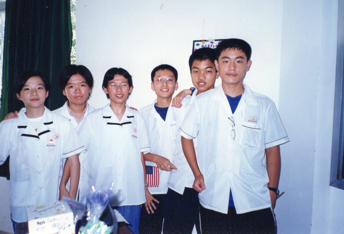 Photos from Jo Ann's time teaching at the Fuzhou Foreign Languages School in Fuzhou, China (2001–2002)—the school's first native English-speaking American teacher, known there as Miss Jones. The gallery includes the First Foreign Language Festival (December 2001), with Miss Fang's all-school celebration: songs, dances, and the O. Henry play The Policeman and the Anthem, performed by her spoken-English class at a packed local cinema.