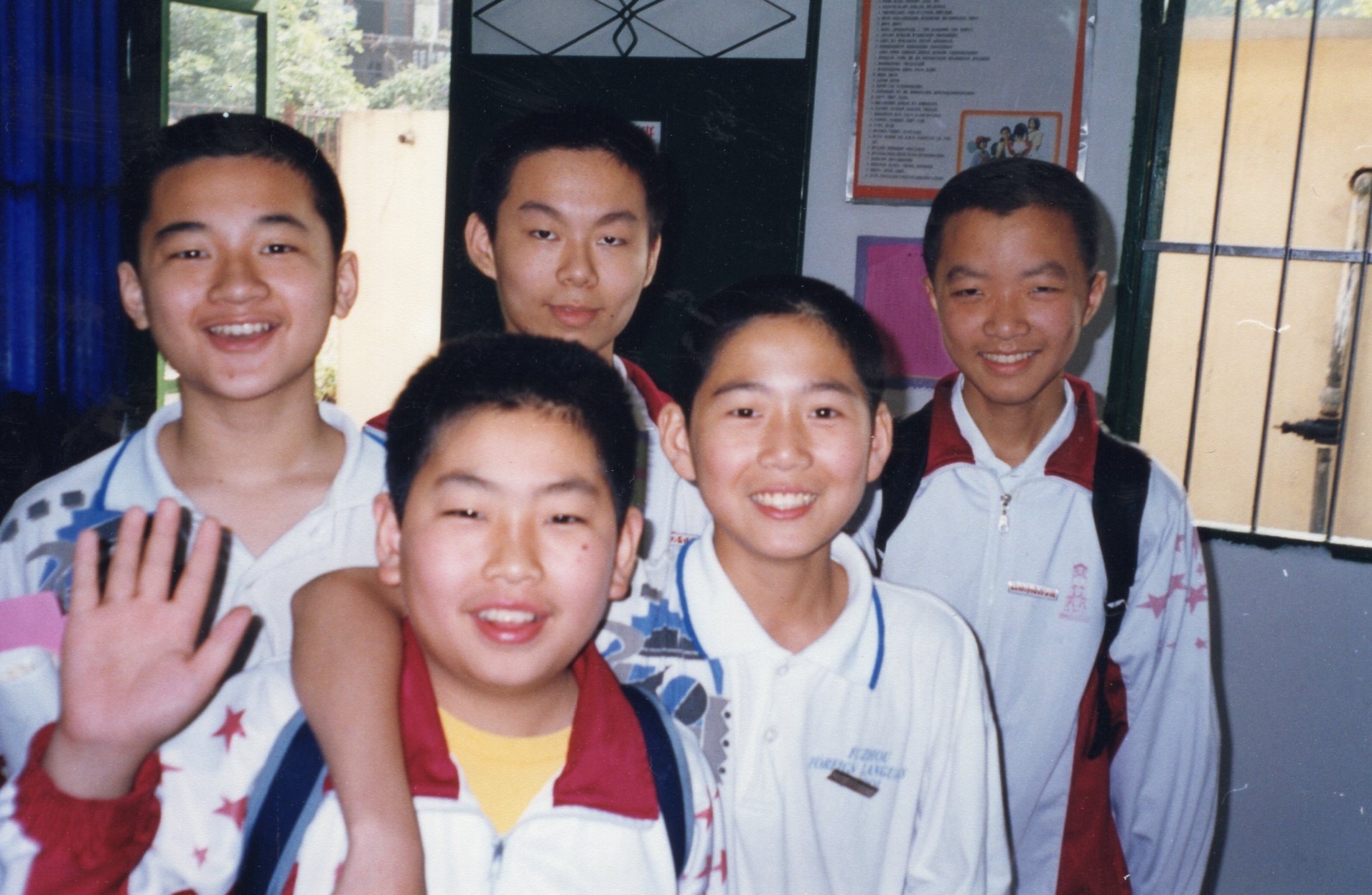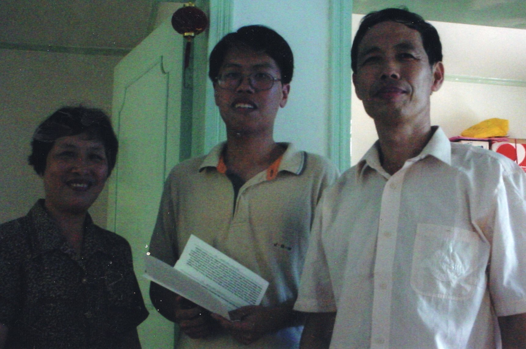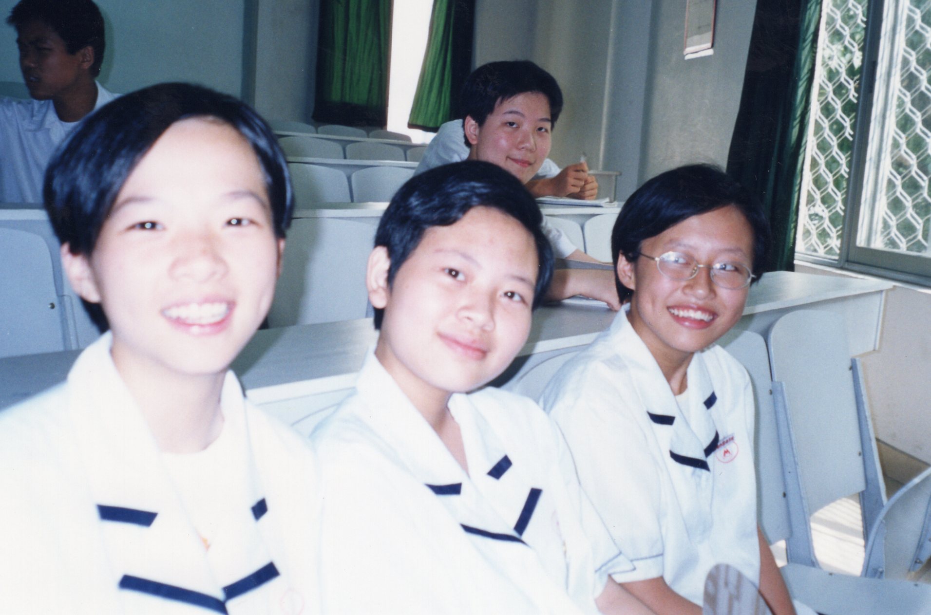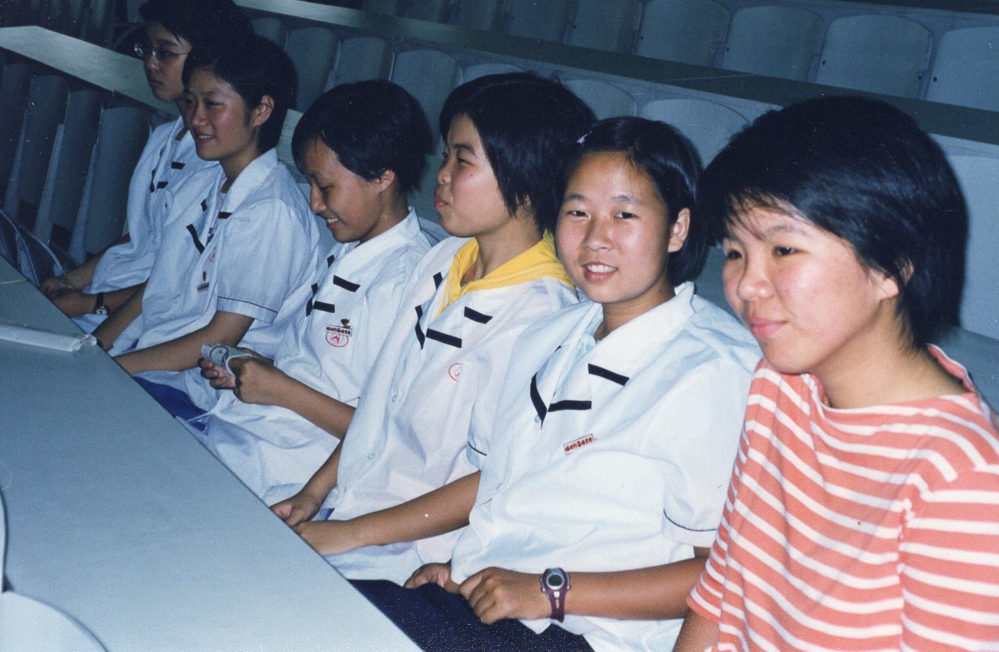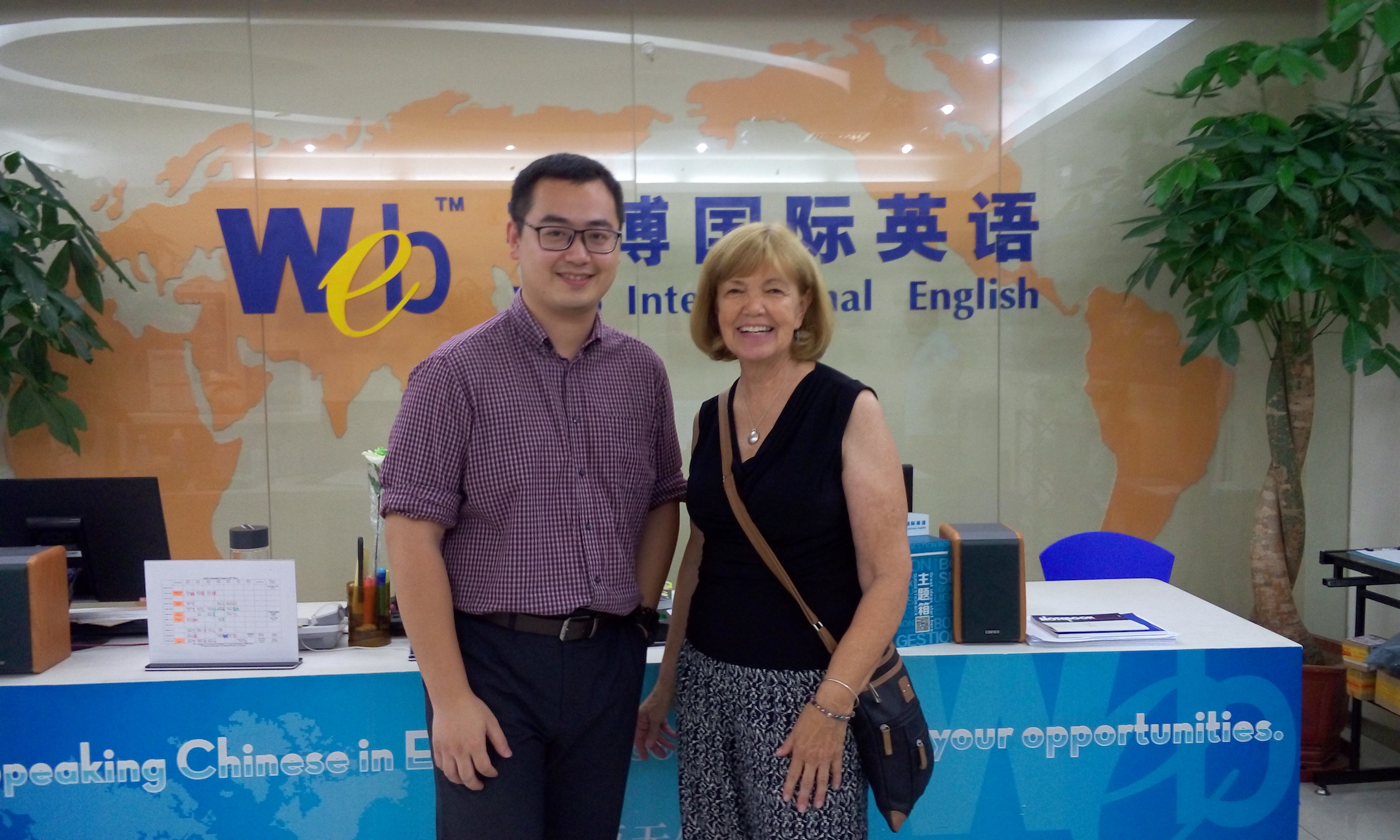 Photos from Jo Ann's time teaching at the Fuzhou Foreign Languages School in Fuzhou, China (2001–2002)—the school's first native English-speaking American teacher, known there as Miss Jones. The gallery includes the First Foreign Language Festival (December 2001), with Miss Fang's all-school celebration: songs, dances, and the O. Henry play The Policeman and the Anthem, performed by her spoken-English class at a packed local cinema.